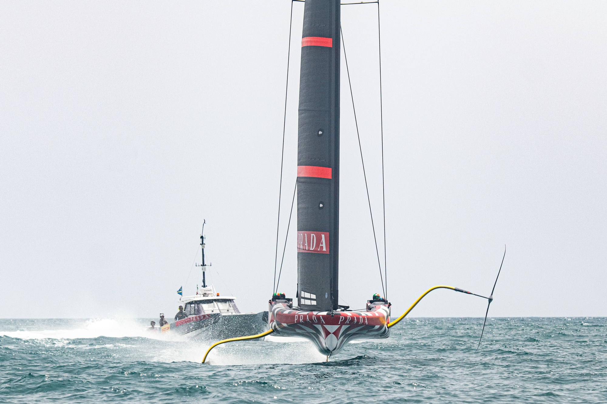 Umberto Molineris and Andrea Tesei were earning their money, desperate to try and keep the Italian LEQ12 up on the foils whilst the brilliantly professional Italian Chase Boat team provided the power to tow the yacht up time and again – every flight was towed.