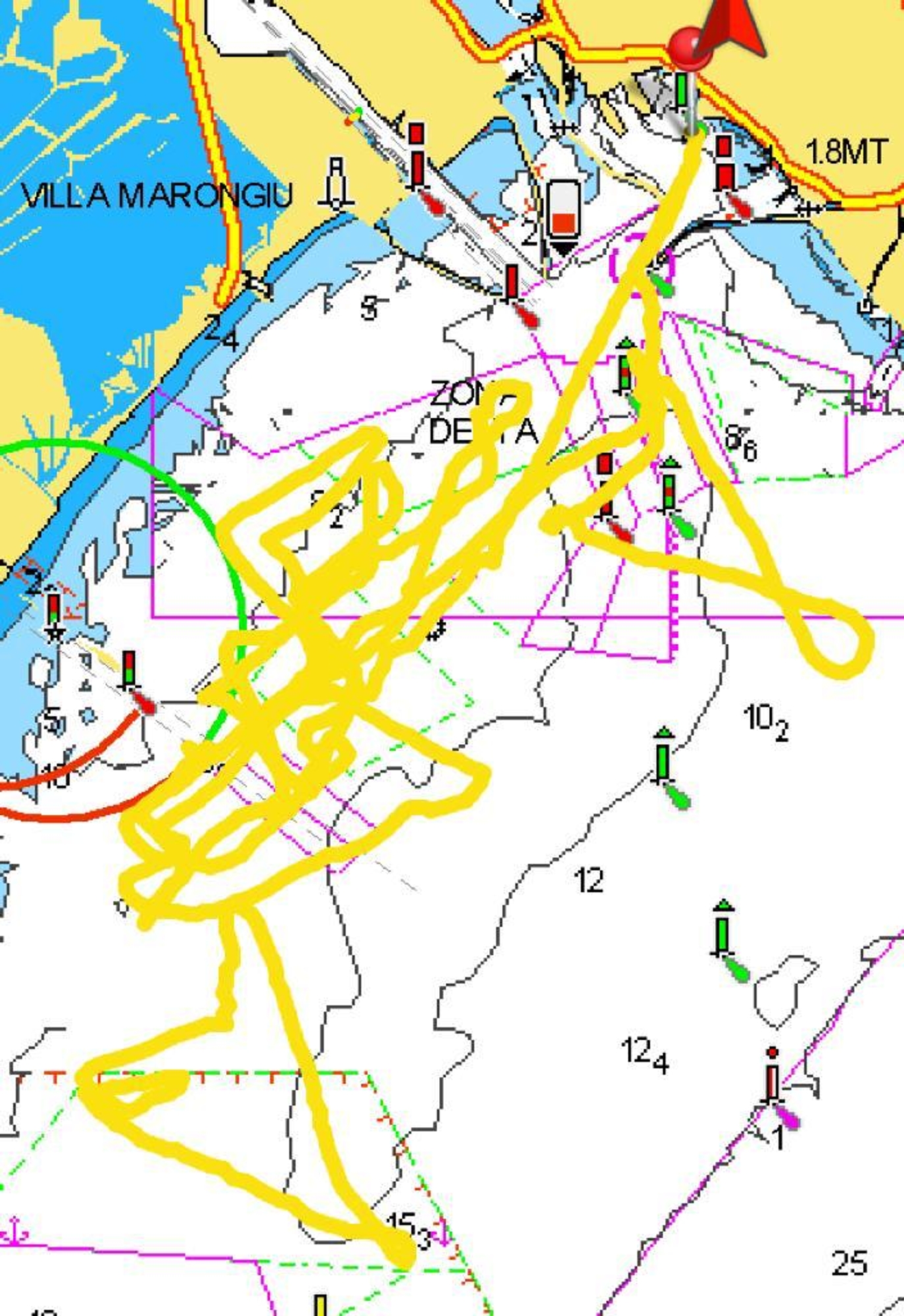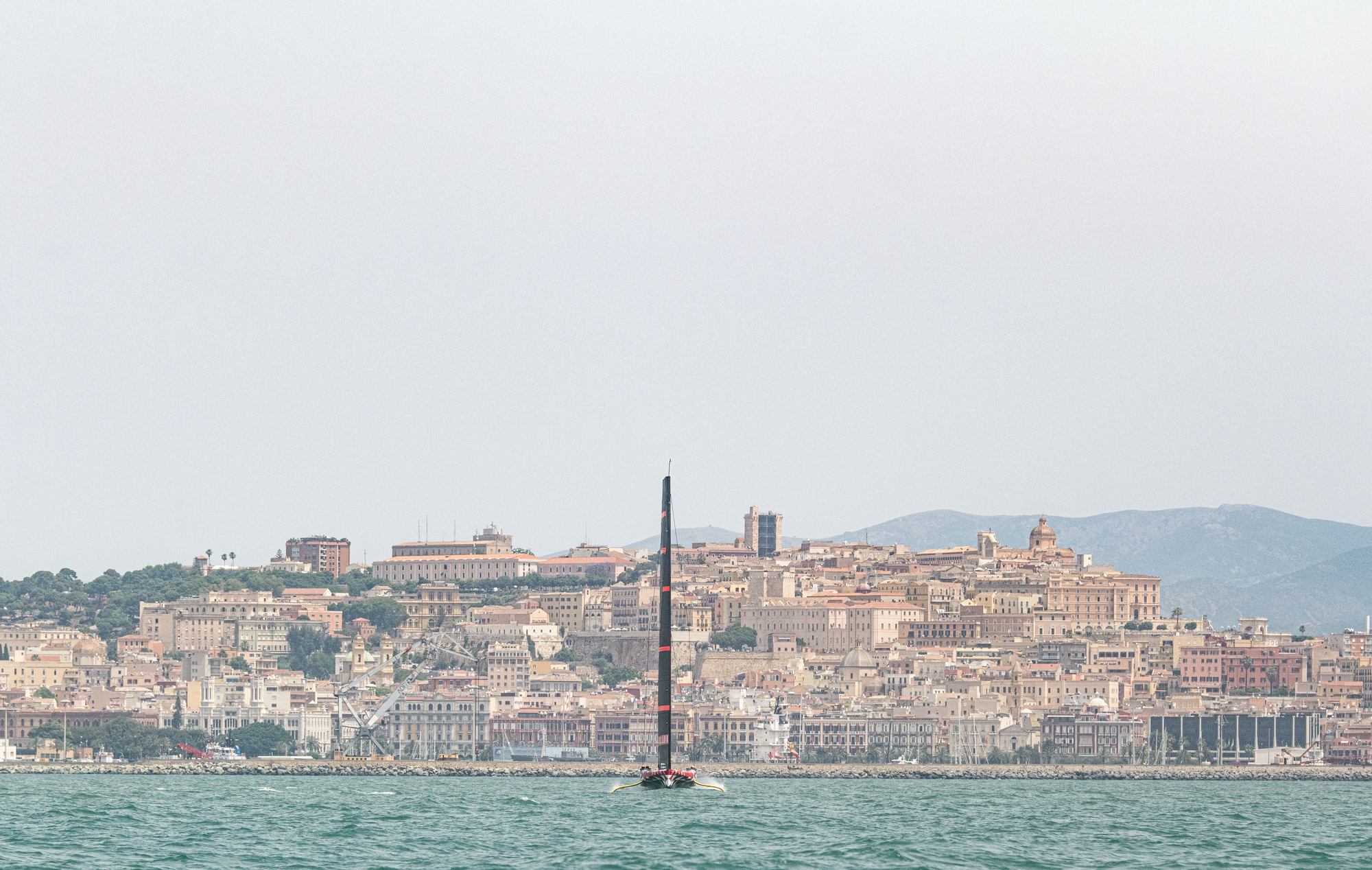 Towards Sarroch the light air looked to be more consistent, and a series of tacks has been observed before the pressure died and the LEQ12 was towed back further inshore towards Cagliari. Once some air was encountered, the LEQ12 was released from towline and sailed downwind completing a series of gybes, looking less dry and successful from starboard to portside tack.