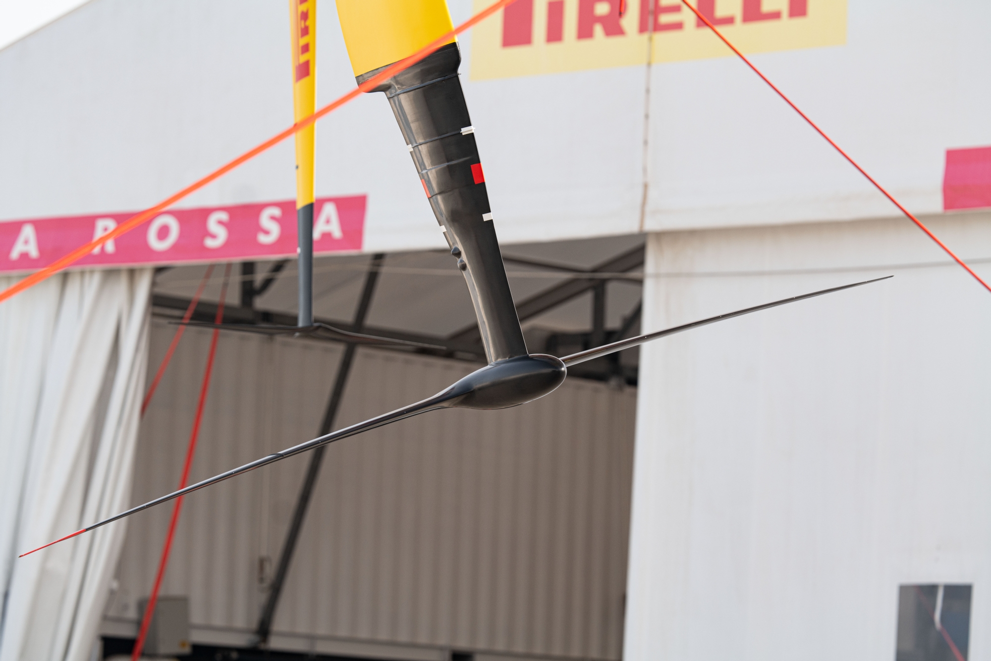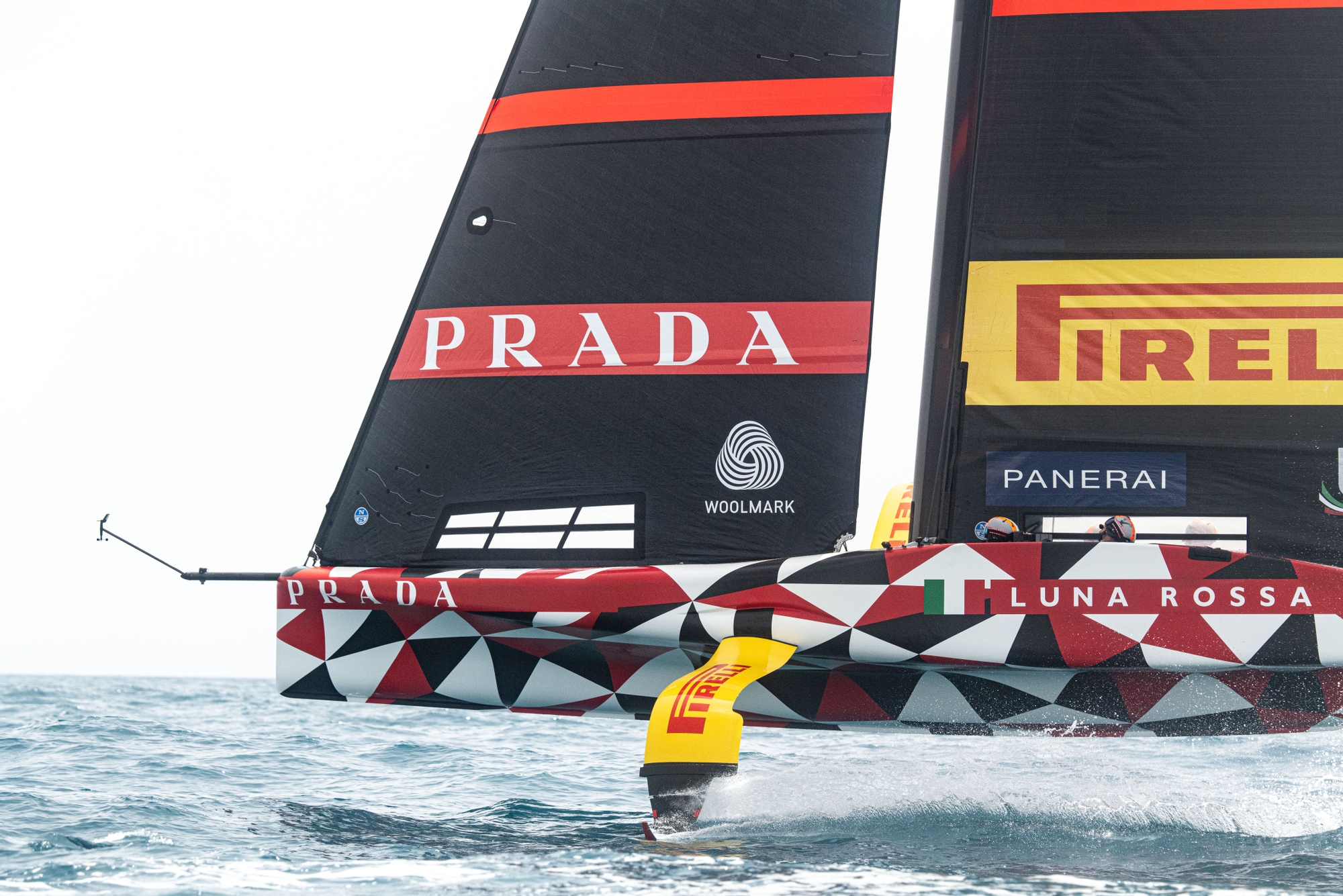 One thing that was highly noticeable was how comfortable the team looked upwind when flying on their beautiful long-span anhedral V3 port wing on starboard tack. The stability in a straight-line was next level and the Flight Controllers could gently ease the hull lower to the surface and raise in an instant. However, the transitions upwind between the V3 foil on the port side and the V1 on the starboard side were tricky – sea state definitely had a hand in this – but getting the deeper tacking angle and then coaxing up on the V1 foil was a tall ask for Francesco Bruni and Marco Gradoni on the wheels.
