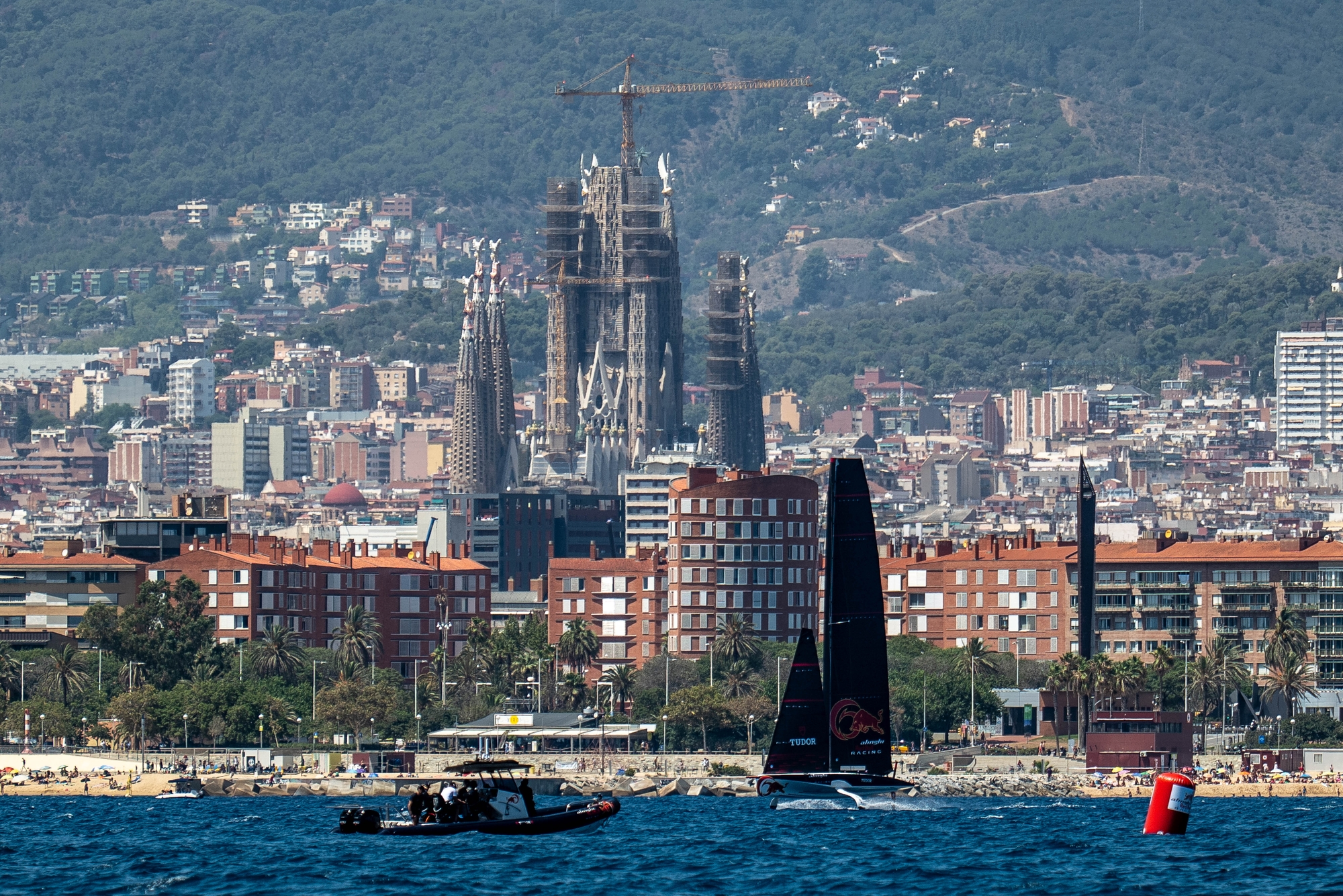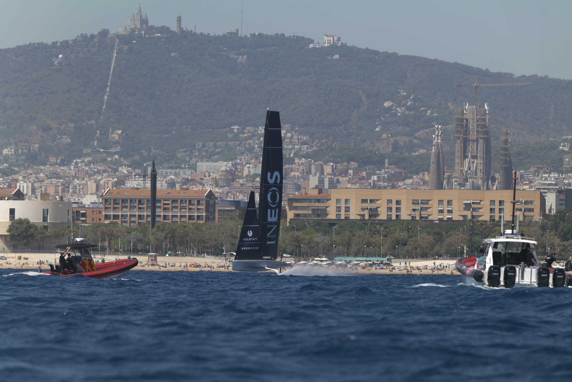 Heading over to the NYYC American Magic and Luna Rossa Prada Pirelli course, we landed into a Tom Slingsby and Paul Goodison masterclass in their fourth race as they lead the Italians by a distance. In the conditions, ‘Magic’ looked almost unbeatable with the sailors exerting incredible pitch control and their customary bow down/windward heel to flat orientation. Around the windward mark, post the rapid bear-away, it was noticeable the tiny tweaks that the trimmers were exerting on the mainsail, fanning it consistently with the waves and really powering away. Hugely impressive stuff from the Americans who more than fulfilled their top-billing in many people’s eyes. One to watch in Vilanova i La Geltrú for sure.