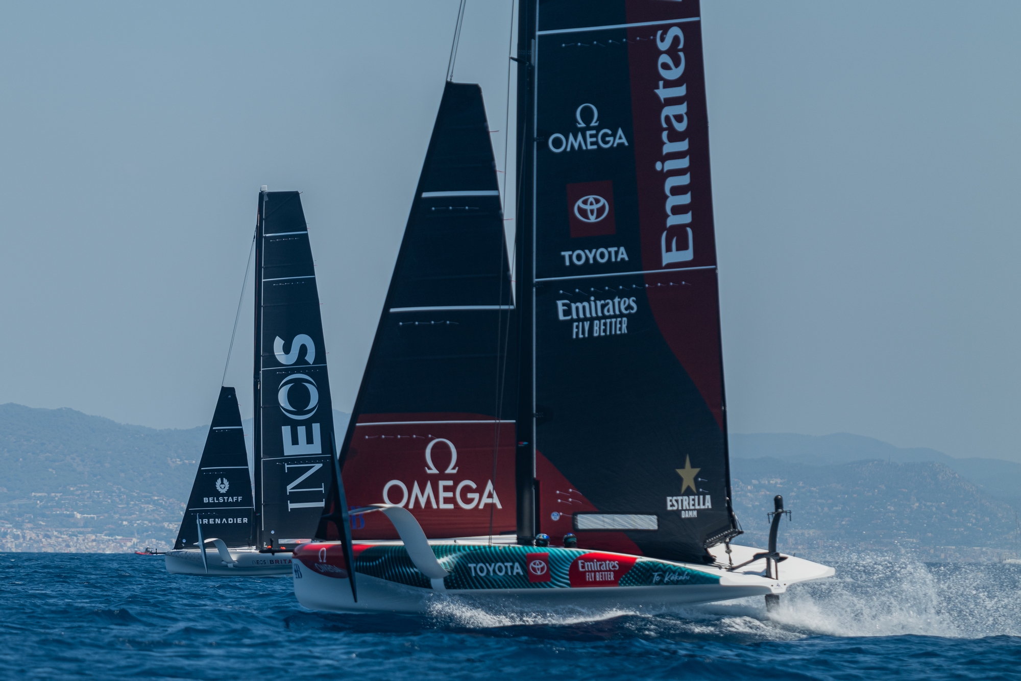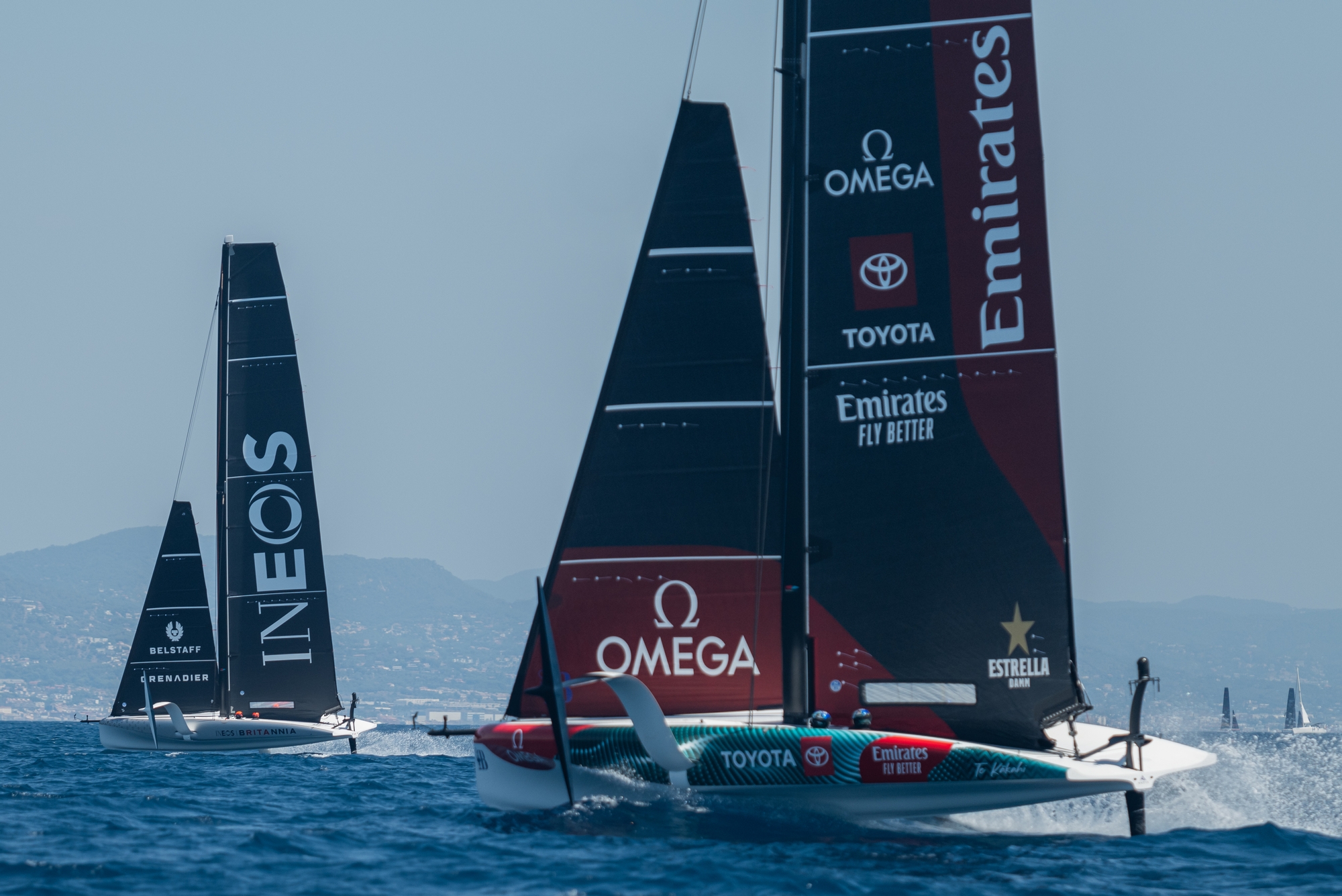 With the agreement of the teams, a three-day section of their training schedules has been carved out to allow the organisers, the television companies and technology suppliers the chance to test their equipment and protocols ahead of the first Preliminary Regatta in Vilanova i La Geltrú in September. It began on Thursday afternoon with Emirates Team New Zealand and INEOS Britannia doing a short session with what Giles Scott described as “loose line-ups” in the late afternoon to dial in their onboard telemetry and continued today (Friday) with Luna Rossa Prada Pirelli and NYYC American Magic joining the programme.