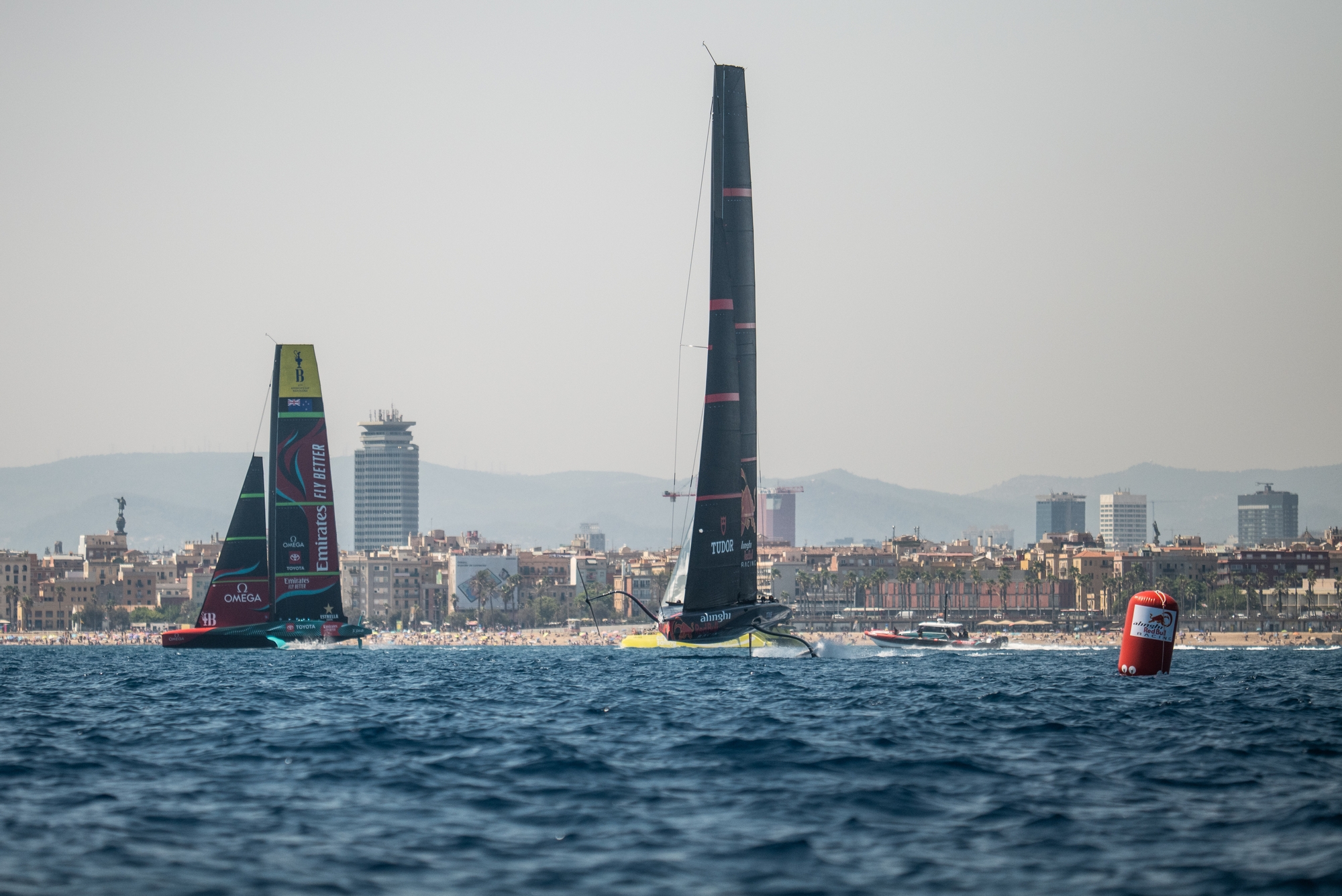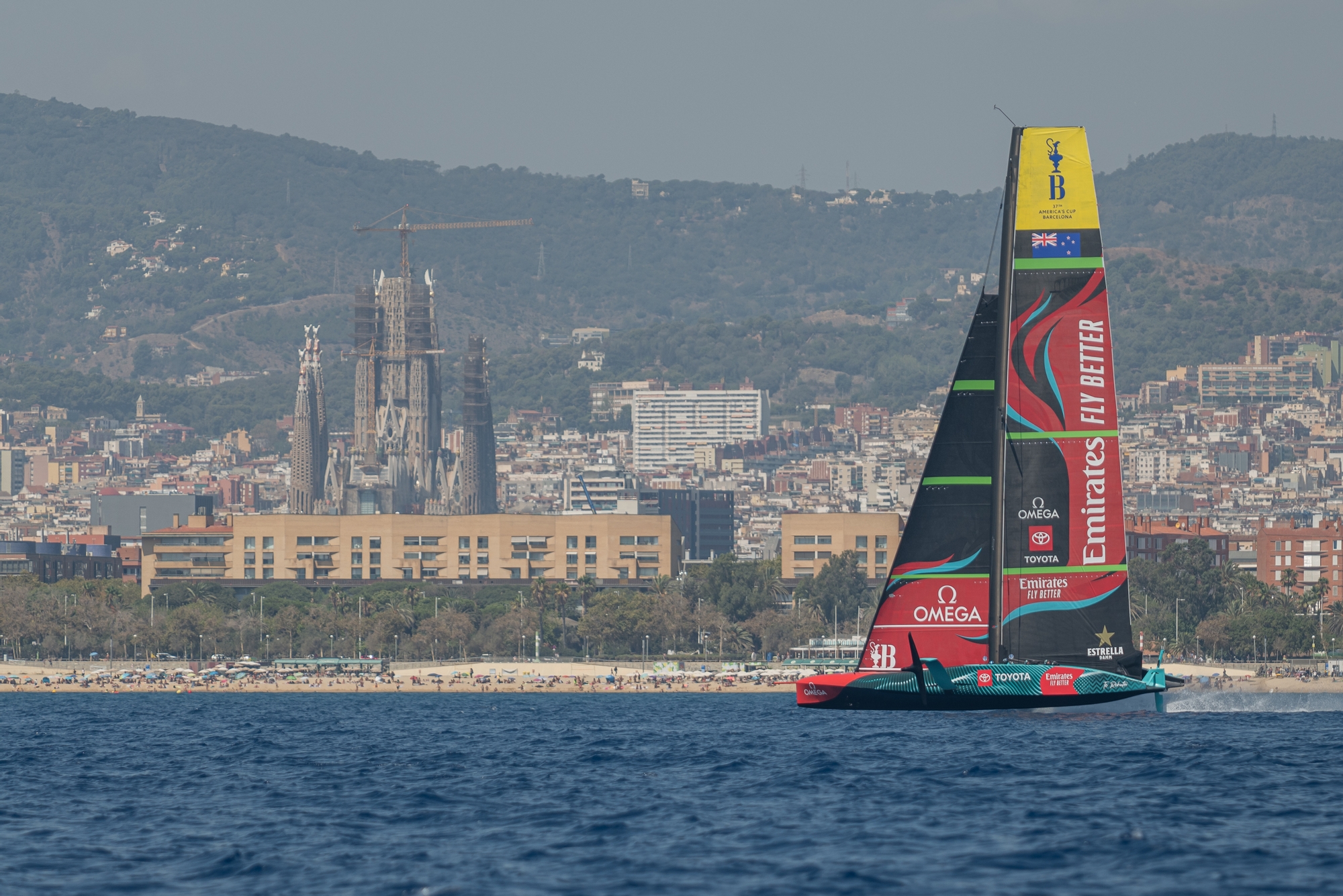 Shimmering in the heat, the Barcelona cityscape was the perfect backdrop for a perfect day on the water for three America’s Cup teams all pushing hard to find the ‘edges’ and eke performance. Two AC75’s and two AC40’s gave the beachgoers a hell of a spectacle with the Swiss, New Zealand and American teams close to the shore showing devastating speed and power as the Garbi thermal from the south delivered flat water and 10-14 knots of building and fading breeze.