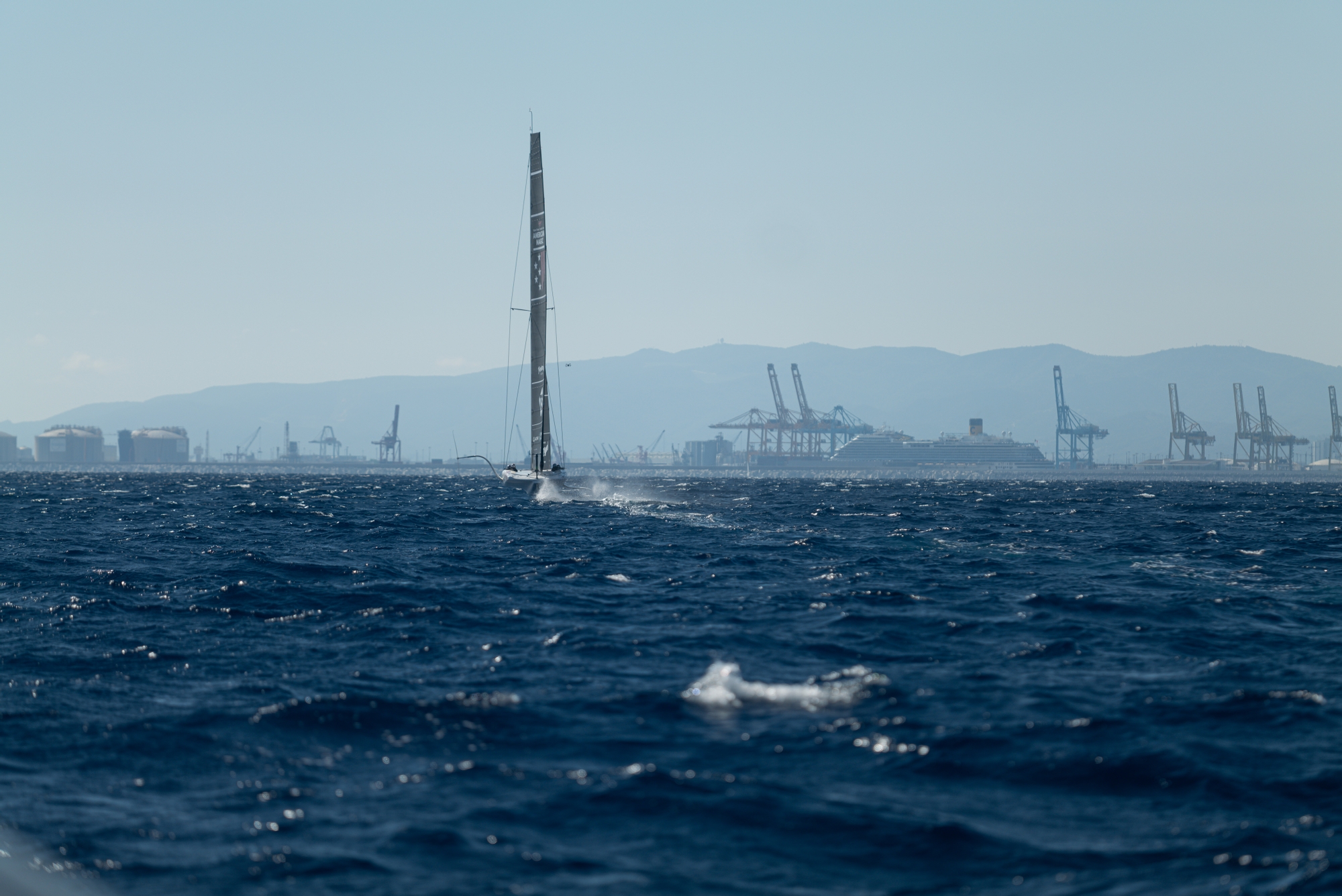 No major as a minute after the LEQ12 performed the third self-take-off of the day and the training routine procedure kept on going for two runs. After a long downwind run, the LEQ12 stopped closer to the harbour to drop off the guests at the base while chase-boat 2 placed a windward and leeward gate. The Recon Team waited at the leeward gate as the LEQ12 passed through and headed on its first upwind leg, bearing-away on the right-hand windward mark, and splashing down after the first gybe. Here the pressure was measured at 15-17kn with some significant wind chop and the J2-1 was lowered to hoist the J4-1. Once up and foiling the LEQ12 headed straight downwind, rounded the mark for another upwind leg and after crossing the line it sailed mostly downwind completing its last foiling stint in front of the harbour. Sails were lowered and the day was called after an approx. total of 28 tacks, 26 gybes, and 140 total minutes foiling time [Michele Melis AC Recon].