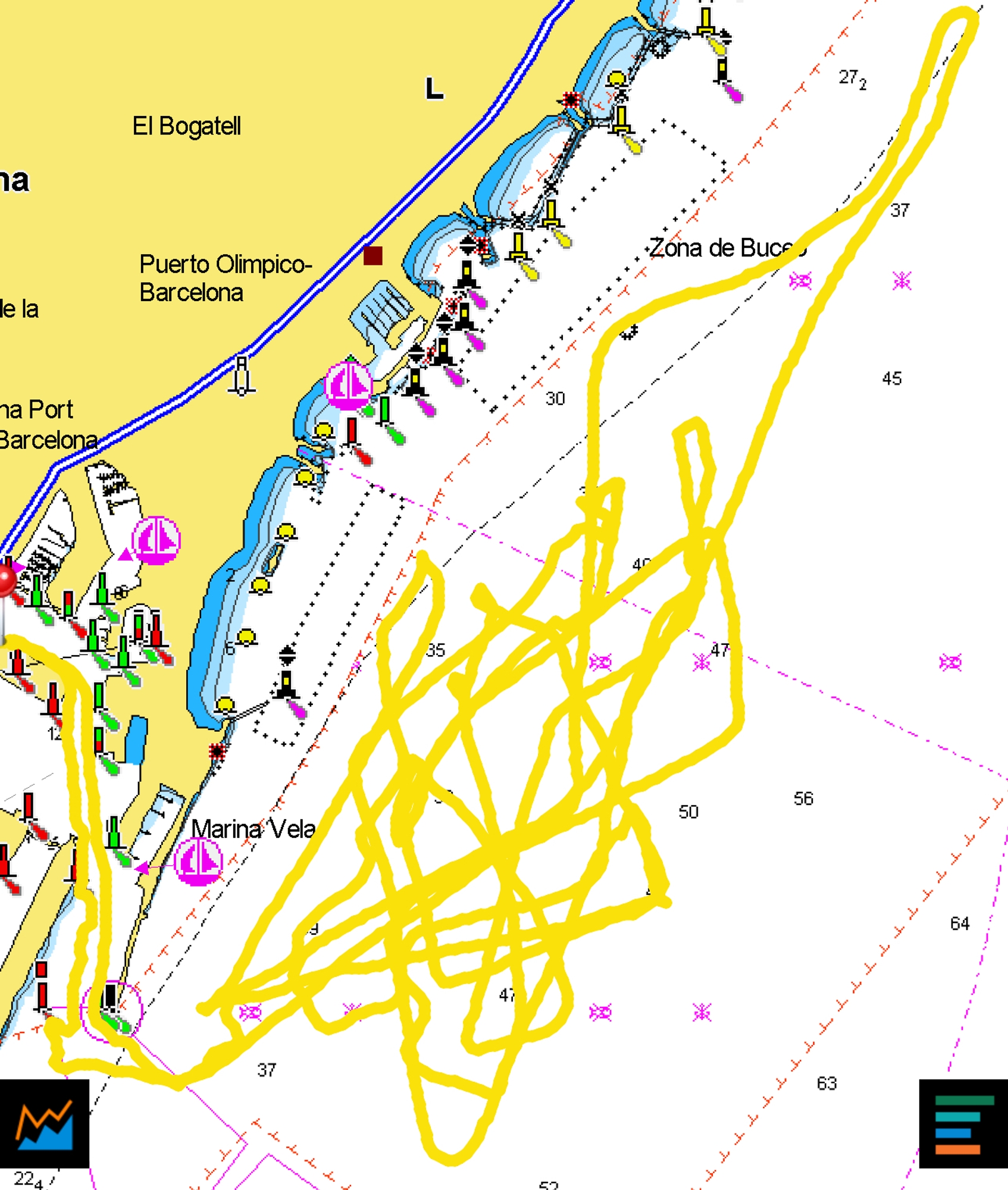 After another 20-minute break, at 16:35 two one-lap upwind-downwind races took place, with virtual boundaries and virtual marks, doing rabbit starts, and seven to eight tacks on the upwind and five to six gybes on the downwind. Magic was ahead on the four mark-roundings for a considerable margin. Differences were larger in racing mode than in straight-line speed testing mode. America nose-dived at least once per leg. An extra upwind was sailed, heading back towards the port, performing some tacks in a dyeing breeze with J2s.