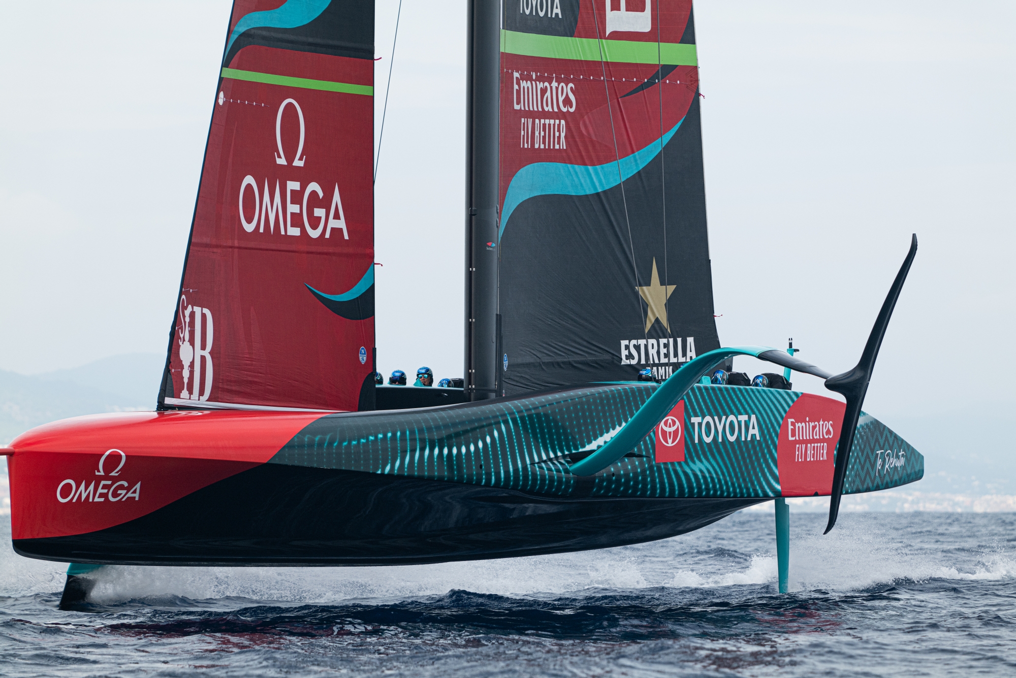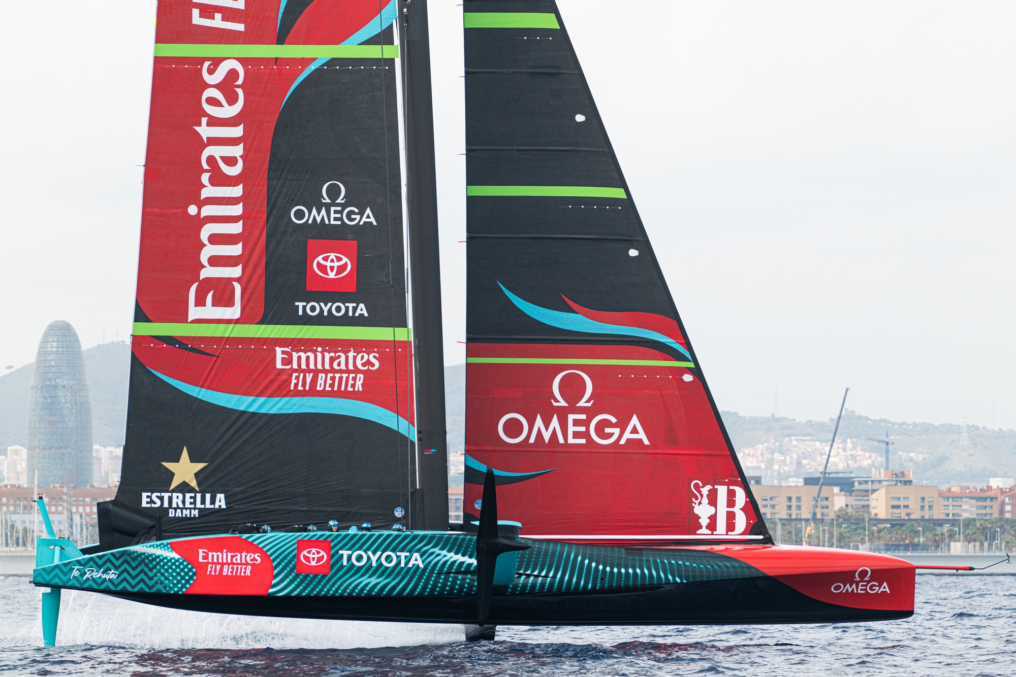 On every measure, Emirates Team New Zealand looked to knock it out of the park today. Far better than yesterdays at times wobbly flight, today was rock solid, dialled down to the water’s surface, utterly consistent with smooth steering despite an offset swell. The return of the south to south-westerly ‘Garbi’ – the beautiful breeze that filters up through the Mediterranean and arrives on Barcelona’s shores behaving itself and readable – made for a good later afternoon session on the water for the Kiwis who docked-out at 3pm and then put in a solid two-and-a-half-hour shift in greying conditions that are heralding the change in seasons.