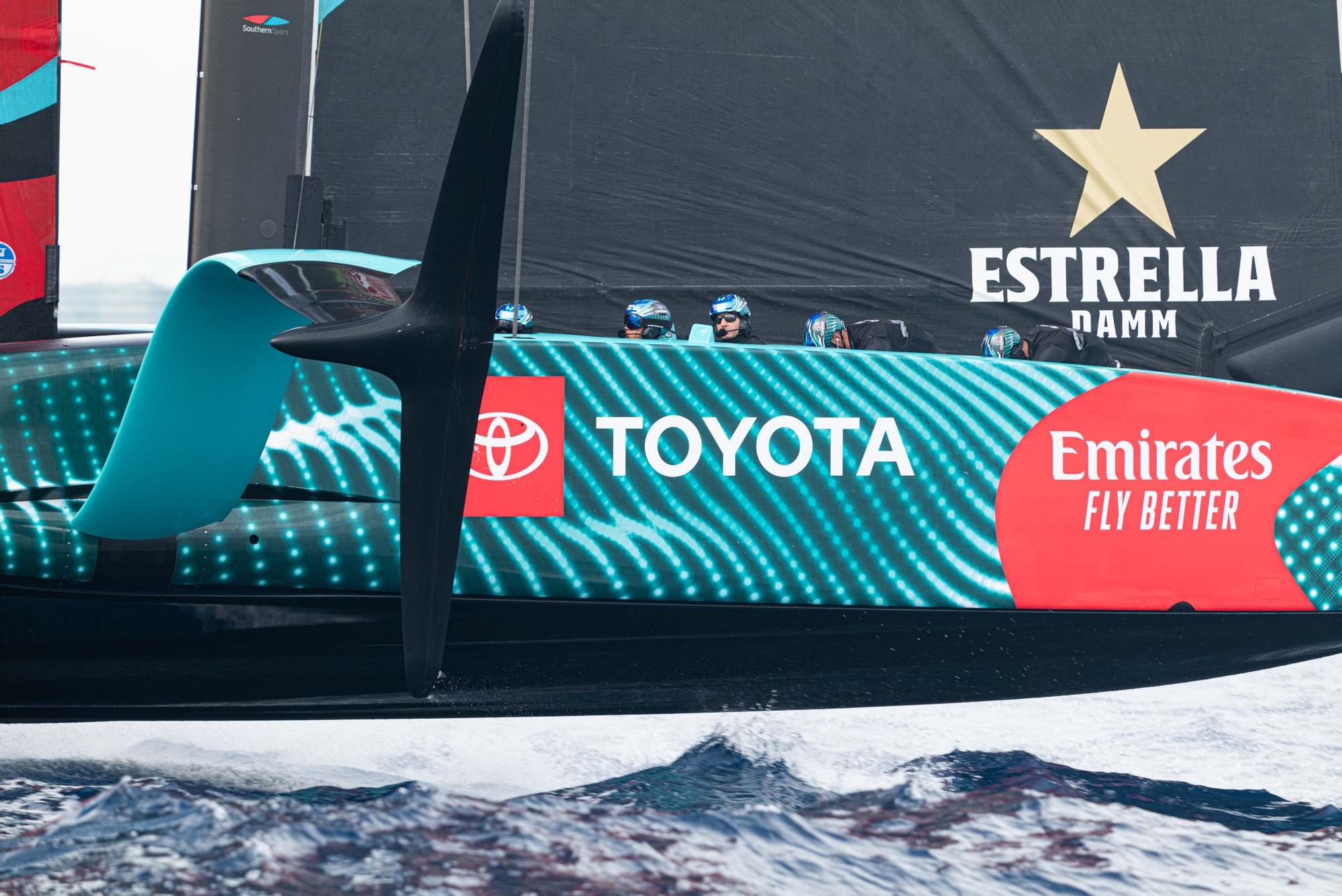 On-Water Recon Unit Notes – Emirates Team New Zealand: A forecast of light inconsistent breeze for this morning saw Emirates Team New Zealand set a 1430 dock out time for their second sailing session of the week aboard their AC75 in Barcelona. After rolling out on time at 1300 this afternoon, the Kiwi AC75 was rigged and launched by 1330 before – for reasons unknown – dock out was pushed back by 30 minutes to 1500. With the M1-3 mainsail and J3-6 headsail hoisted and two guests onboard, the boat left the harbour at 1522 and was soon foiling downwind in a 12-knot southerly breeze that kicked up a light chop that became mixed in with a long 0.5 metre swell from 060 that was left over from yesterday's stronger north easterly breeze.