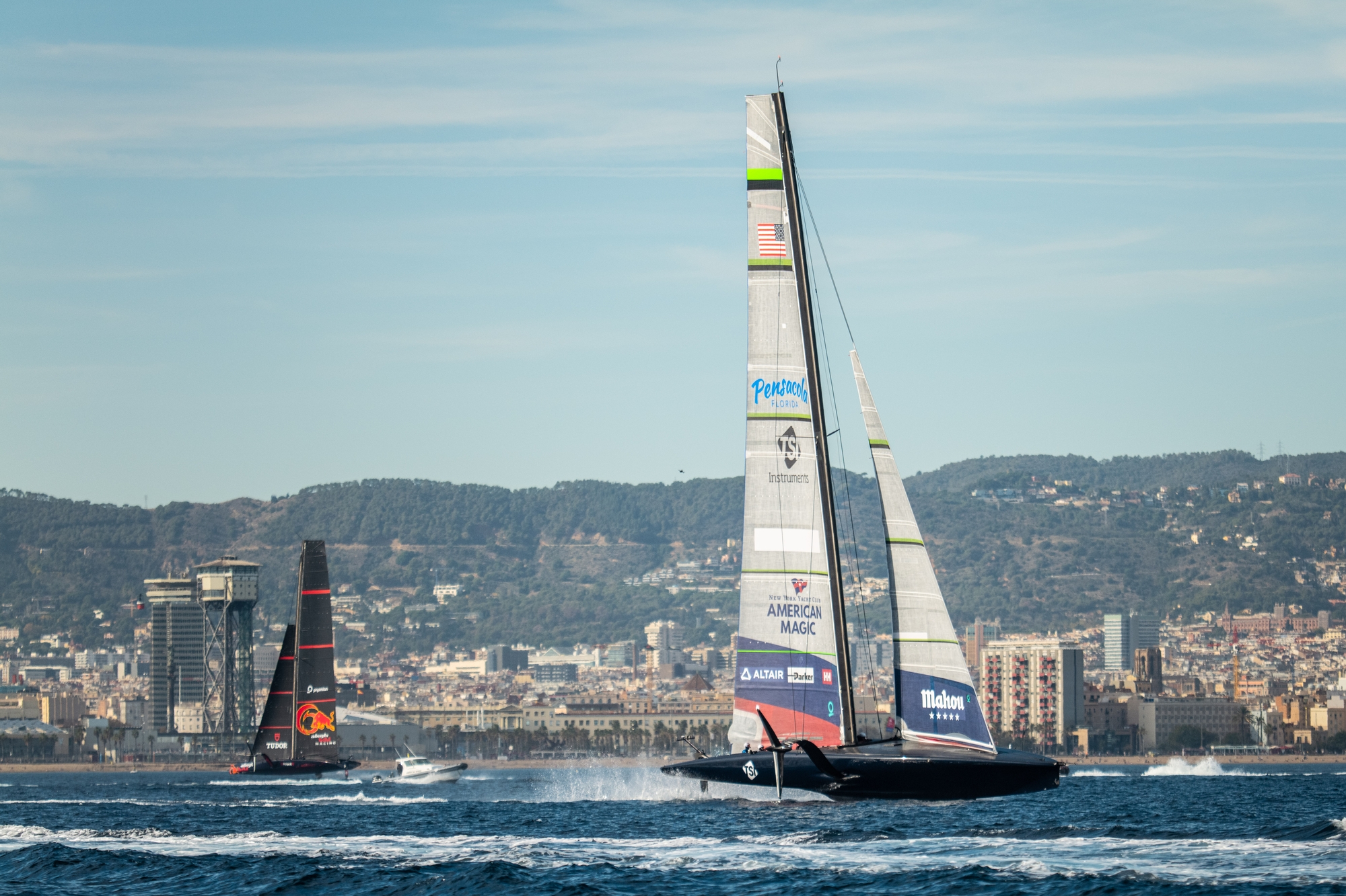 On-Water Recon Report – NYYC American Magic: The American team rolled out of the shed at 0745am with a scheduled 1030 dock-out of their last-generation AC75 Patriot and today were rewarded with some near-perfect sailing conditions on the waters off Barcelona where a southerly breeze ranged up and down during the day from 9 to 15 knots.