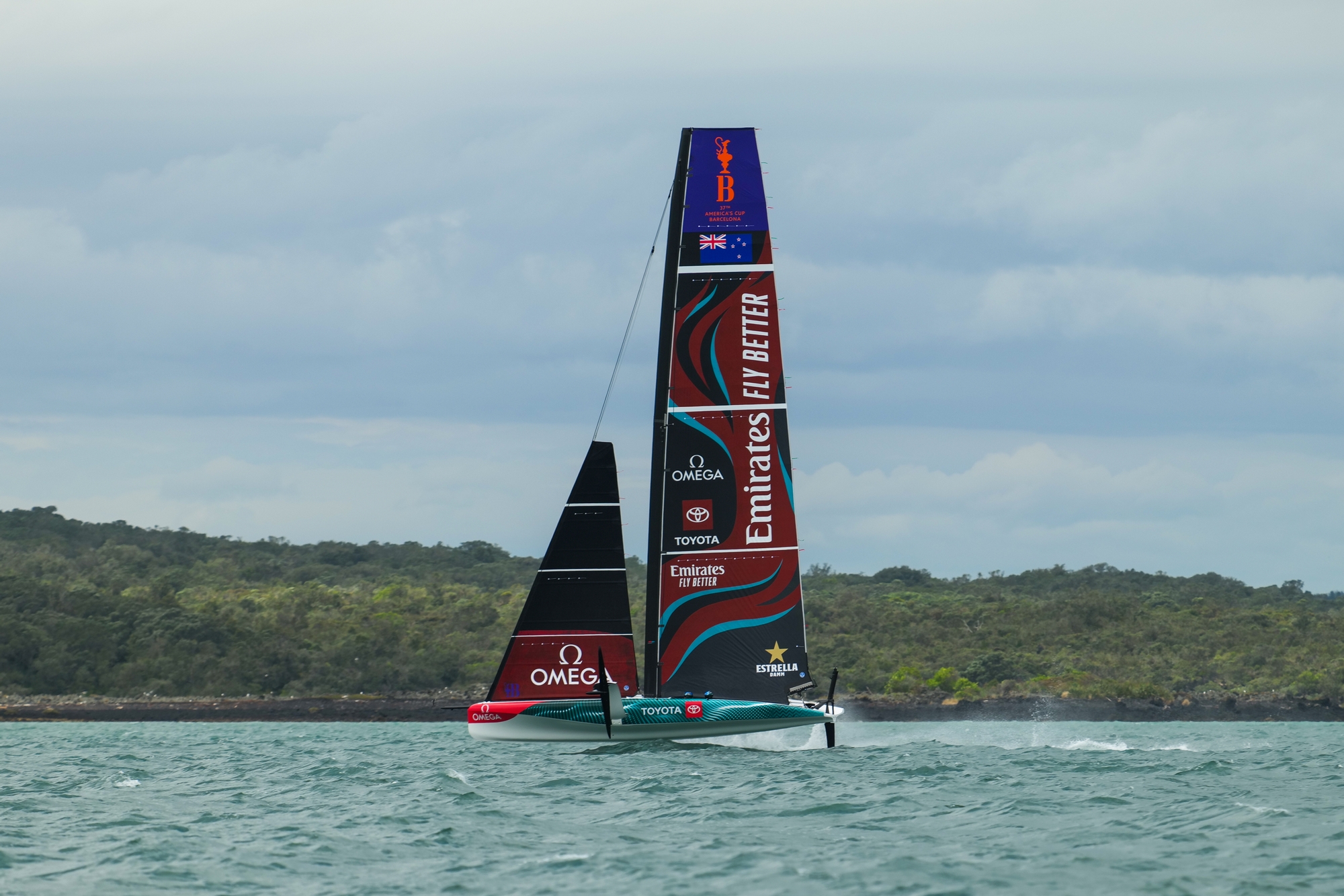 By 13:32 the team were sailing and opted to head up toward the bays off the North Shore. It seemed as though here the breeze was most stable and least affected by the passing rain cells. The Norwest wind against the outgoing tide really roughed up the area, with some short sharp waves up around 1 meter in the channel, and even sizable chop towards the shore. Whilst it made it difficult for the recon team, the guys on the LEQ12 made light work of it. Sailing slightly different modes to combat the sea state, they easily foiled above the waves with very few splash downs and only a couple of touch and go manoeuvres. They could be seen sailing a little flatter today rather than with their typical windward heel - not quite as bow down as we have seen in the past either. In some of the gusts they would really load and lean on the main foils, but everything held well. The only wipe-out we saw was through a tack where the rudder let go. Unfortunately, we were not in range to see the exact cause of the wipe-out. The team stopped briefly for a check before continuing sailing like nothing happened.