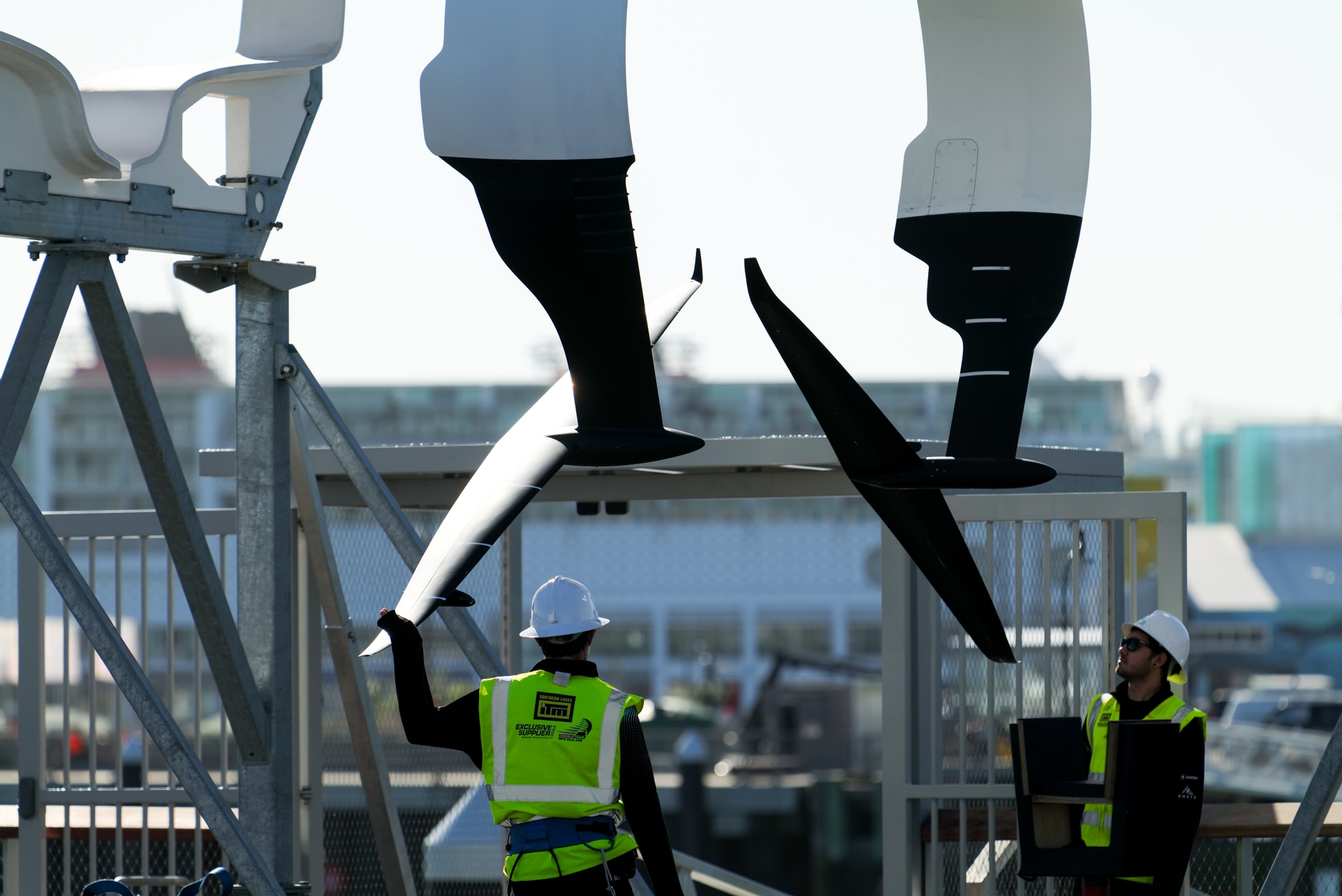 With two LiDAR (Light Detection and Ranging) cameras fitted to the LEQ12 moded AC40 today on either side, optimum sail shape and trim data was being captured for the M2 mainsail paired with both the J2 and J3 bespoke headsails with the sailors noticeably trying varying jib car positions. At times the headsail almost looked too bladed, sheeted close to the mast and stalling whilst at other times, a wide smooth angle appeared to release the boat in flight for speed. Clew position was also altered through the session with the trimmers adjusting the sheeting position down the four-point attachment holes to test a bigger twist-off in the leech.
