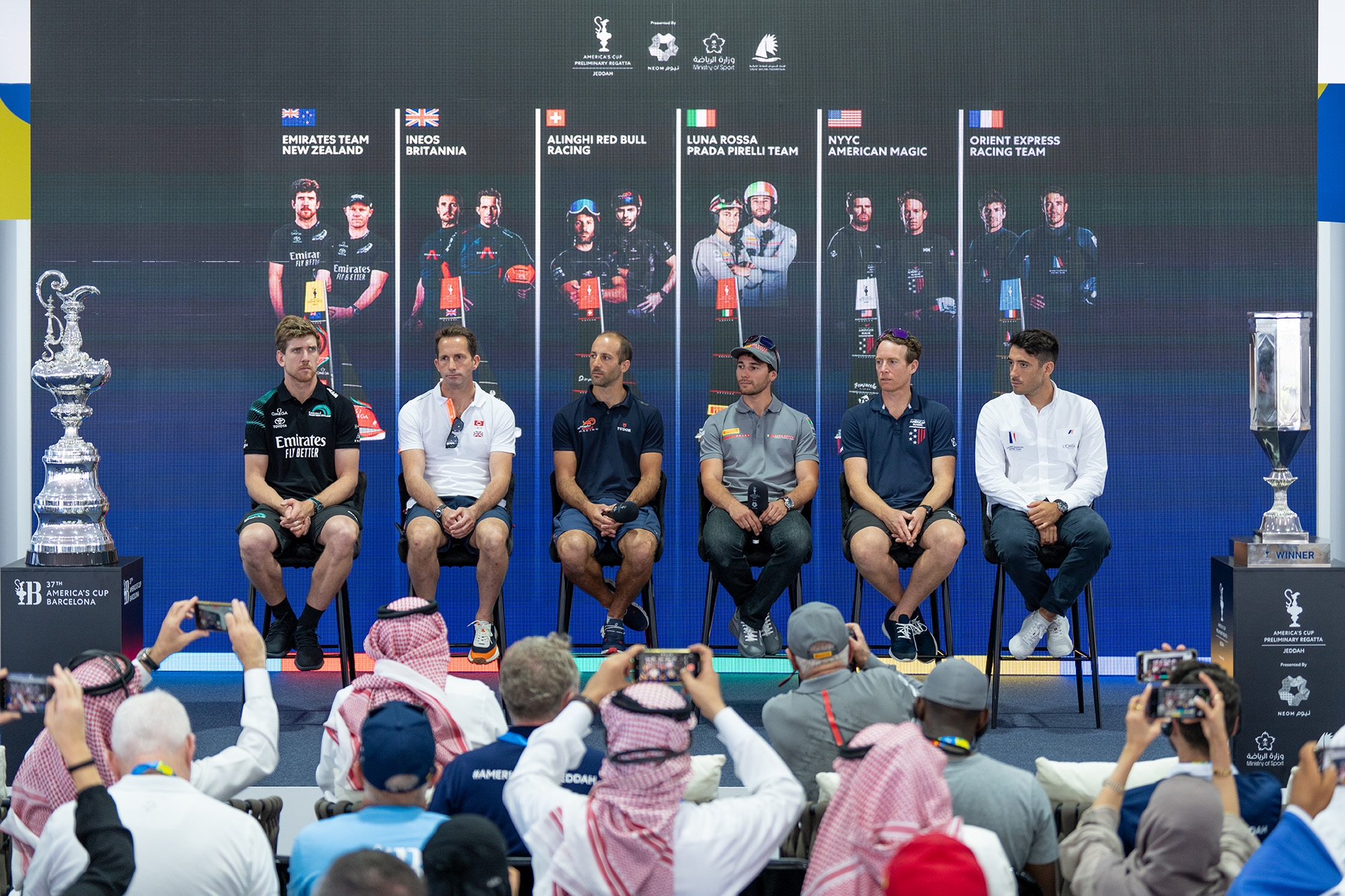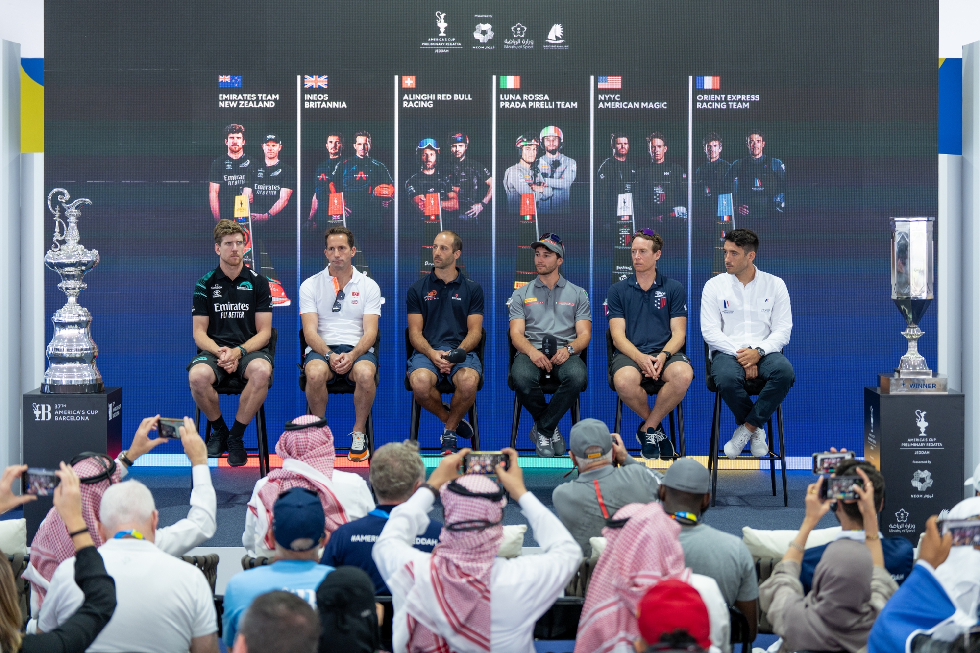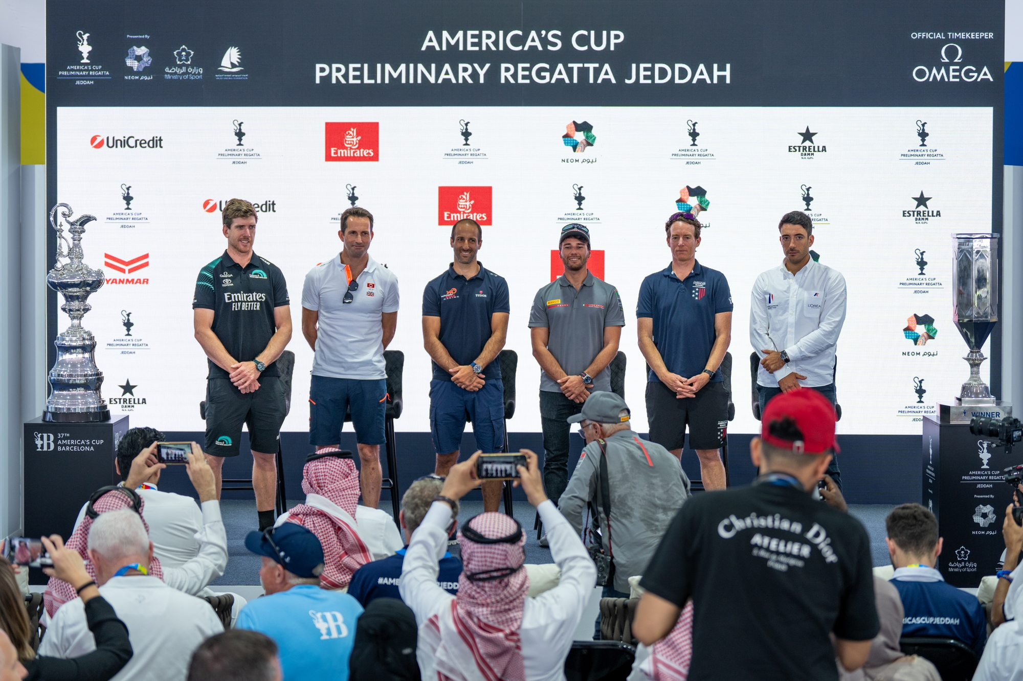 The opening press conference was the kick-starter for the rivalries ahead of the America’s Cup Preliminary Regatta Jeddah, presented by NEOM, beginning in earnest on the Red Sea. With a host of Saudi and International media present, Peter Burling, Sir Ben Ainslie, Arnaud Psarofaghis, Ruggero Tita, Paul Goodison and Quentin Delapierre faced a wide-range of questions, but the messages were clear – they’re all here to race and they’re all here to win.