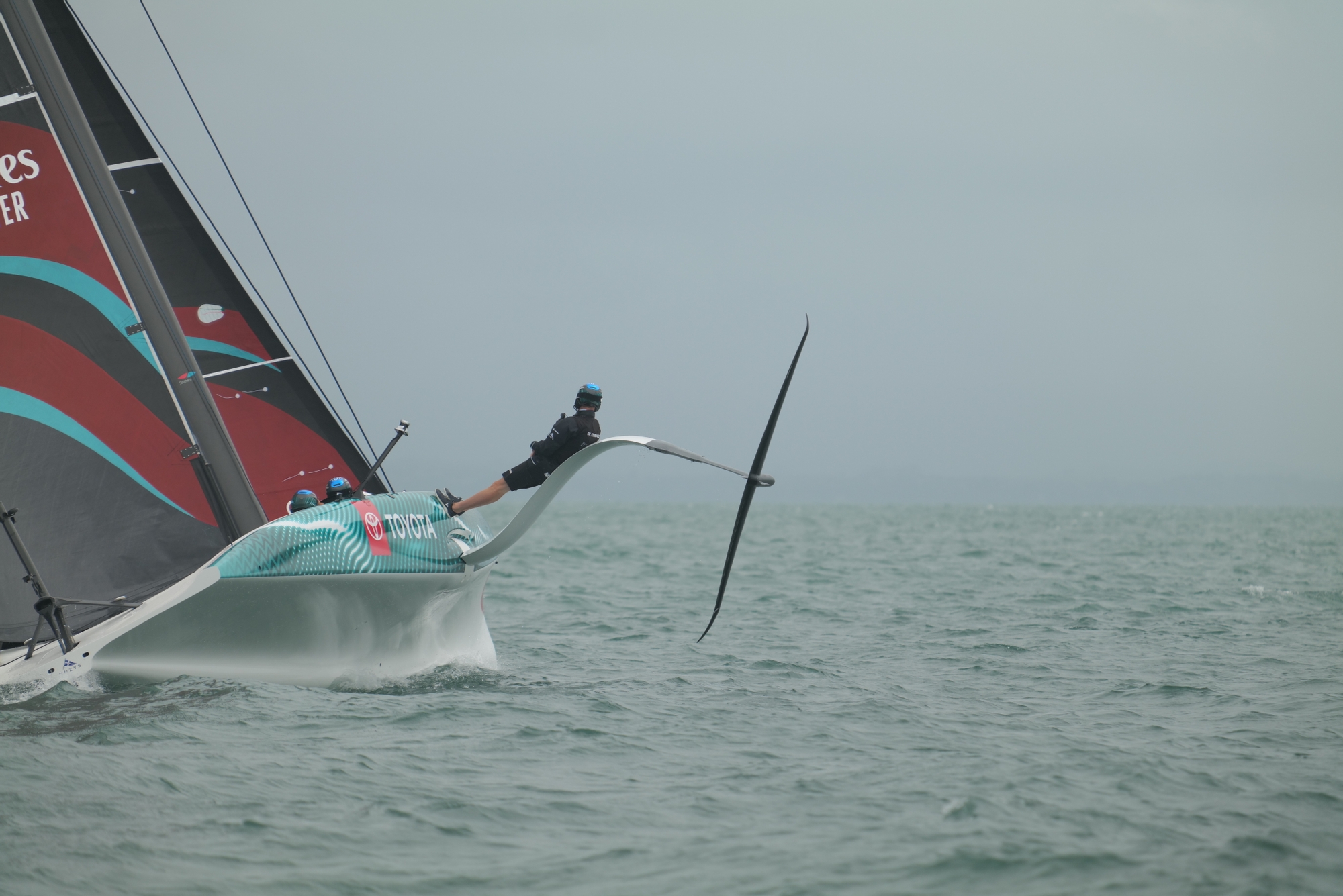 It looked as though the team was really trying to push the limitations of the boat and new starboard foil out in this sea state. Except for two failed manoeuvres, because of bad timing through waves, the boat, foil and team performed very well. The only real shakiness could be seen on the exit of higher speed gybes onto the new foil. It was obvious they were still not super confident with controlling this foil on the exits at high speed.