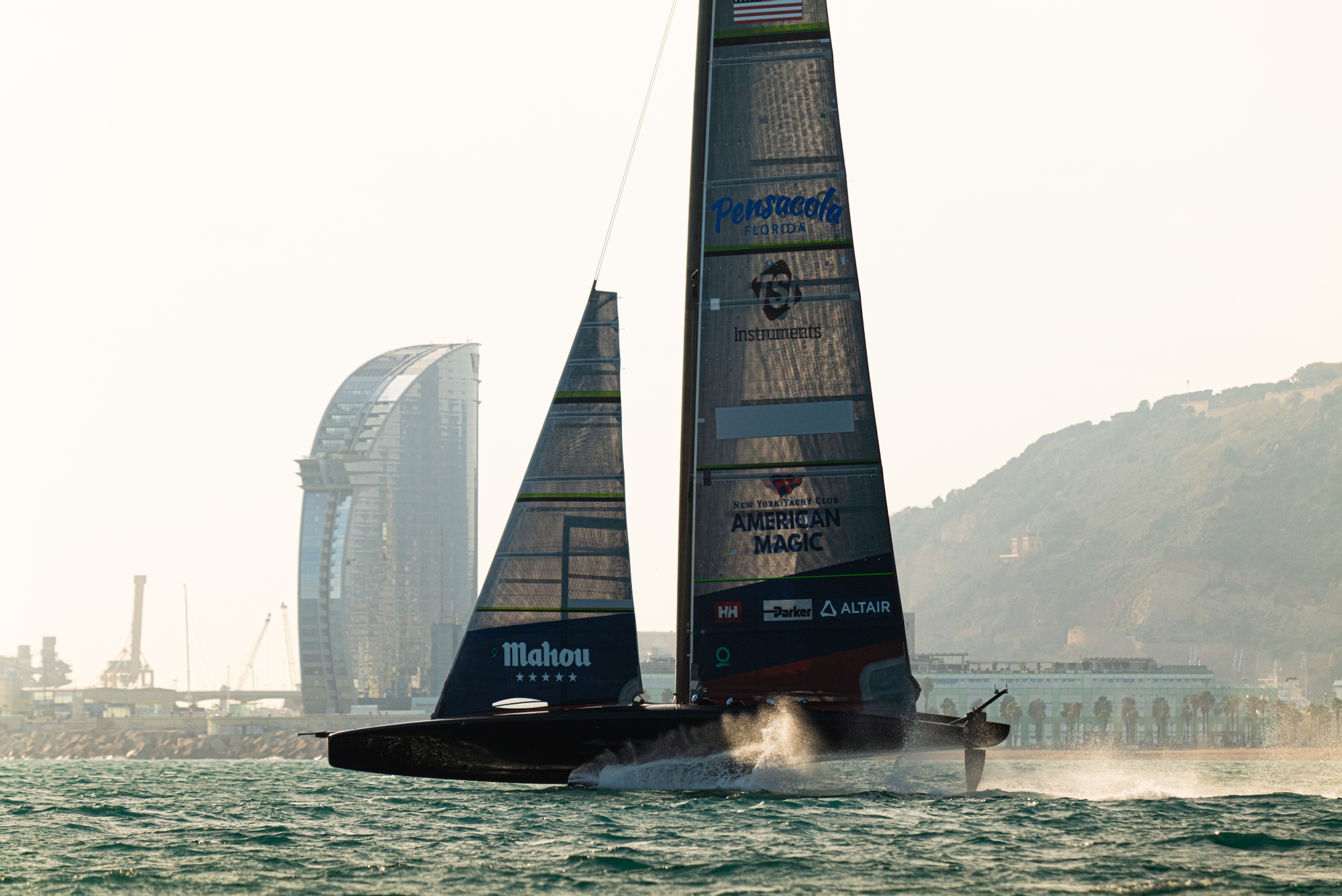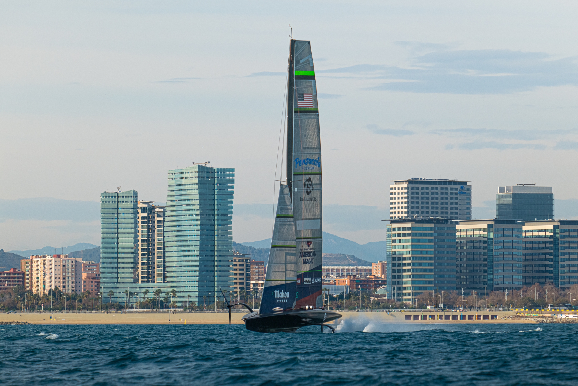 Back in Barcelona it was an eventful day for NYYC American Magic who had a tricky first couple of hours with numerous breakdowns but as yachting journalist and recon analyst Justin Chisholm accurately described it was ‘patience and persistence’ that were the watchwords of the Americans today. It’s very clear that ‘Patriot,’ the team’s Auckland-designed AC75 struggles in the Barcelona chop with a deep volume hull design that gets easily sucked into displacement aligned with anhedral foils that are certainly showing their design-age. However once flatter water can be found, she’s an absolute weapon and as the afternoon progressed, the performance levels went through the roof.