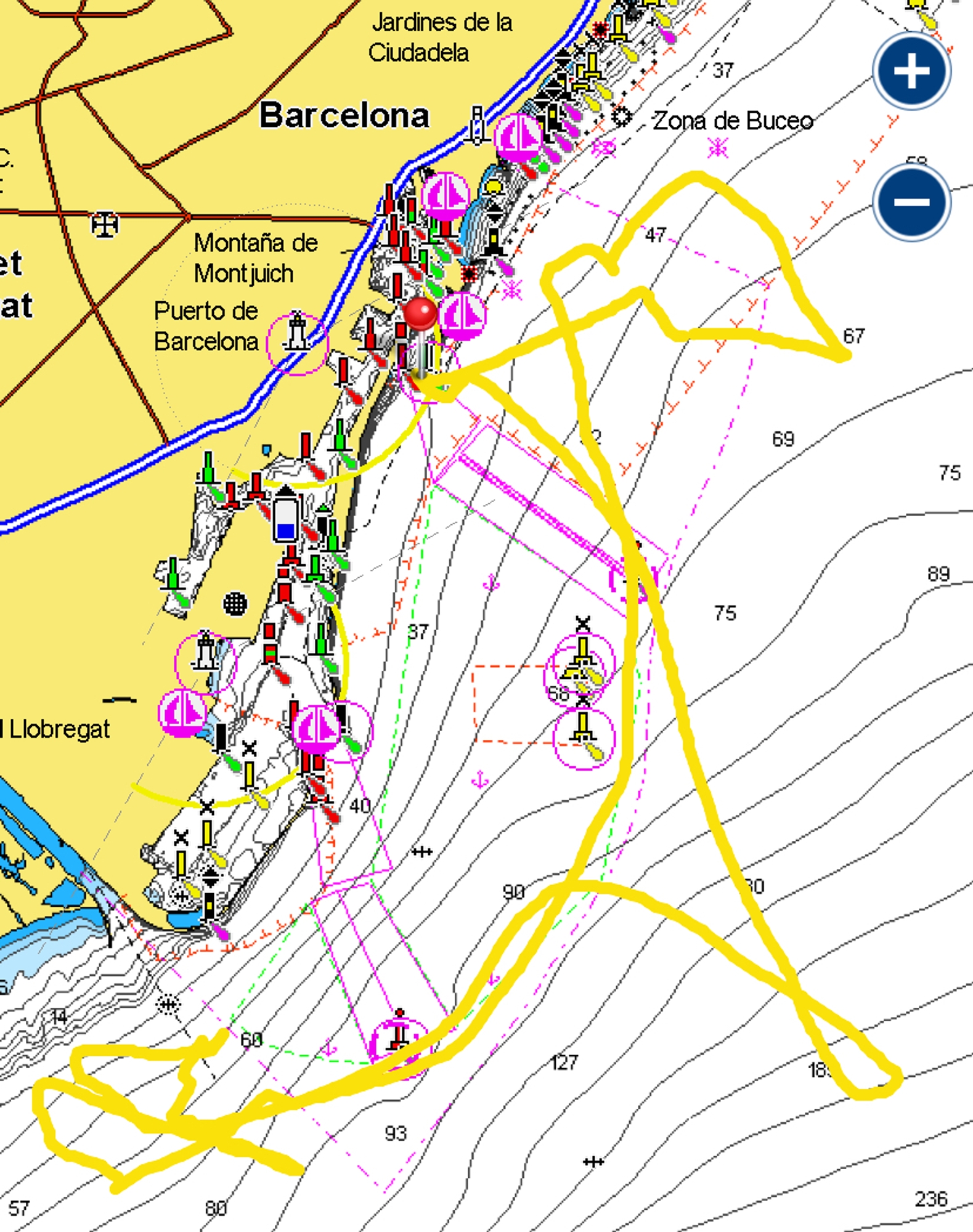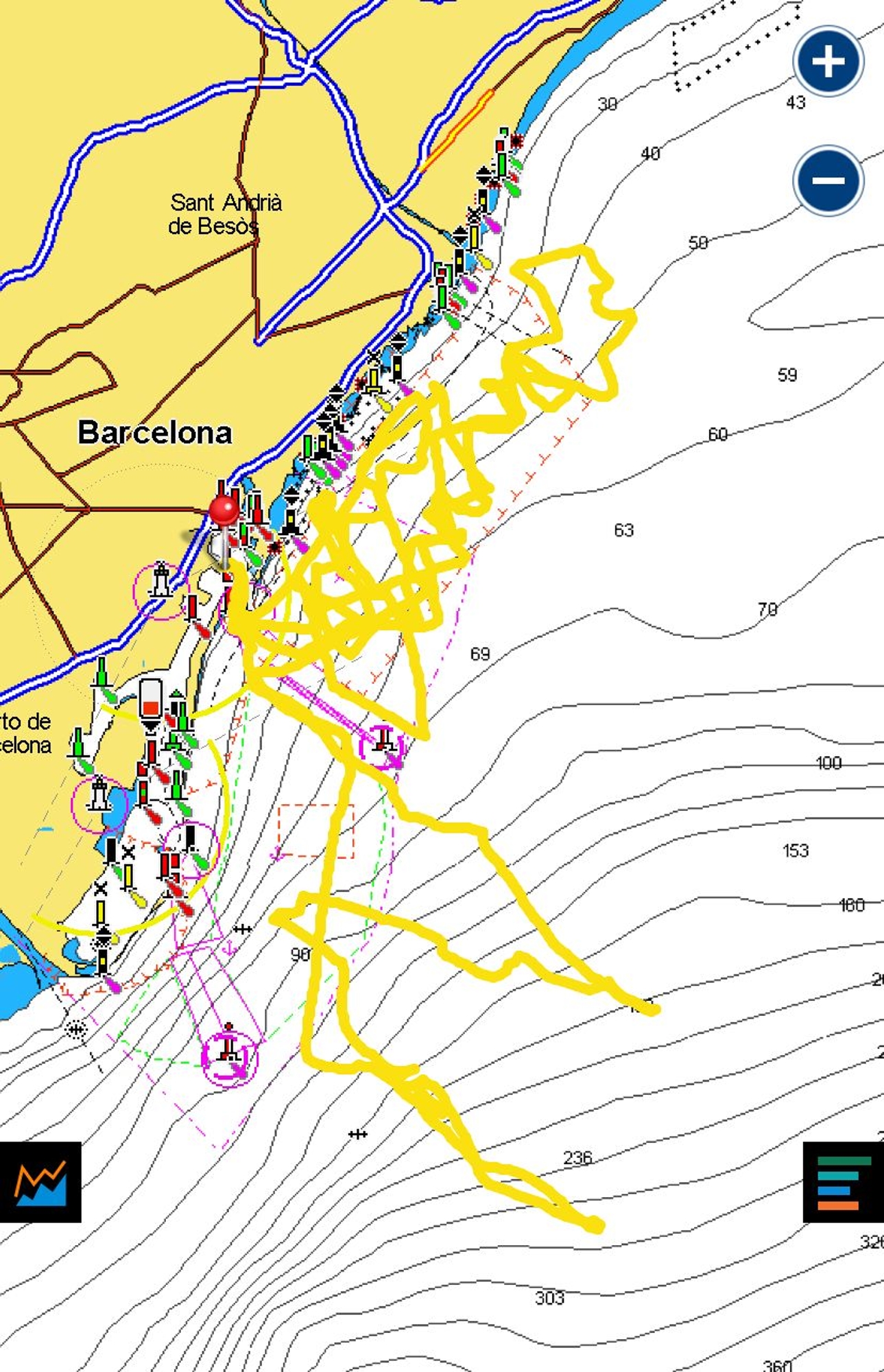 @14:56 pm: A long tow-in with the chase boat was done to the port area and a nice breeze of about 7-9 knots TWD 220 was found, what it was perfect to sail without the need of the help of the chase boat for the take off. As soon as the boat was released from the towing rope, it started a downwind and performed 5 jibes in a row: 4 were touching down but last one was quite successful.
