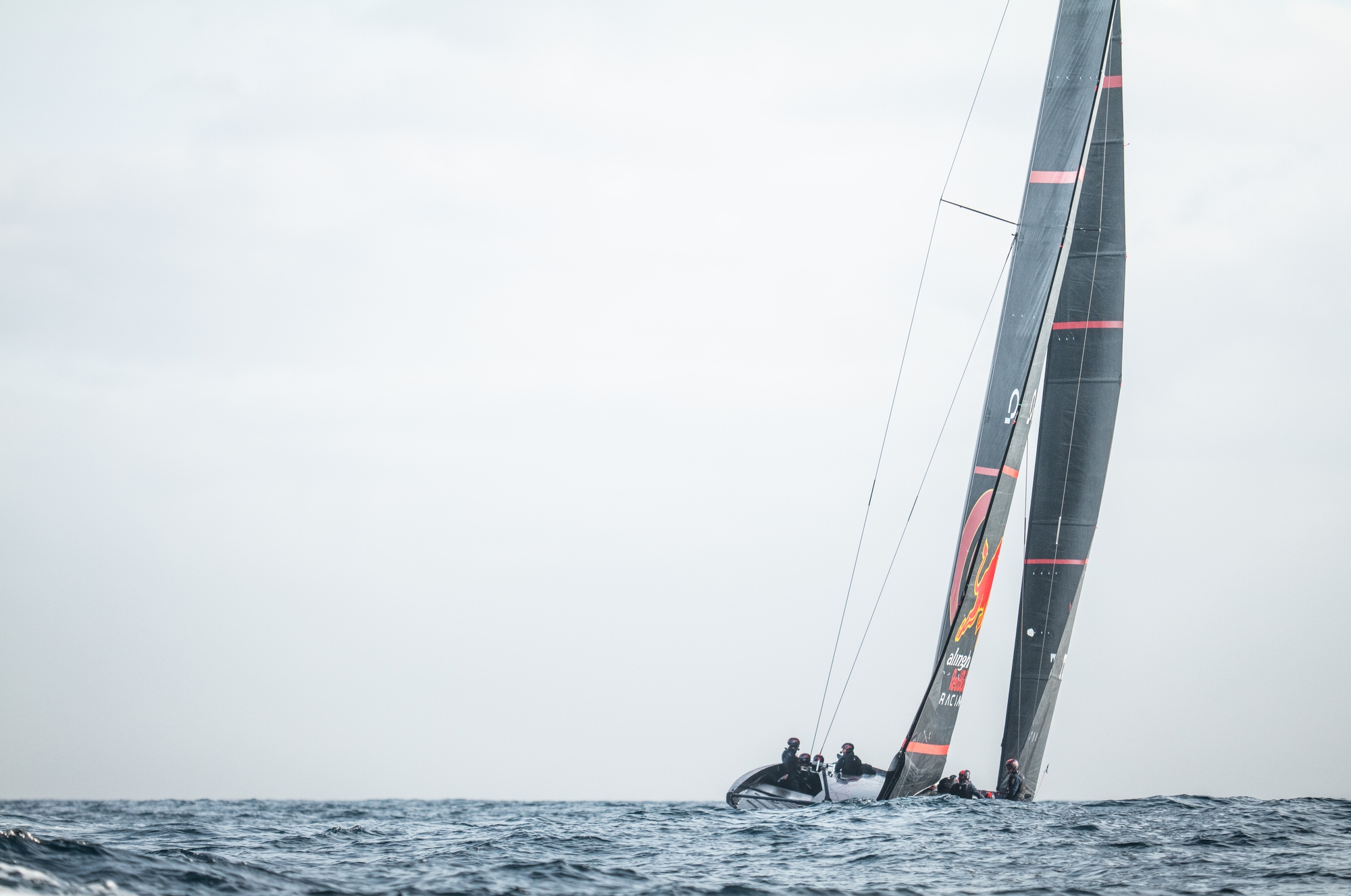 In the stronger breeze the team still seemed to be concentrating a lot on tacks and gybes however, they were also seen sailing some different modes especially upwind. At one point they seemed to be really pushing the height of each foil, and on starboard tack especially, running a lot of cant down. Some lower angles were tested and then once up in the very flat water they seemed to lock into a much lower flight mode and looked extremely slippery.