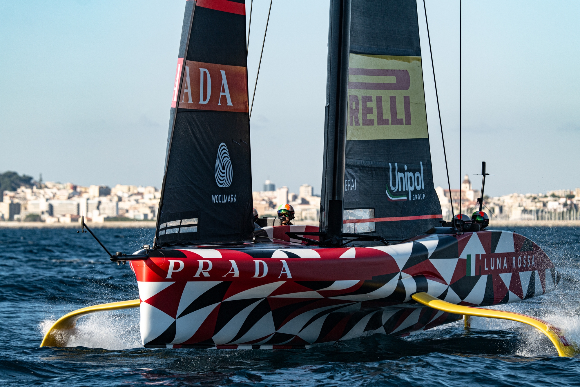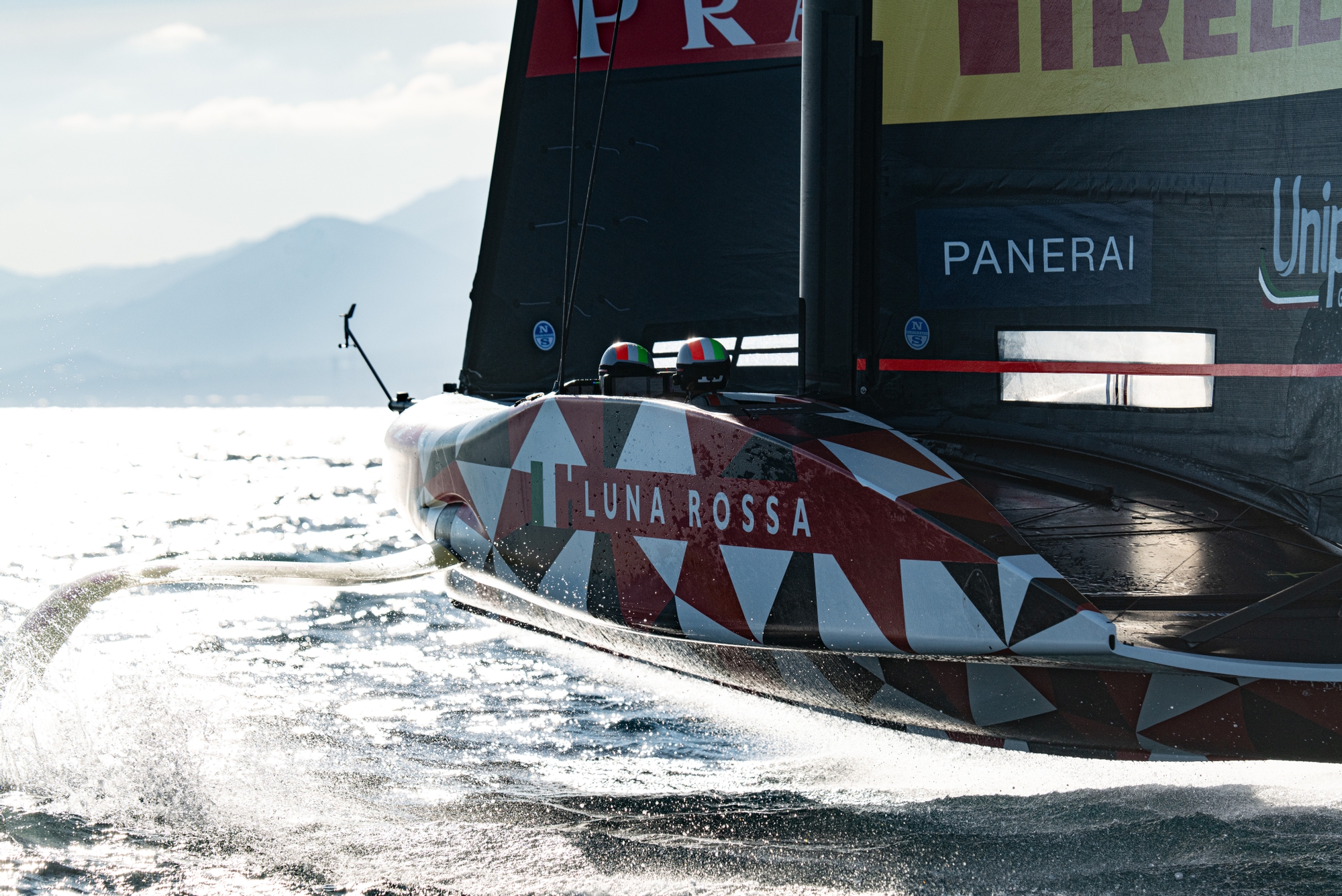 On-Water Report – Luna Rossa Prada Pirelli: The Italians rolled out their LEQ12 prototype at 10:00, stepped mast and craned the yacht in by 10:15. The usual checks were executed at the dock before locking in M1-2 ready for dock-out scheduled at 11:00, then postponed to 12:30. The prototype was boarded by four sailors and only the flight trimmers rotated during the whole session. Just behind the harbour pier, the main was hoisted and paired to the J2-2. Pressure was measured 11-13kn from 155TWA at first with slightly offset chop of 0.3-0.5m from 145°.