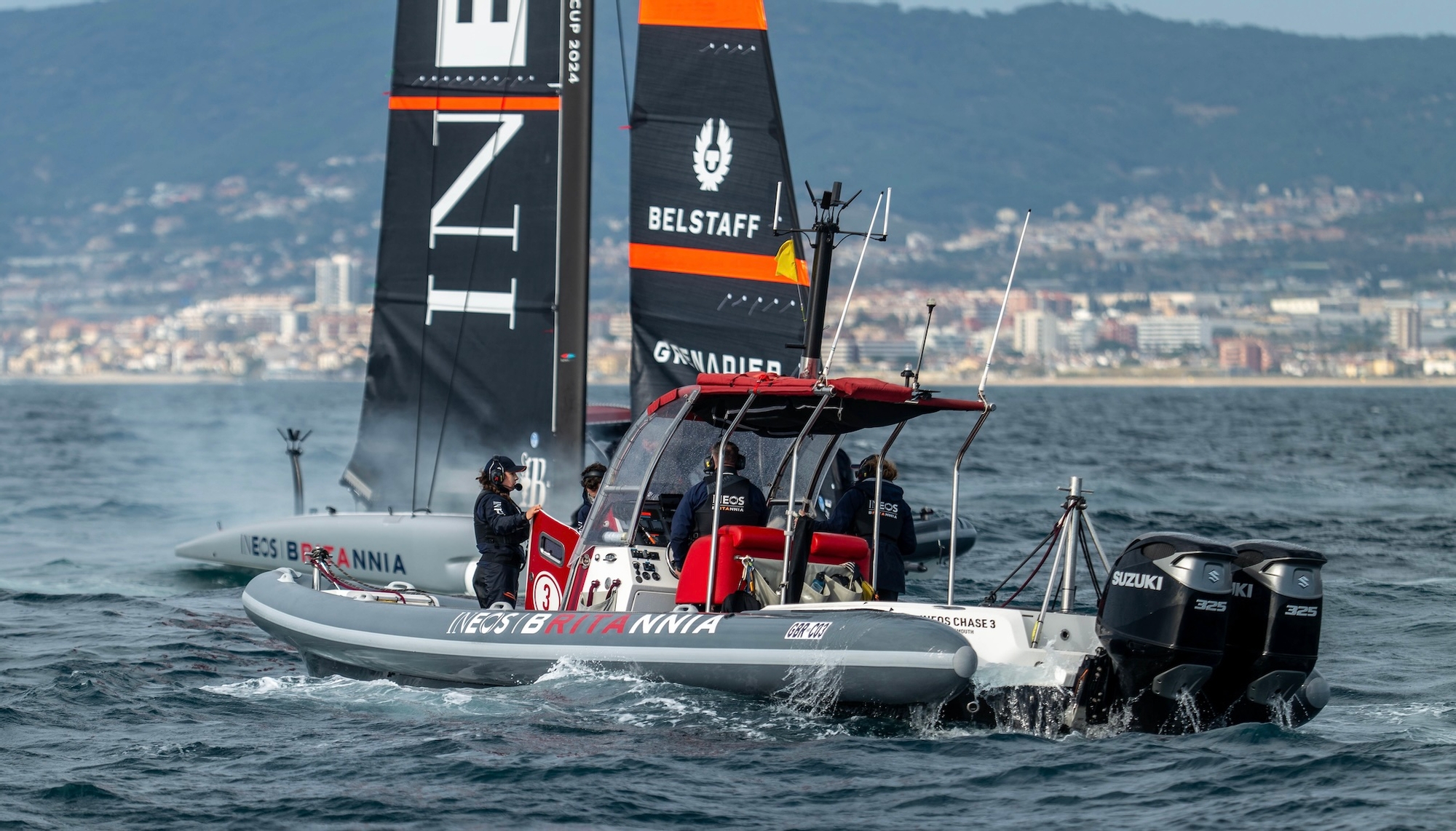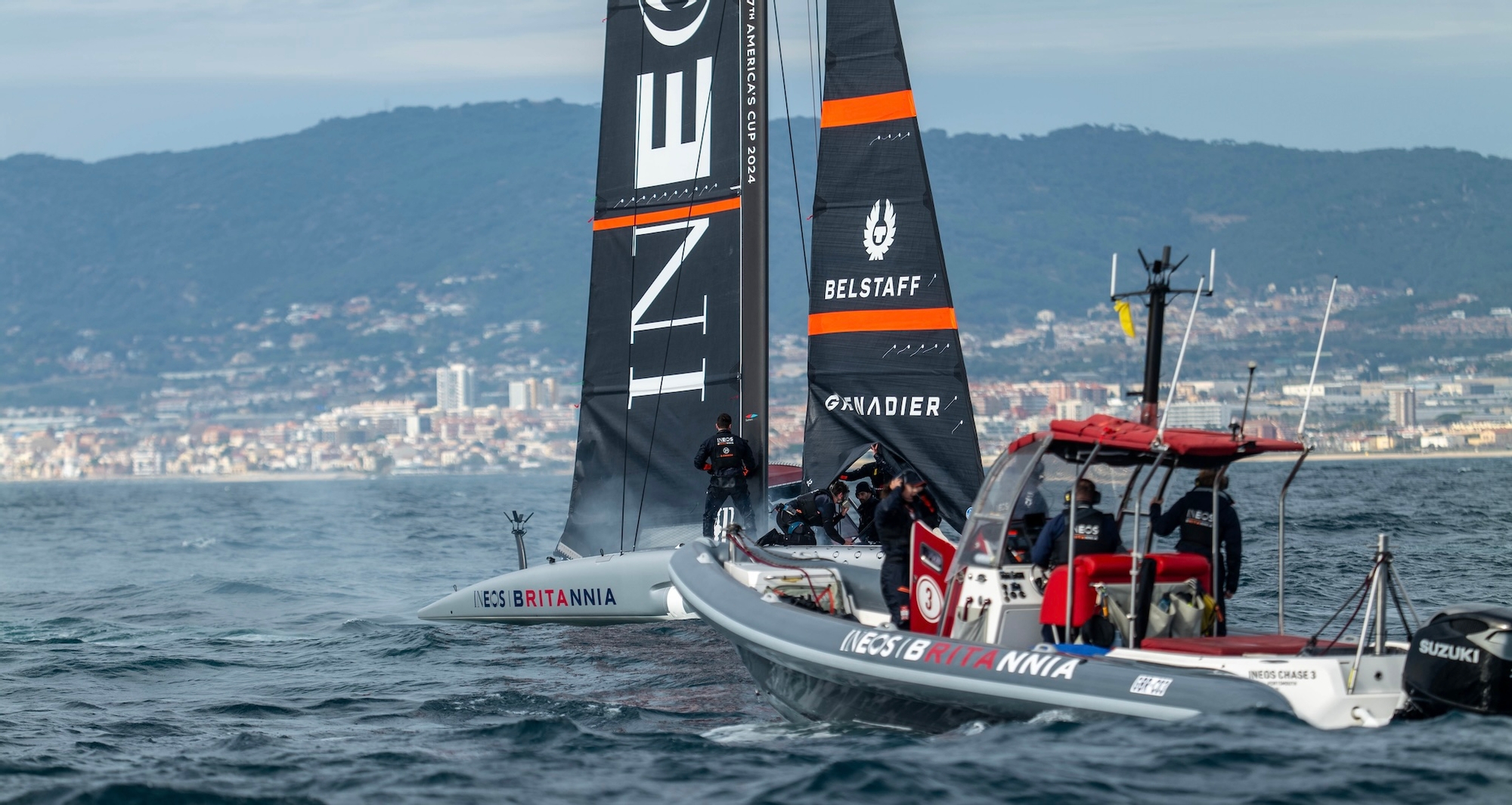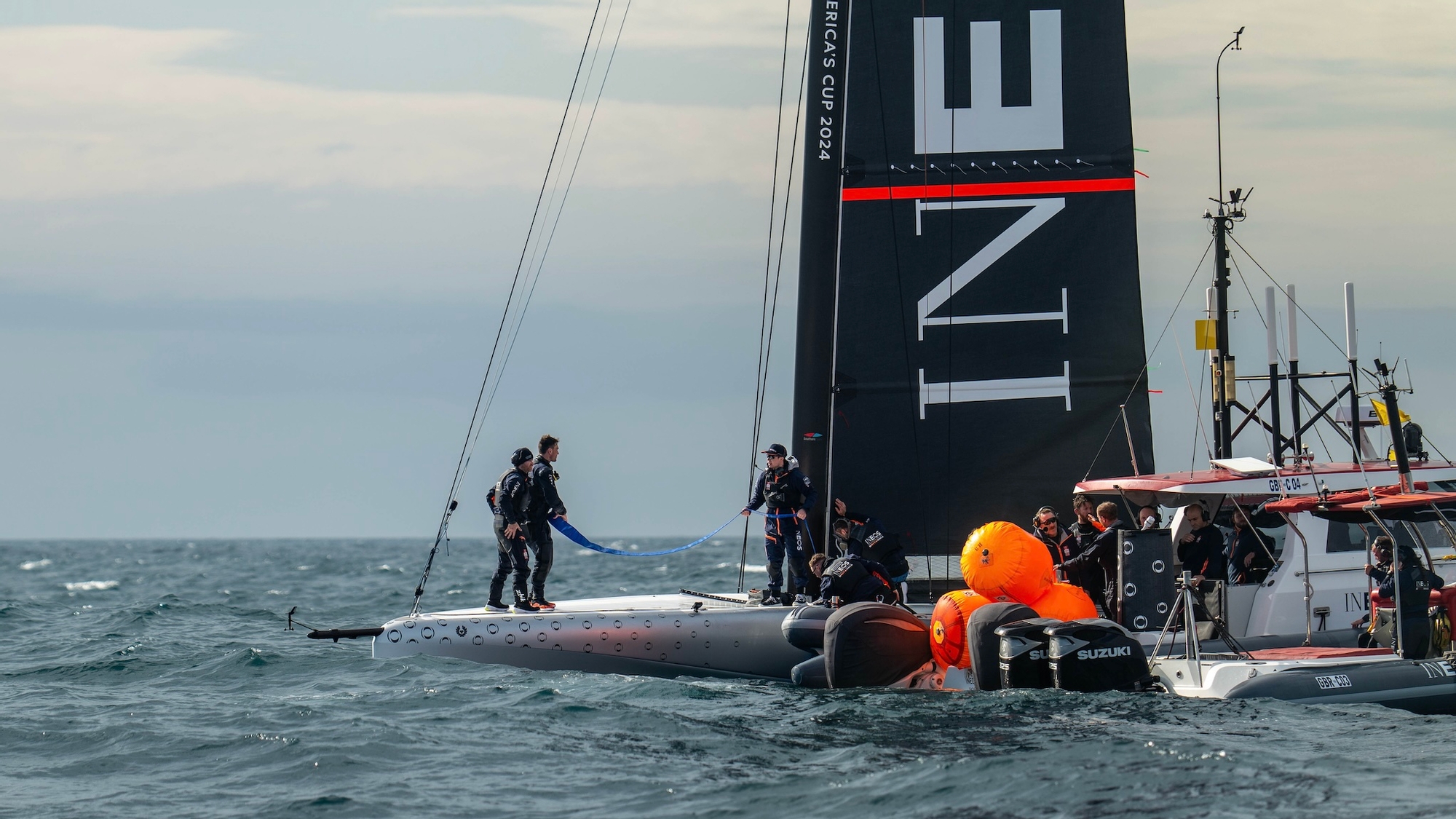After what’s been a really positive start to 2024 for INEOS Britannia with the arrival of their second AC40 and an intense programme of race training and sail testing, today an unfortunate and completely unexpected electrical fire on their AC40 ‘Athena’ brought the training session to a close and required fast, quick-thinking action from the team’s superb on-water safety team to rescue the yacht and get her back to base.