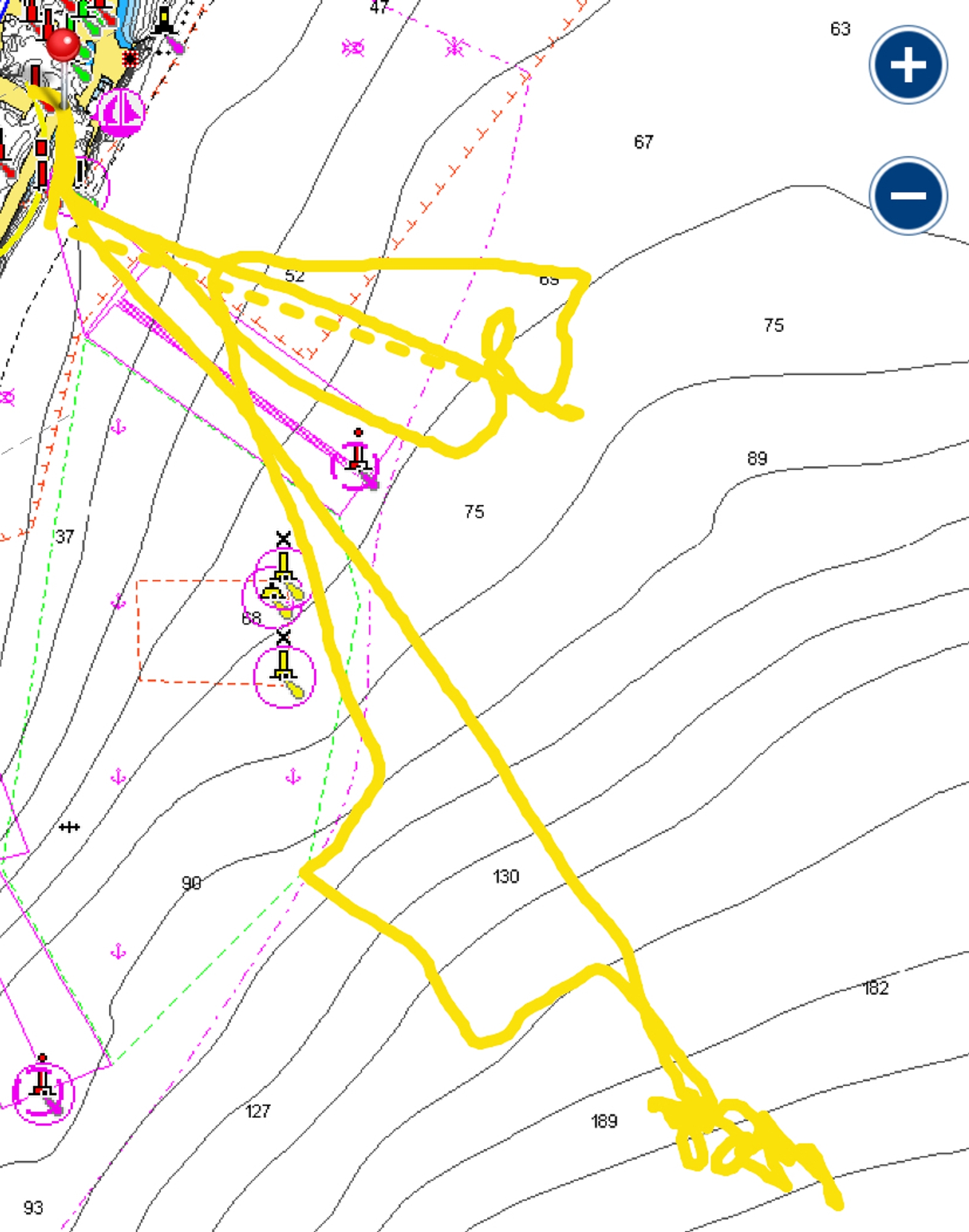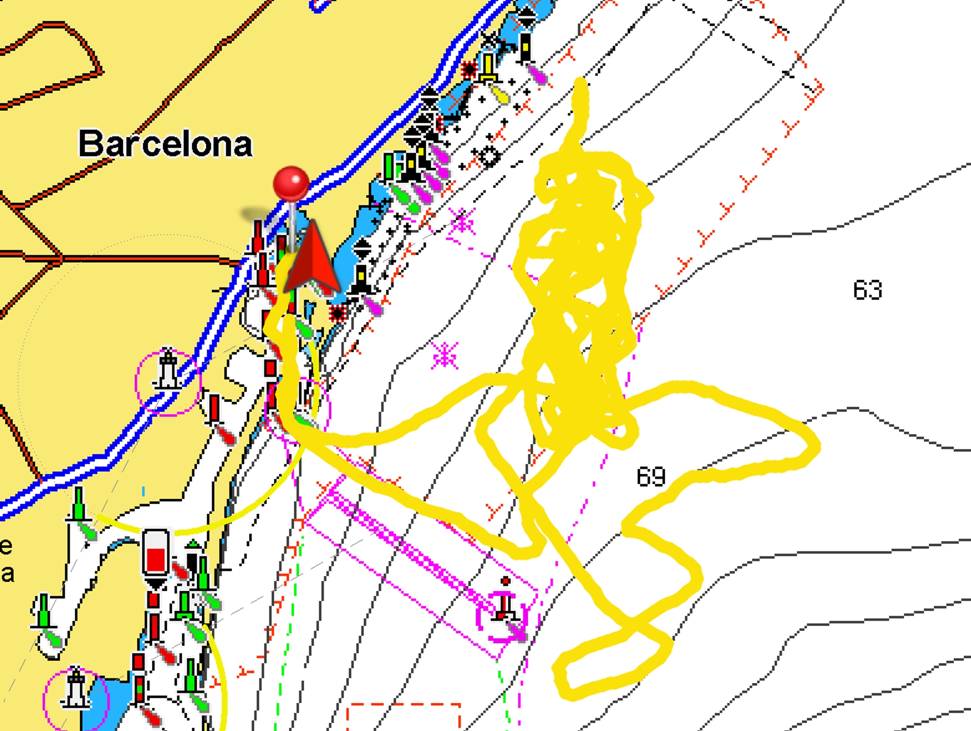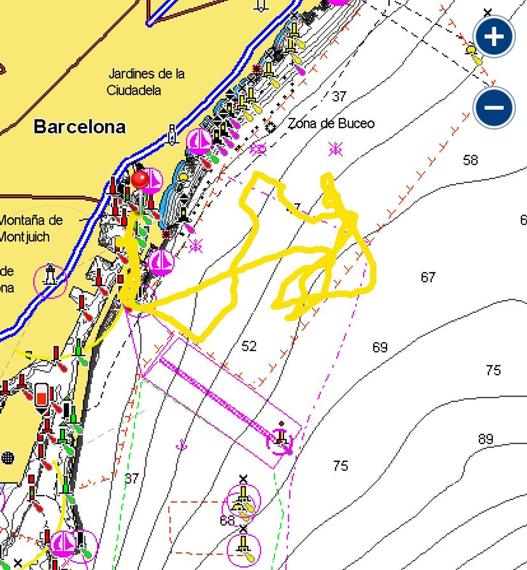 At 12:25 Magic docked out towed by the chase boat. At the entrance to the harbour, sails were hoisted, MC-2 for the mainsail and a J1 C-1 for the jib. When Magic finished hoisting the sails a breeze of around 6-8 knots TWD 190º just came in and she could manage to go out from port on her own. They started with a quick warm-up, sailing downwind and after 4 gybes they suddenly started sailing upwind, did 2 tacks and arrived to a spot were the chase boat had set 2 marks that were used for different exercises.