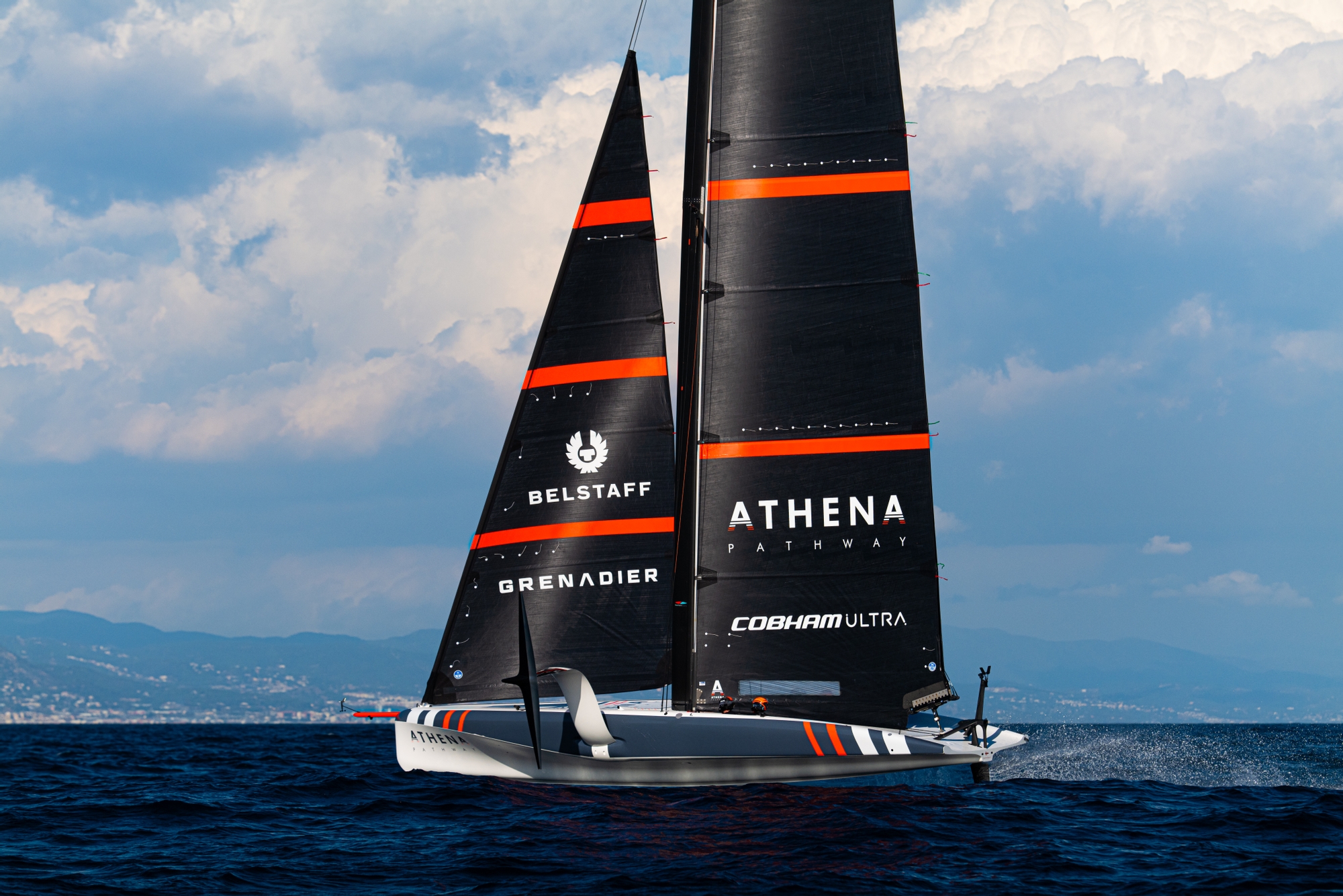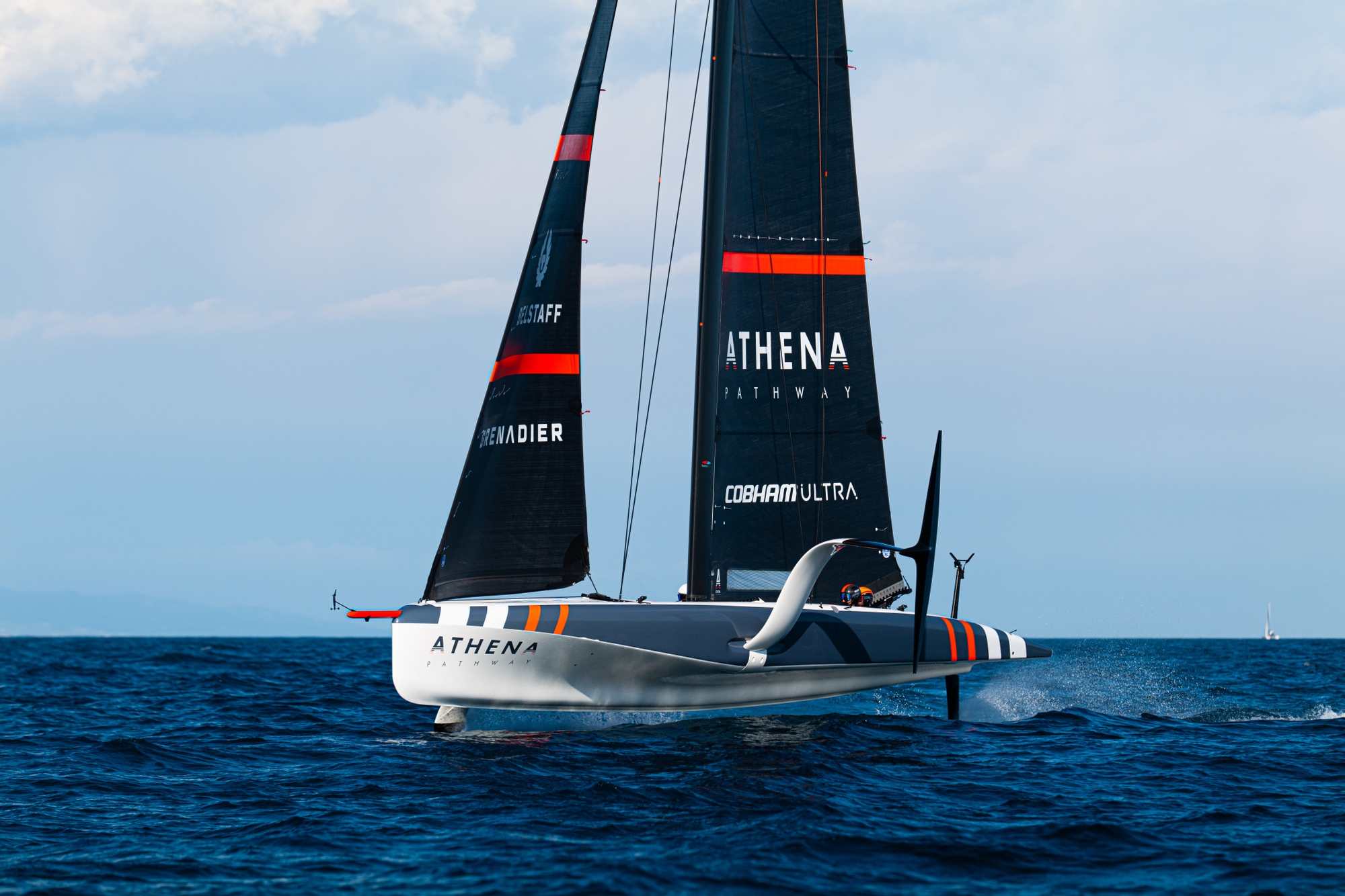 INEOS Britannia have been recovering from the damage caused by the battery fire on Athena, their ‘works’ AC40 but today started to take ‘Sienna’ their Athena Pathway AC40 out of class with a new LEQ12 jib that allowed the recon team to start following them. With the well-established senior helms of Sir Ben Ainslie and Giles Scott onboard, the team looked pretty comfortable in the residual swell despite a few drop downs and safety-first double-board round-ups and on the tech side the recon team noted a quite sloppy, floppy jib through the gybes and manoeuvres – a different sailcloth perhaps?