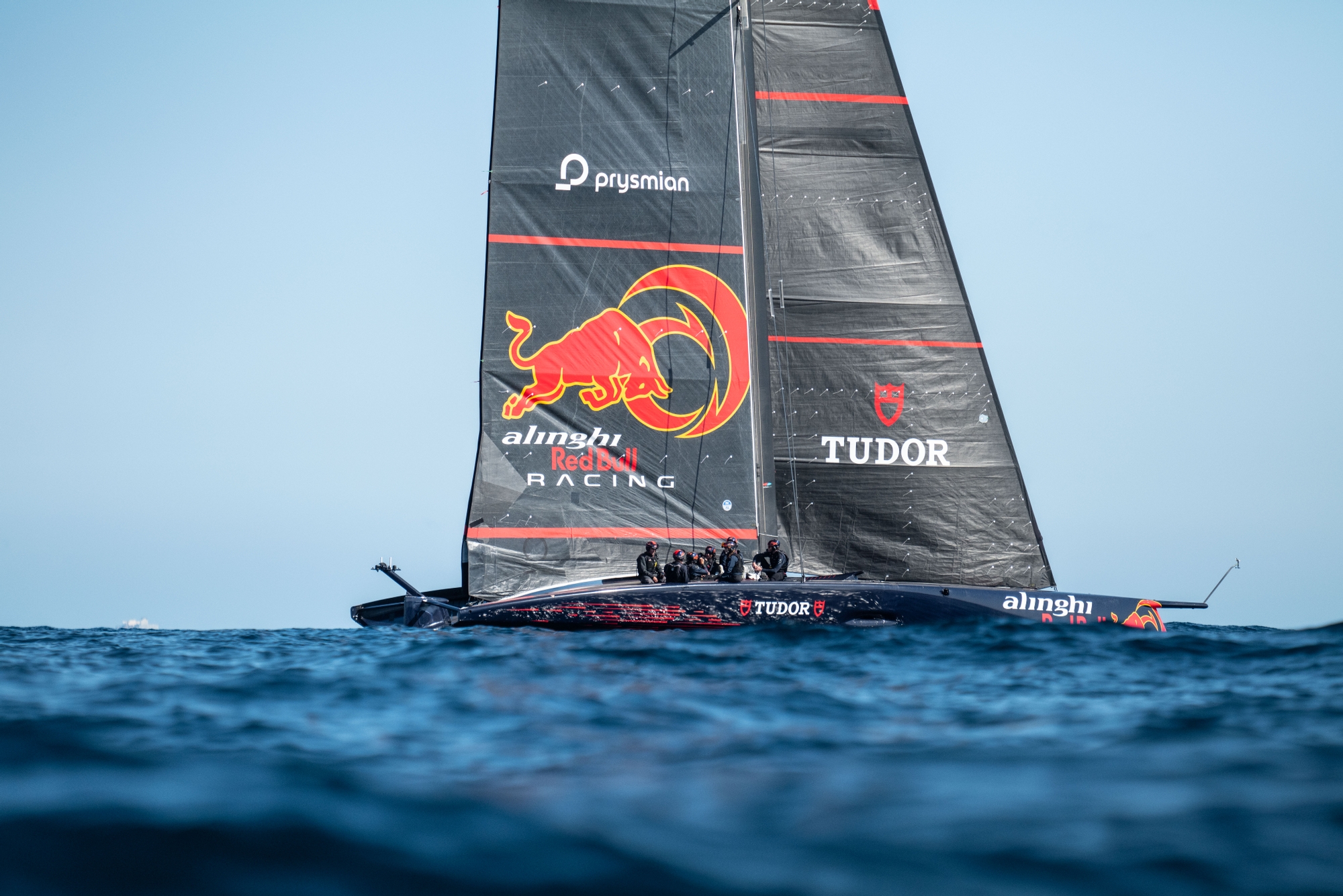 Elsewhere, both Alinghi Red Bull Racing and INEOS Britannia attempted to sail but called it a day as the wind just faded into the early afternoon. The Swiss had some brief moments of flight but realised they were in for a struggle so witched the day and took the fabulous opportunity to let members of the team who wouldn’t normally get the chance to go onboard the AC75 spend some time on the boat. The Alinghi Red Bull Racing ‘family’ were up for a bit of fun too putting their helmsmen Maxime Bachelin and Arnaud Psarofaghis in the cyclor pits and swapping everyone around. Team spirit is everything at Alinghi Red Bull Racing and they all had a smile on their faces despite the weather not playing ball.