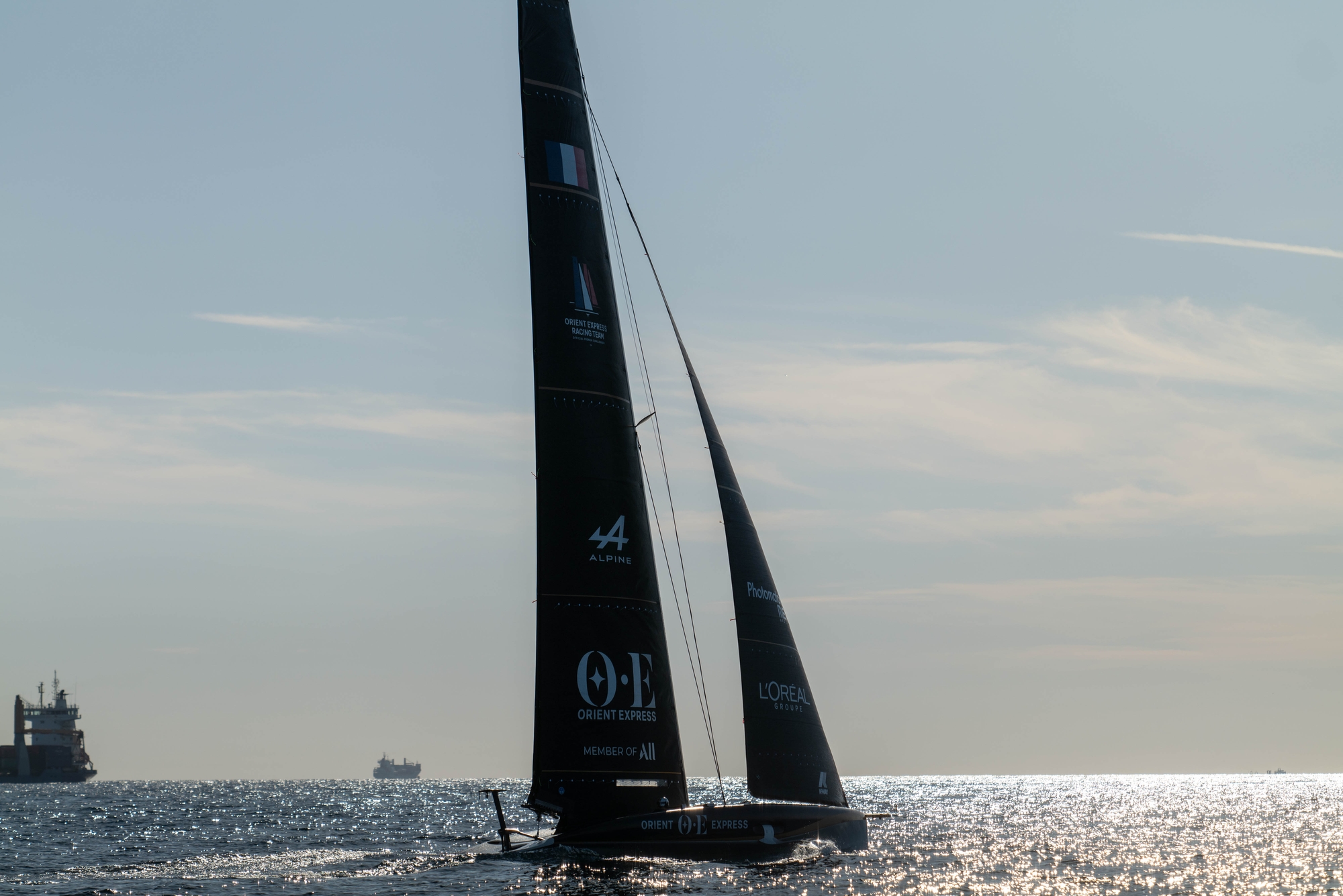 On-Water Recon Report – Orient Express Racing Team: The French Team craned their AC40 to the water at 11:08, that had been left with the mast up and out of the shed overnight. The team docked out at 13.05, as expected. A one-design J1 and the LEQ12-MN-A mainsail were hoisted while heading out of the harbour at 13:08 and 13:15, respectively. A marginal southerly breeze of 4 to 7 knots of intensity prevailed during today’s session, combined with flat water conditions.