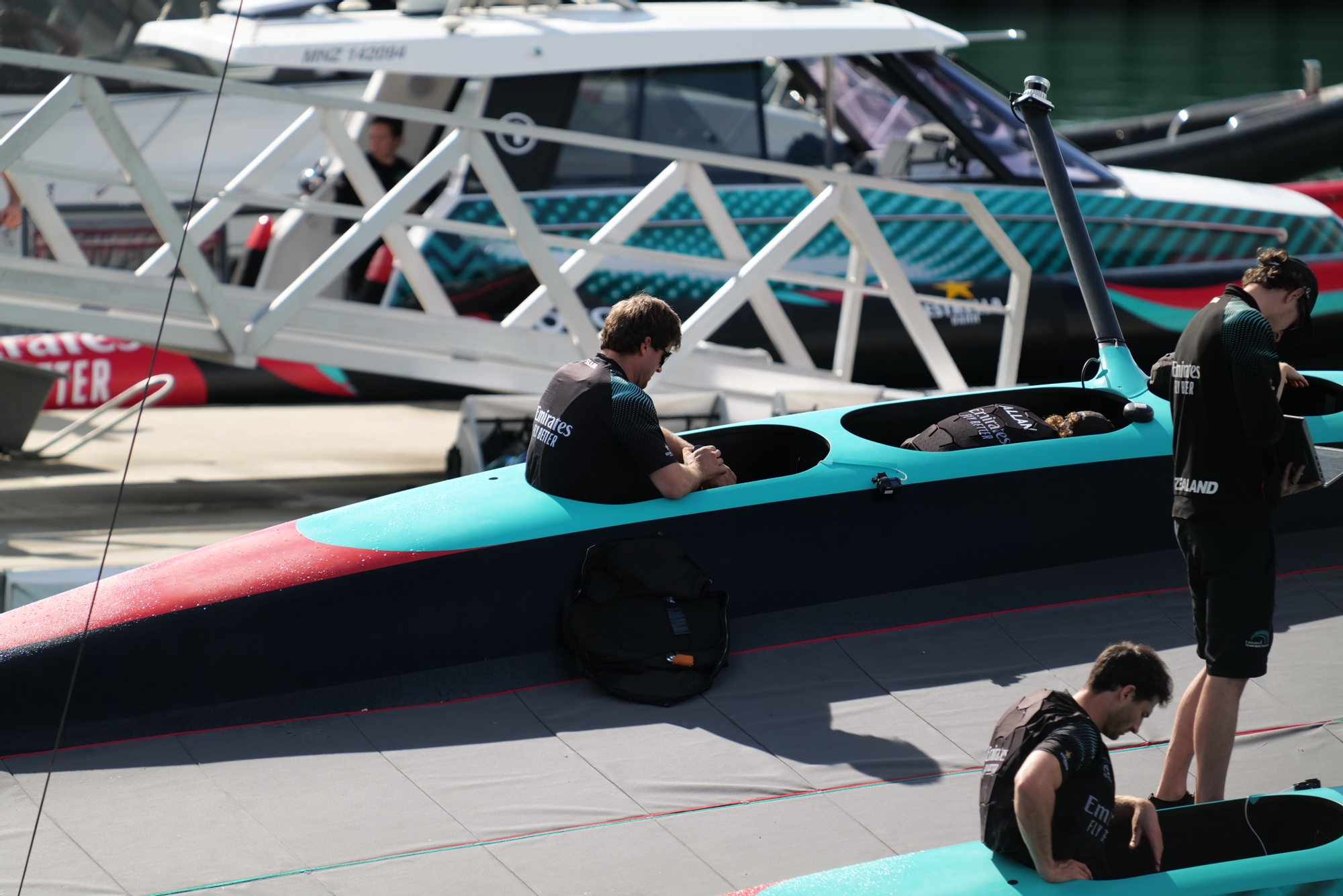 The team then went for a 25-minute sailing session, completing working back towards Takapuna Beach and running down the northern side of Rangitoto Island. Spending time working through manoeuvres. Coming out of a tack, they touched down and proceeded to stop. With Chase 1 alongside, a cyclor swap was completed as well as a change to the Jib head lashing. Stopping for 15 minutes.