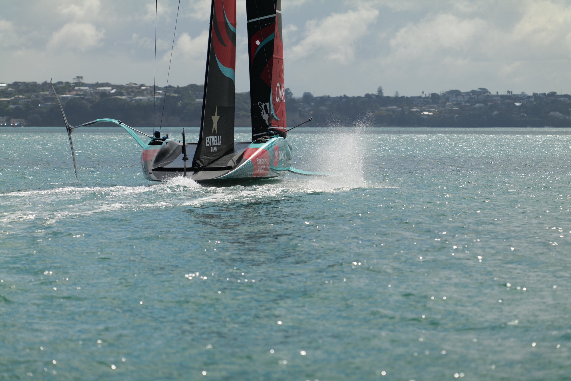 The third day of training for Emirates Team New Zealand down in Auckland on a flat calm Hauraki Gulf was perhaps the most interesting as the sailors began to throw the boat around and put it through its paces over short laps. What we’re seeing is a boat that’s highly manoeuvrable and in the very light has the agility to just stay on the foils where the previous generation would have sunk to displacement.