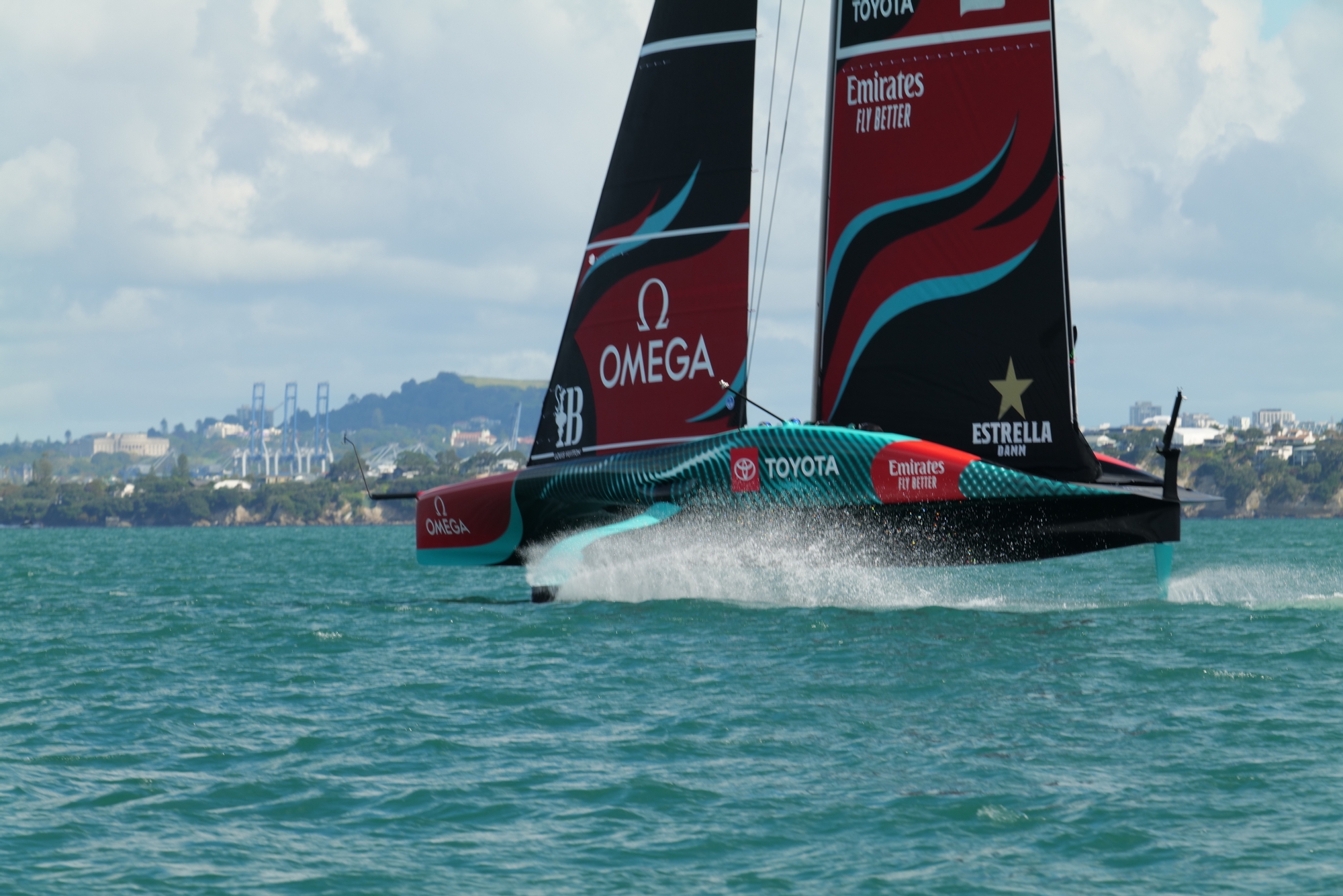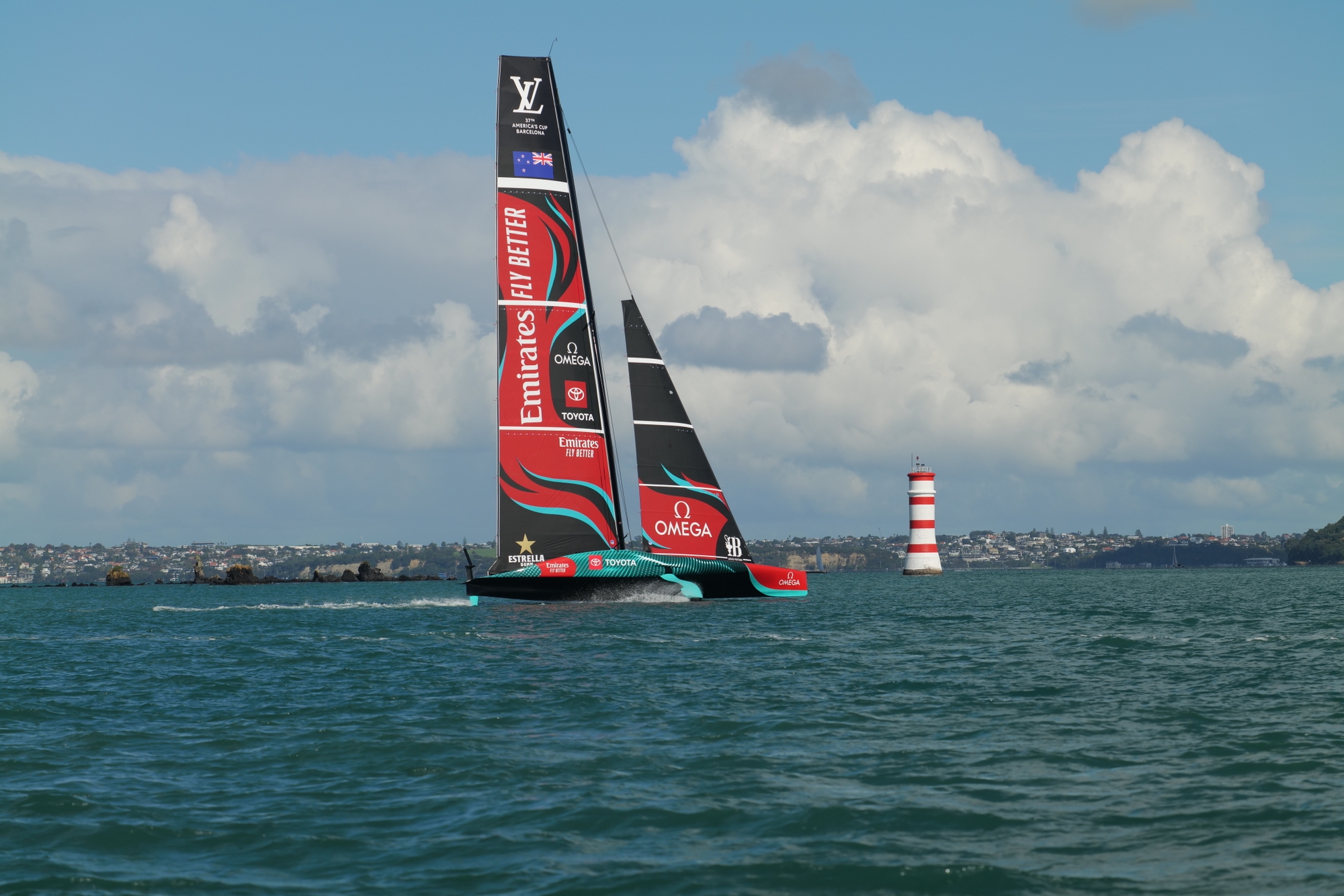 On-Water Recon Report – Emirates Team New Zealand: Day 3 for Emirates Team New Zealand’s new AC75 started with a very light south-westerly breeze. The boat rolled out of the shed at 8:40 am, and the team started the now-standard setup procedure. However, having some problems manoeuvring the boat under the crane as there had been some lifting equipment breakdown. Leaving the dock at 11:00am, the team towed down the harbour and out towards Rangitoto Lighthouse.