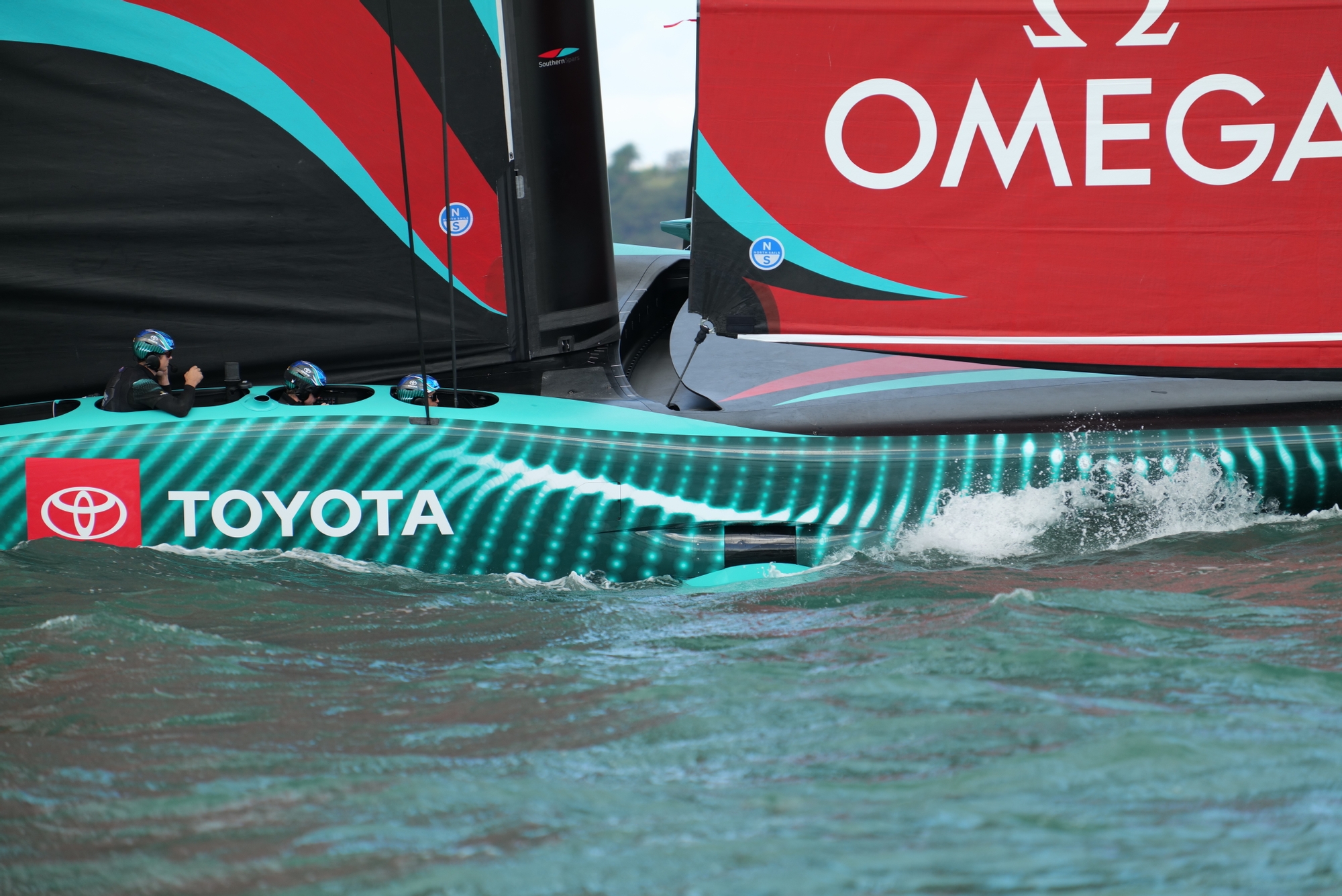 The almost unseen power unit is delivering from the aft pods what looks like plenty of control and already we’re seeing sail shape manipulation, perhaps through early pre-sets, that makes boat-handling look a cinch. Going from downwind into fast round-ups, the Kiwis play their calling card of making the one-board turn seem routine with the mainsail powered down to a flat board from an open leech and the jib coming on efficiently. Upwind, it’s all about the end plating with the middle third working hardest, hunkering the boat down and anchoring it to the water’s surface with a deftness of bustle skimming.