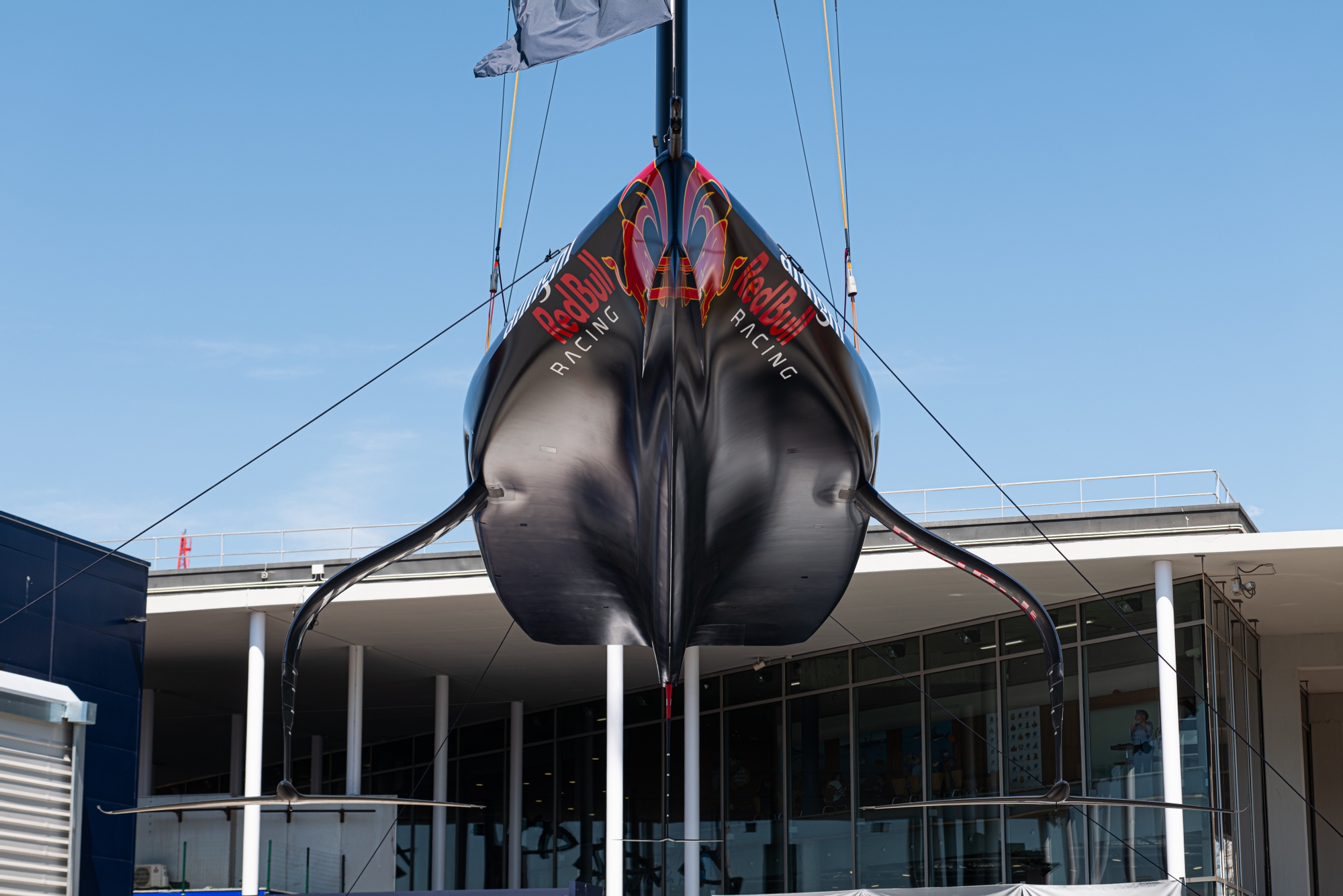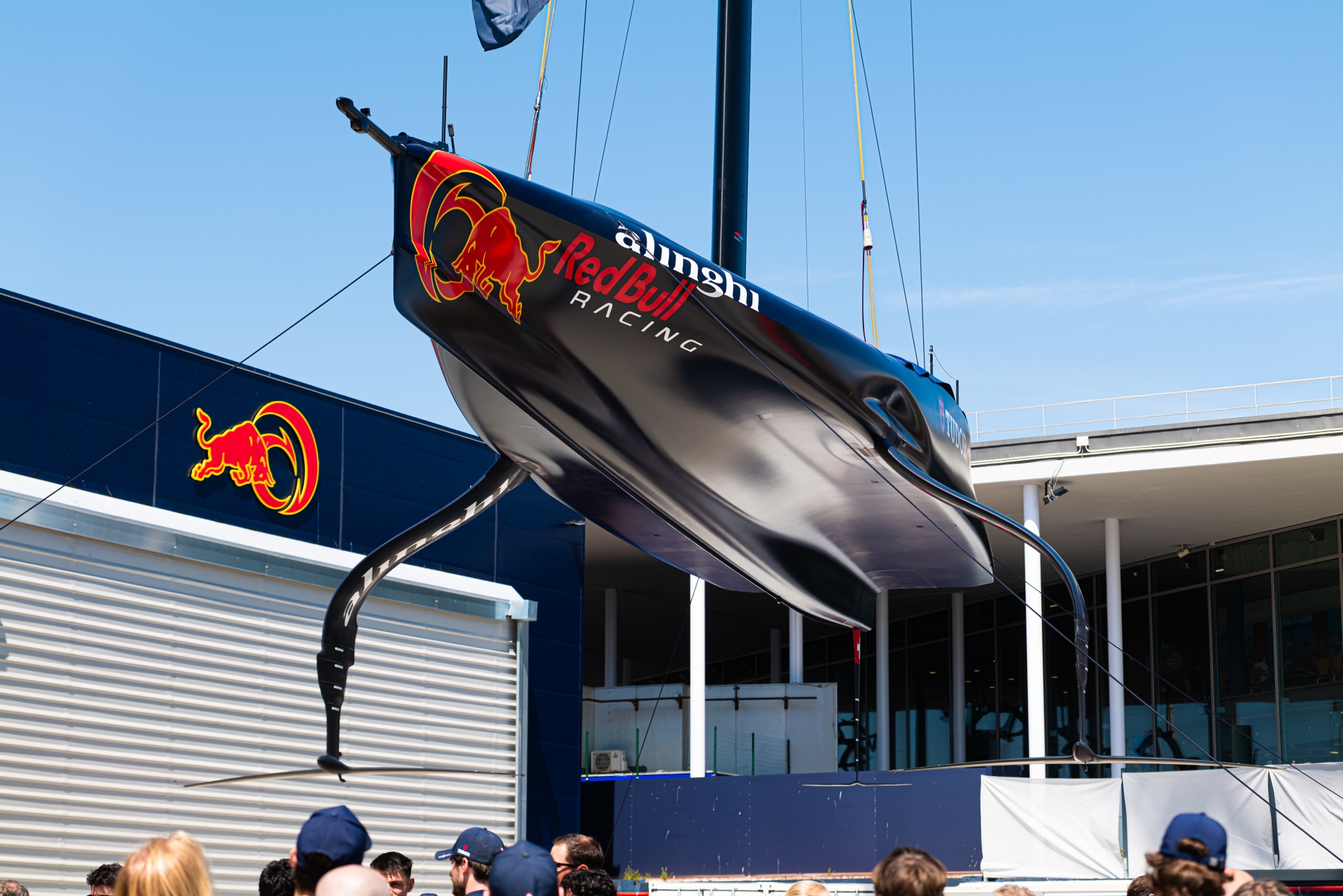 Alinghi’s bow features a chine (step on the surface) about one-third of the way up from the skeg.