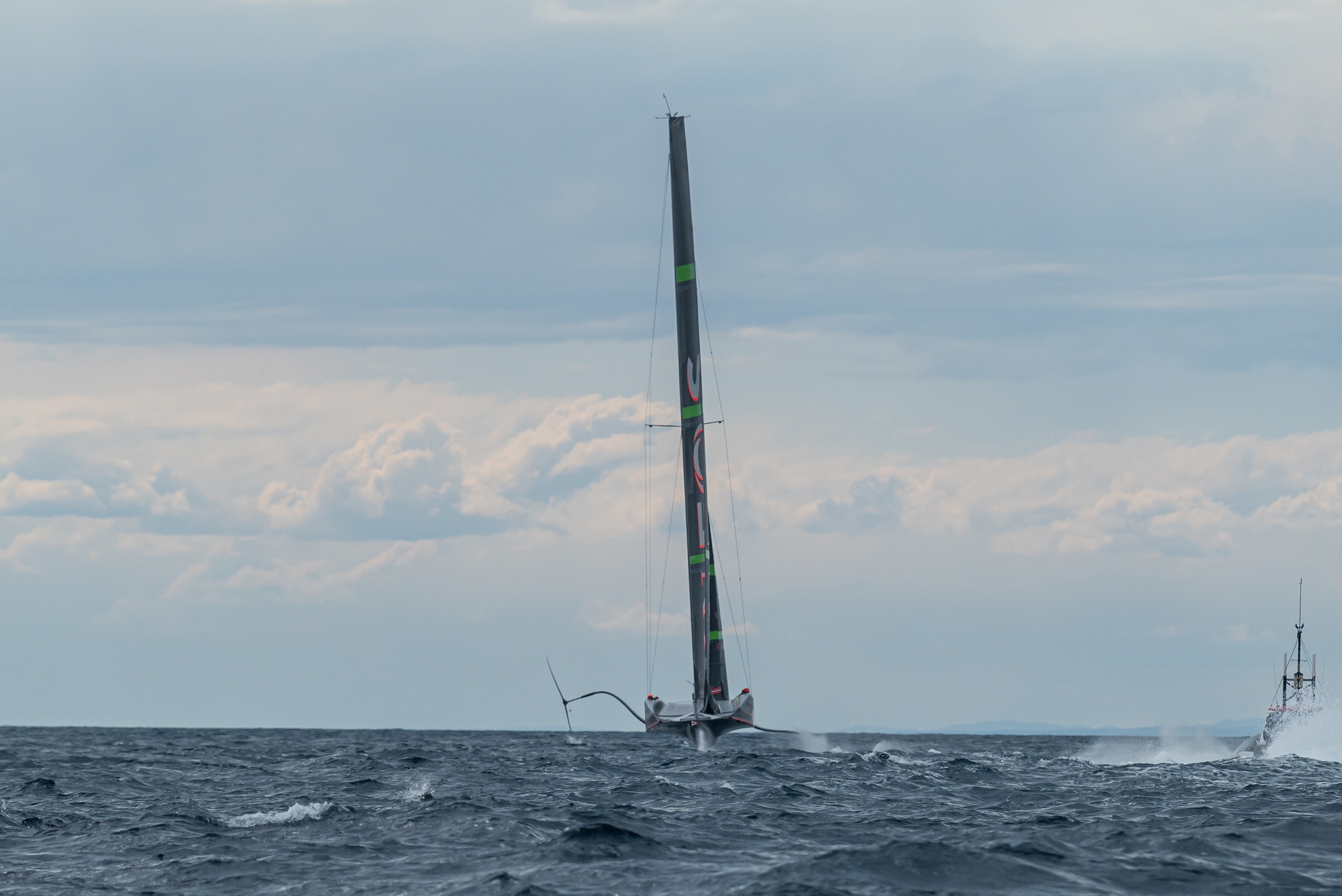 INEOS Britannia had some problems hoisting the J5-1 - the first time this jib was being hoisted so they needed time to adjust all the settings. When they were ready to sail, the wind shifted to TWD 240° and was quite gusty in between 10 and 16 + knots. The wave state also increased a little bit more. RB3 foiled for three long upwind tacks with the J5-1 jib at stable speeds of 30+ knots. They did two touchdown tacks and then by the beginning of the third tack we could see the boat foiling suddenly quite high but under control. They stopped, had a quick briefing with the Chase Boat and started dropping the sails at 17:15. Around 17:35 the Chase Boat started towing the boat back to the base and dock in was complete at 18:20. Jose Piñana - AC Recon