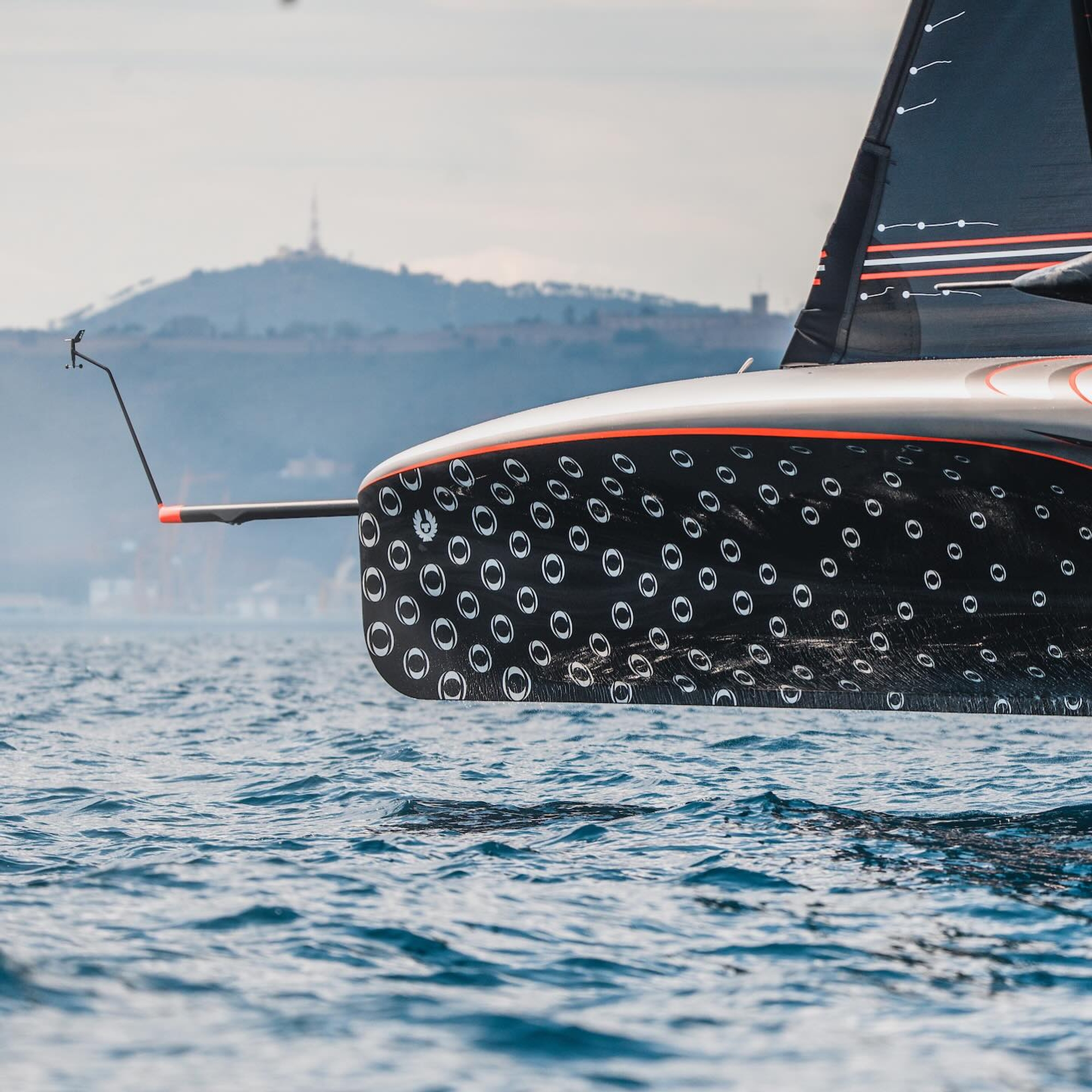 Technicians from the INEOS Britannia team were double checking all systems before getting back into the Chase Boat and at 14:10 RB3 started sailing on port side in displacement mode, checking all systems were working fine. They tacked and checked the systems on the starboard side and when they were completely sure all was working, they started sailing at an 80-90º course, slowly trimming the sails so RB3 started foiling for the first time on starboard tack. We observed that when they started to foil the boat naturally wanted to pitch forward so the bulb from the bow (hull) was touching the surface until that was corrected by the flight controller through the rudder rake (we guess). Once the crew managed to have the boat in equilibrium with all the skeg out and in parallel to the sea-level the boat started accelerating. The boat was progressively gaining speed until they got to a stable + 30 knots sailing upwind. Wind at that time was 8-12 knots TWD 190°. They went back into displacement mode and tacked.