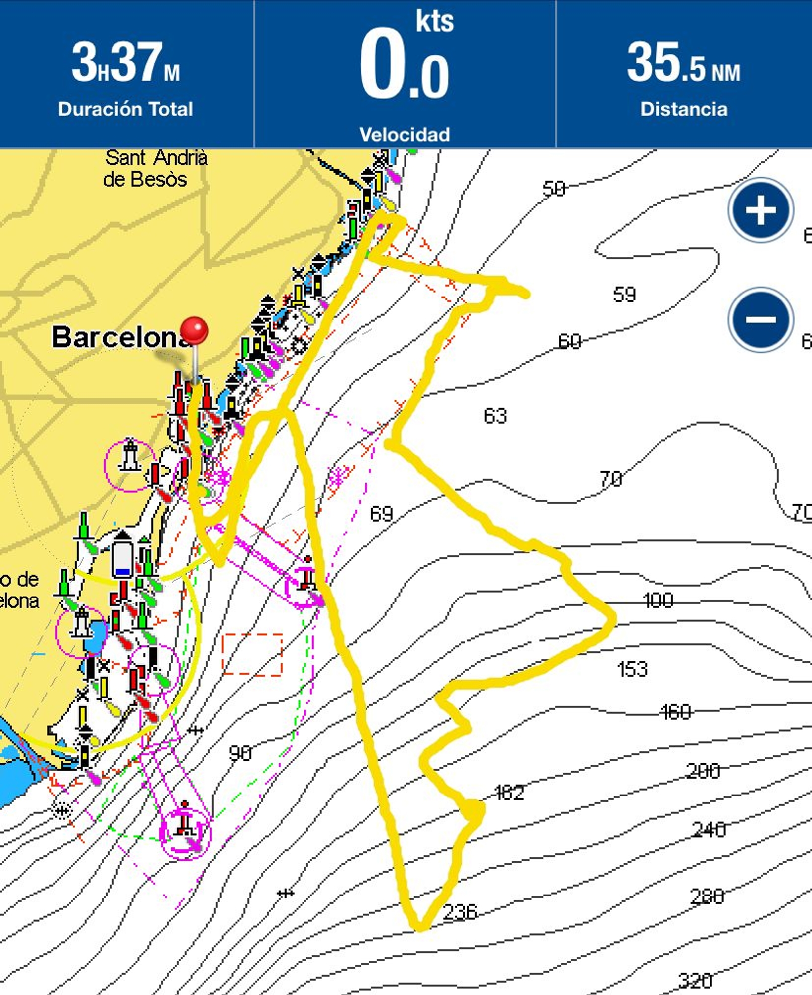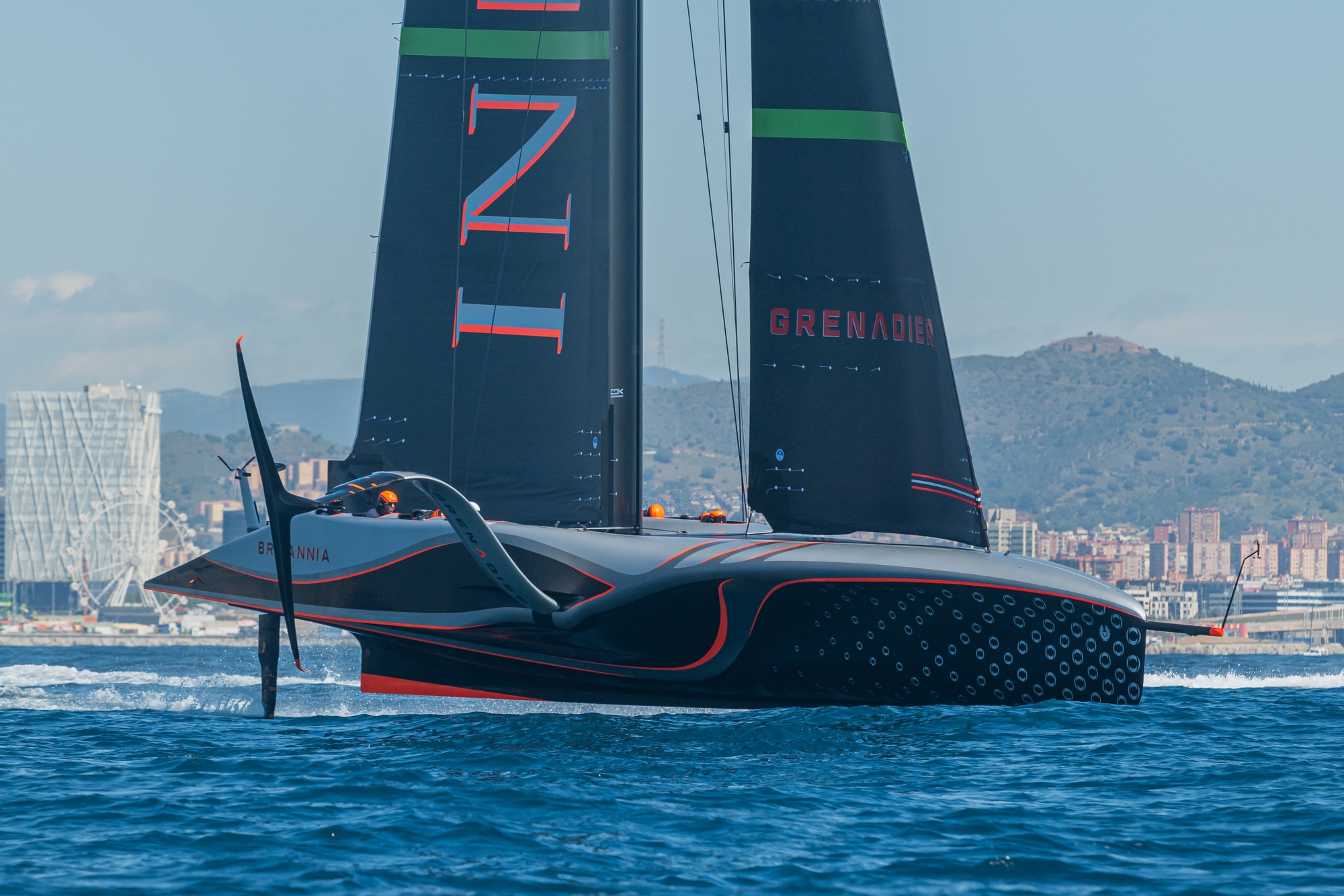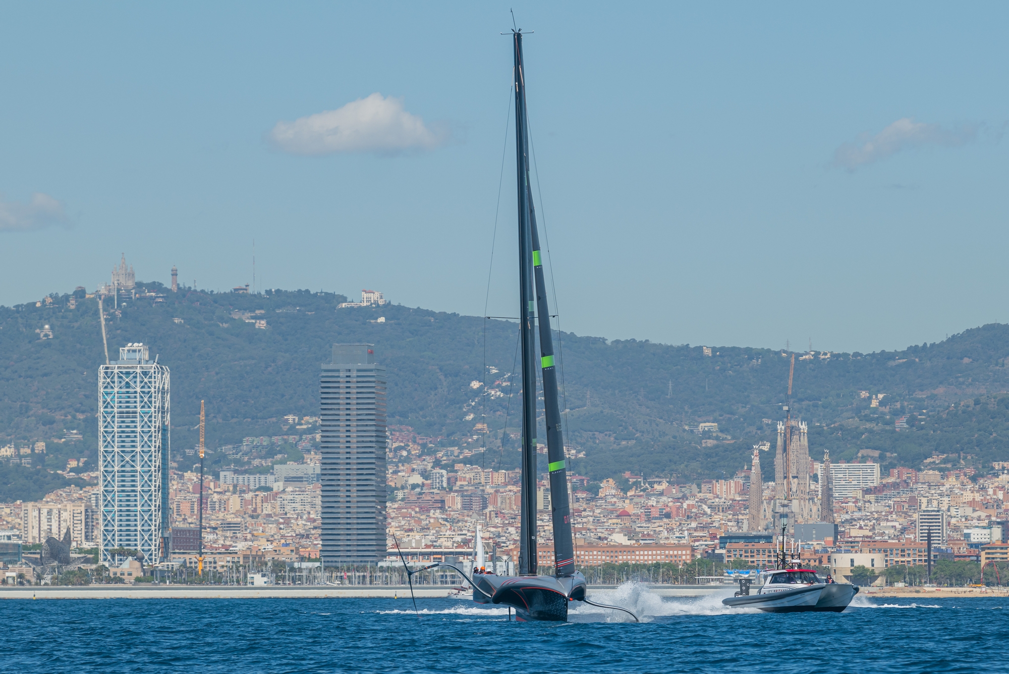 On-Water Recon Report - INEOS Britannia: INEOS Britannia docked out today at 9:45, hoisted the mainsail M2-1 and towed RB3 to the same spot in front of Badalona harbour, like in previous sailing session. There they hoisted J2-1 jib. Wind was blowing in about 5-7 knots TWD 180º @ 10:30 and there was a symmetric swell to the wind of about 1 to 1.5m round and smooth. They foiled for a total of 7 tacks (14 miles). On the first tack, they were barely foiling and spent some minutes checking systems before they began to foil. After that, they continued sailing in a semi-foiling mode until they tacked. They sailed with the jib quite open and hardly pumped the mainsail to achieve take-off.