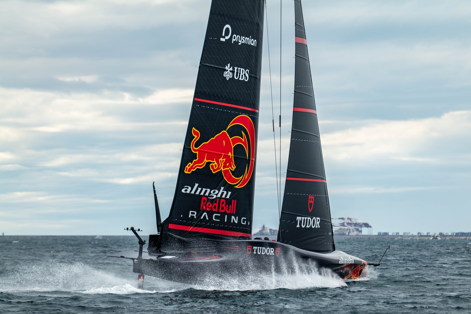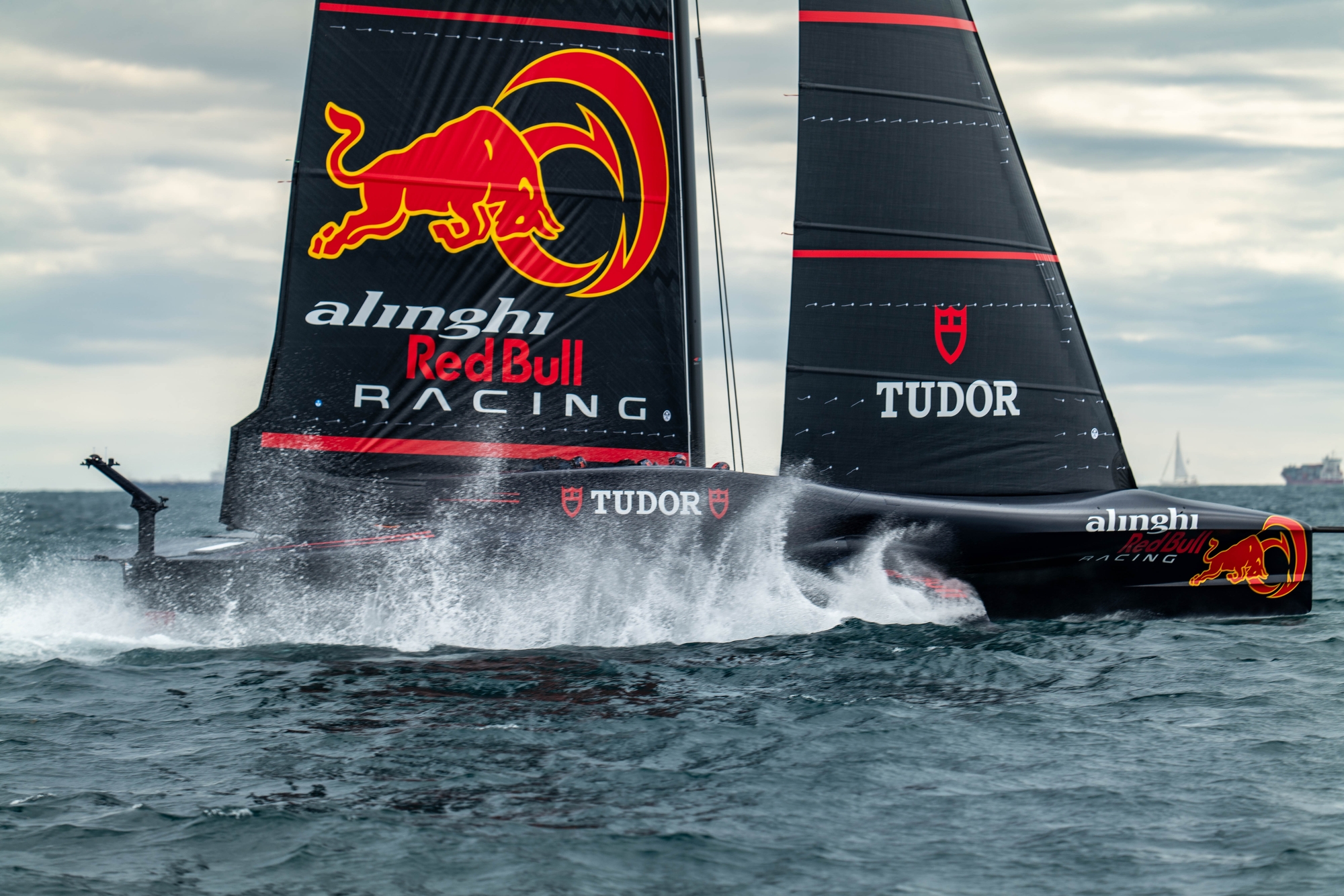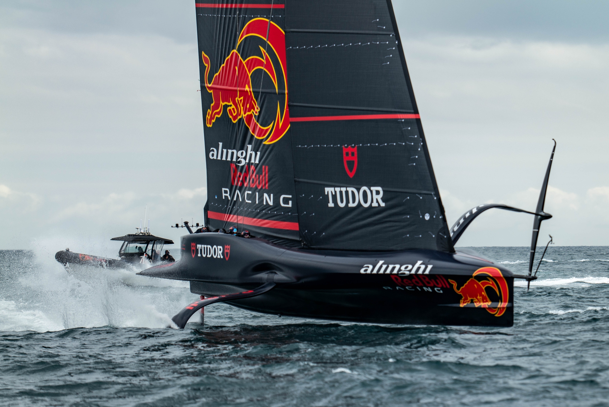 On-Water Recon Report – Alinghi Red Bull Racing: The Swiss rolled out their AC75 at 10:00. The boat was craned to the water at 10:22 and the team docked out at 12:00, as planned, after usual routine activities under the rain.