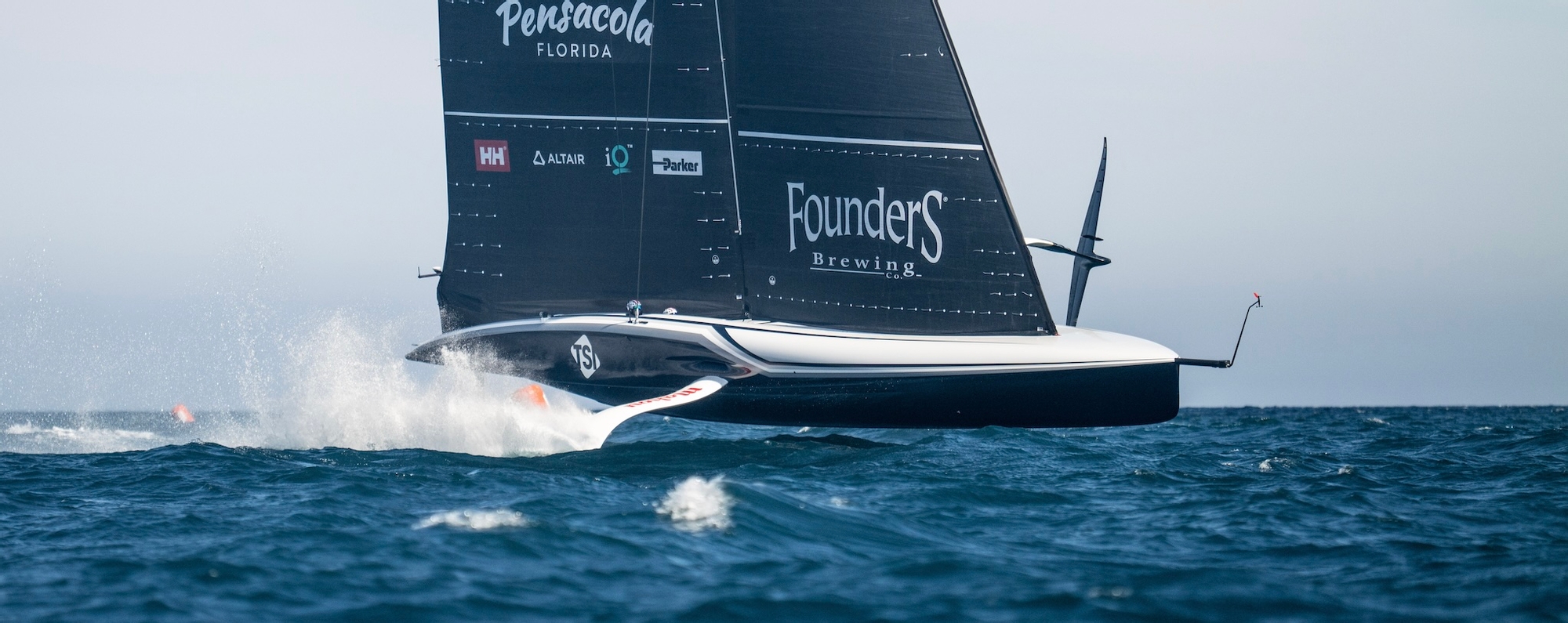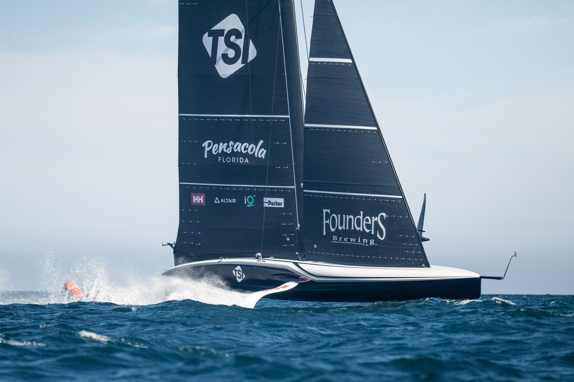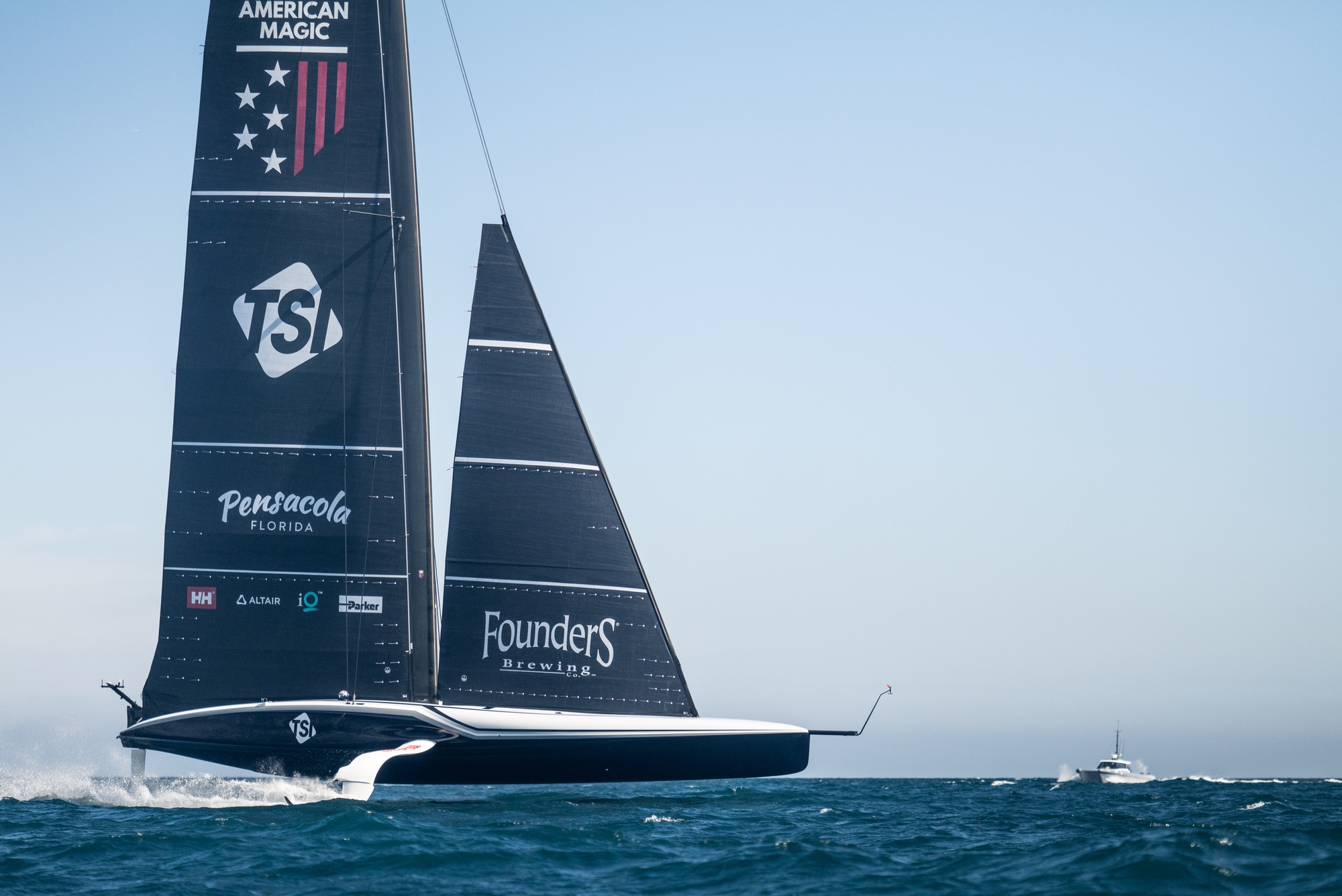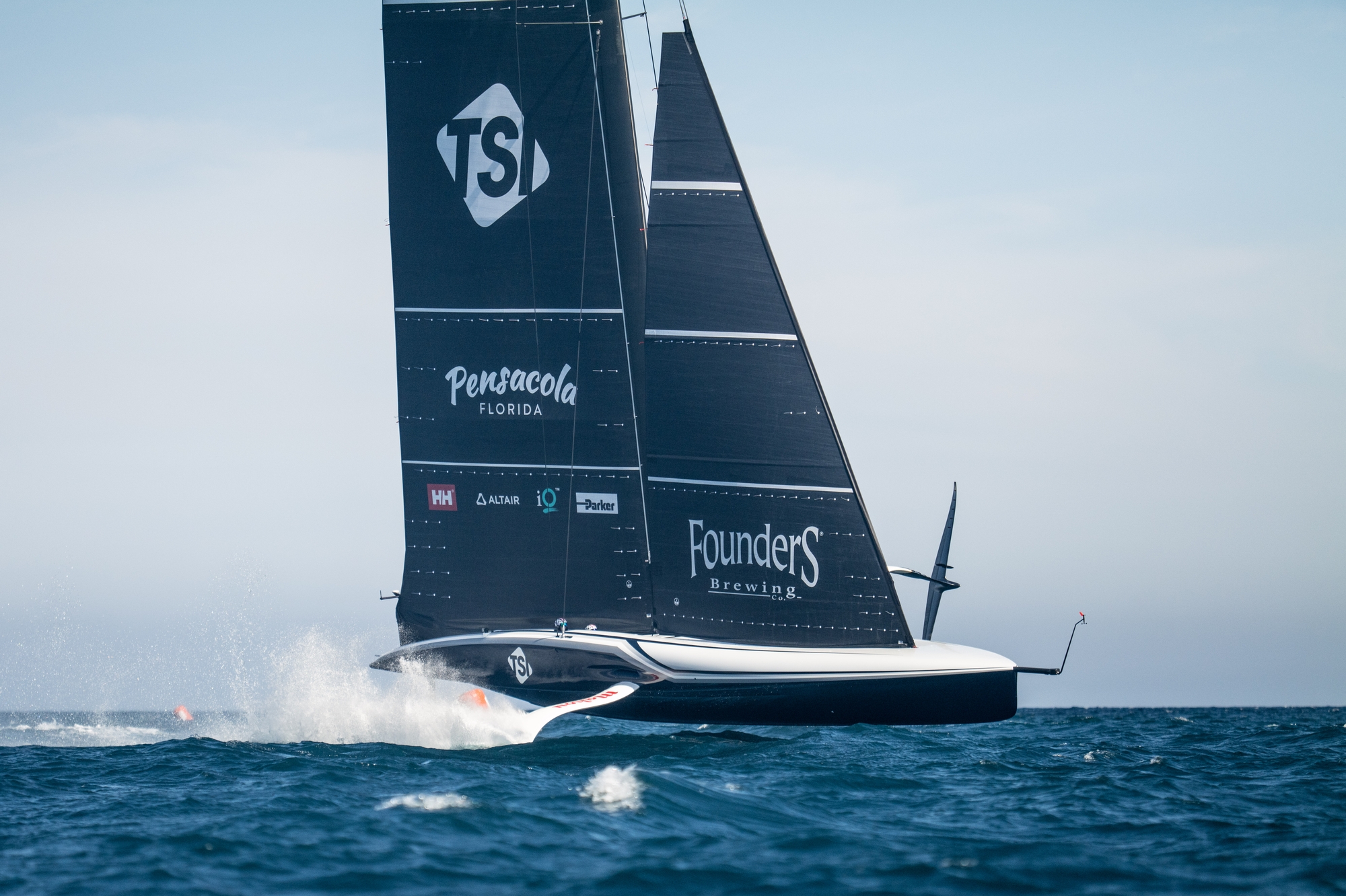 Patriot stopped on various occasions for the tech team to come onboard – clearly there are minor gremlins still to iron out, but they were soon sorted, and the sailors then set up for some laps of a laid racecourse where, apart from the speeds, the big take-away was the insistence on two-board roundings at the leeward marks for safety first. That will be something they will hone, in the coming weeks, but ‘Patriot’ is still effectively in a commissioning phase. Just after 5pm, as the session was coming to a natural conclusion after a cyclor rotation, the day came to an end when the head exploded of the J4-1 – perhaps an indication of the very high halyard loading they were running to flatten the sail. The boat came to a standstill and sails were down at 5.30pm ahead of a tow back to base.