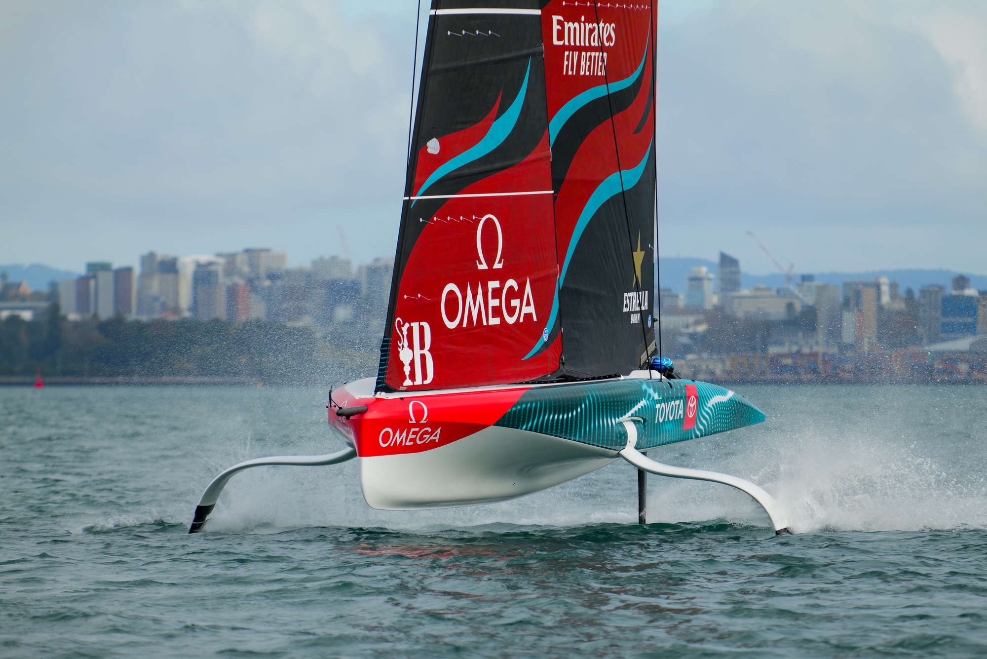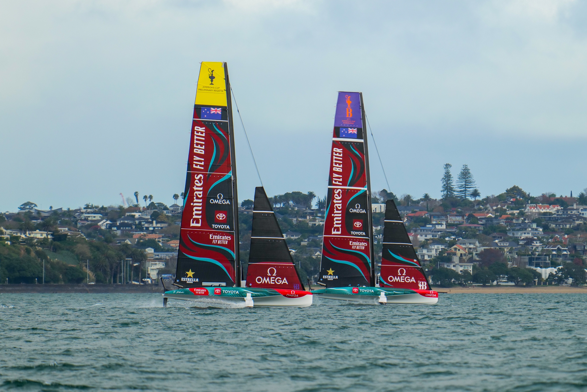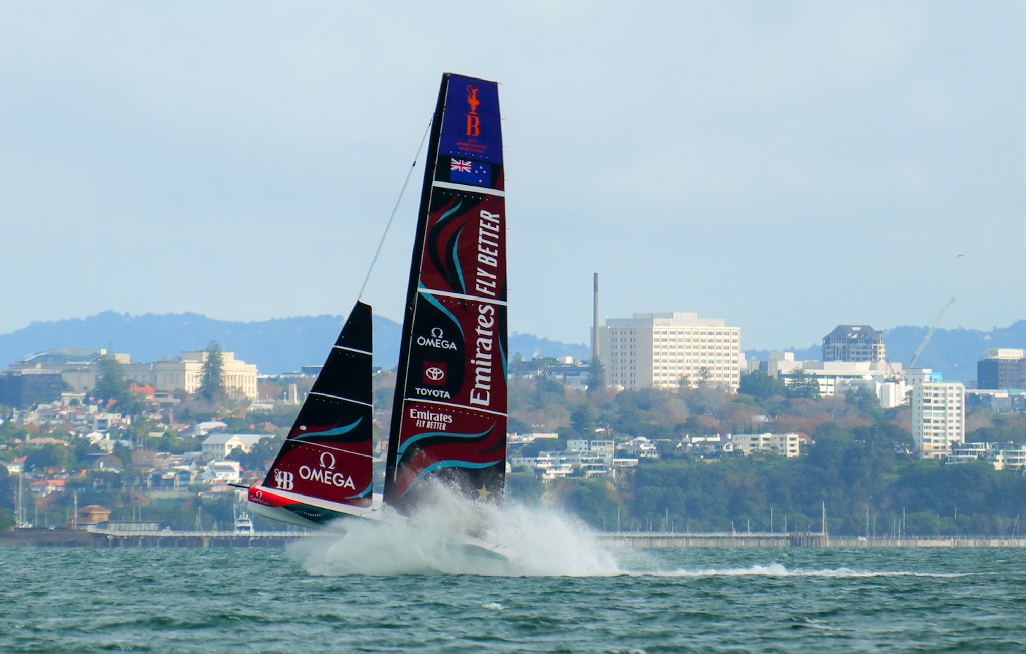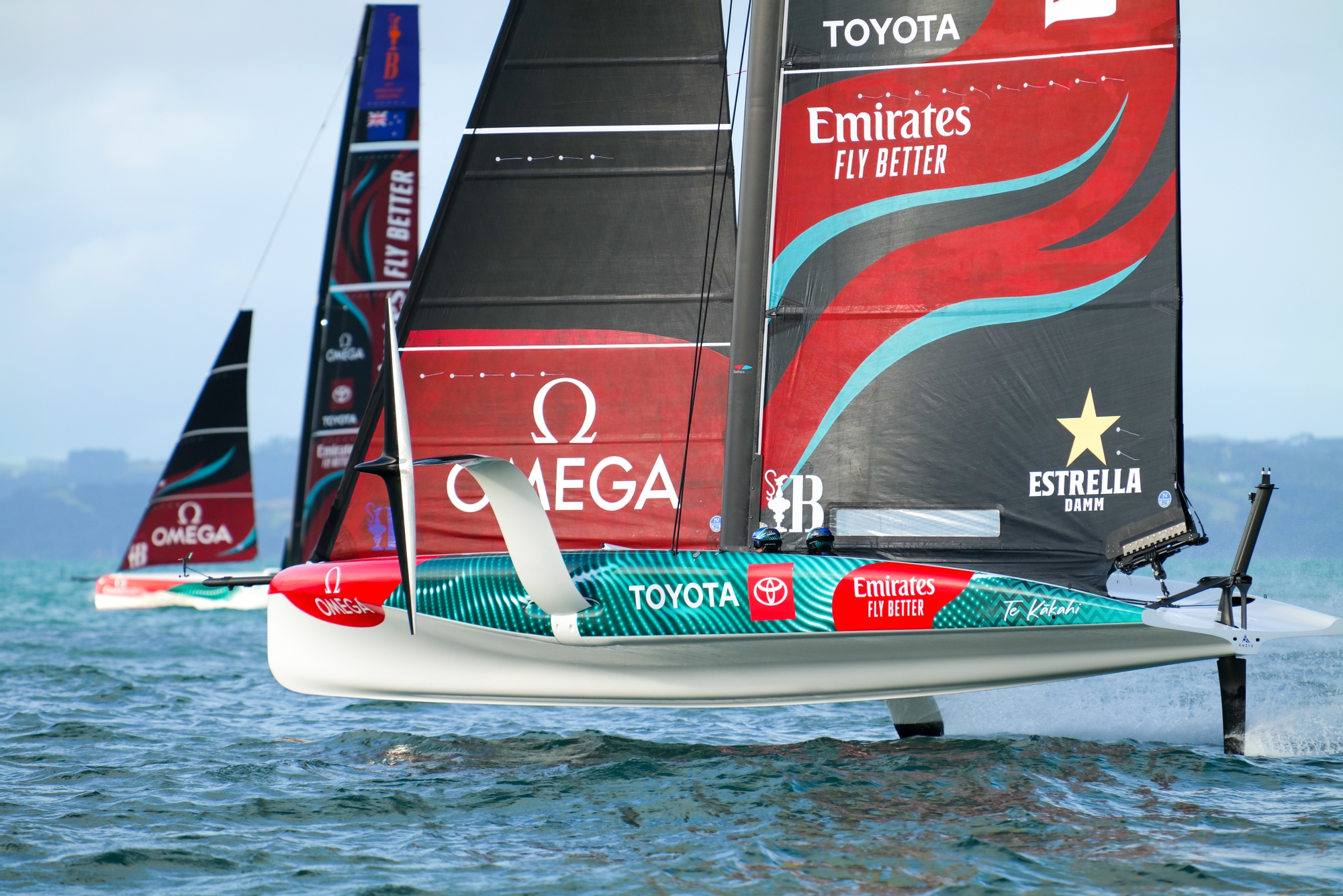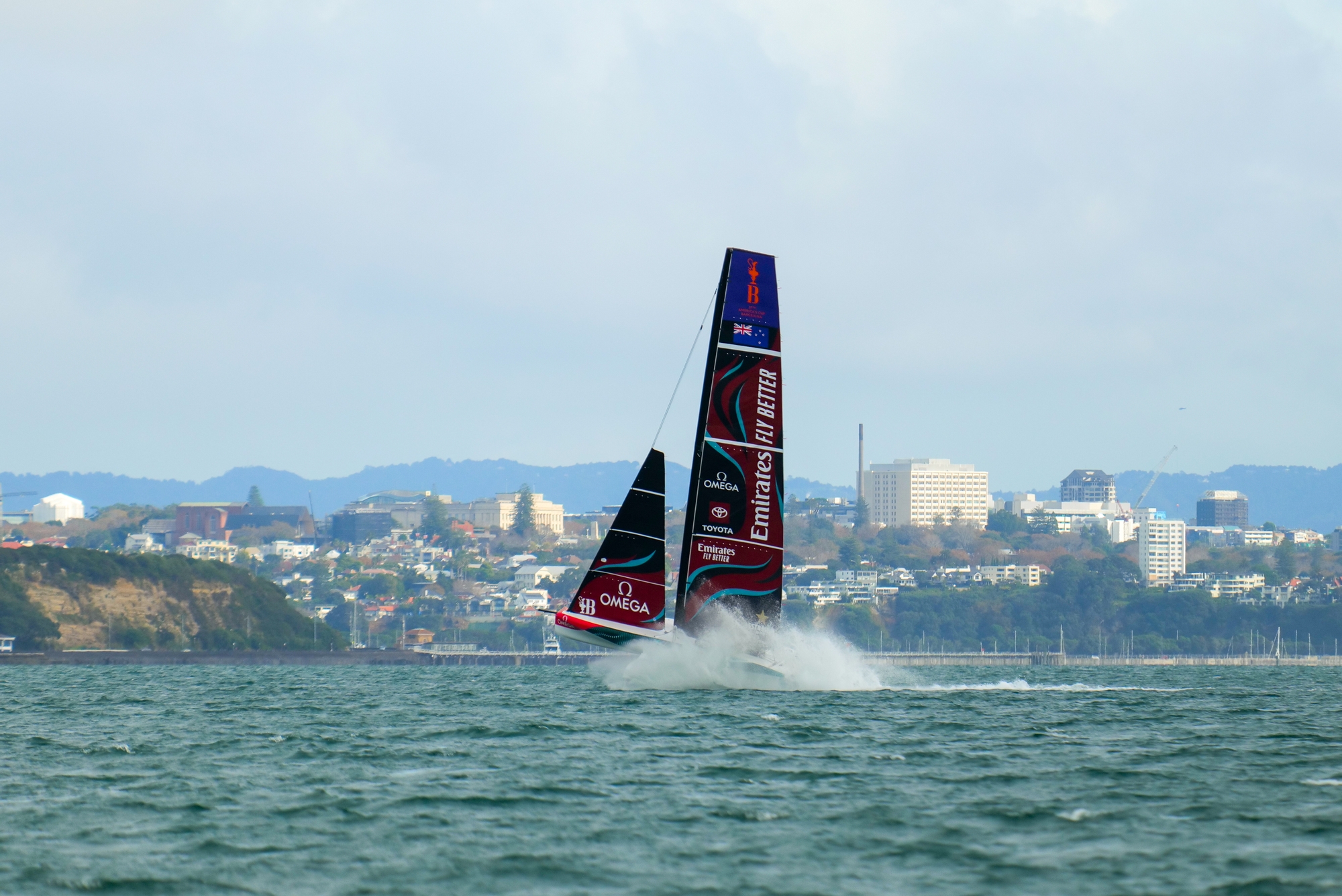 On-Water Recon Report – Emirates Team New Zealand: Emirates Team New Zealand headed out onto the Hauraki Gulf this afternoon for a two-boat testing day. Towing down the harbour and hoisting M2 and J3 in Mechanics Bay, the team got started sailing, heading downwind and meeting the AC40 OD that had been out for the morning of sailing with the Youth Team.