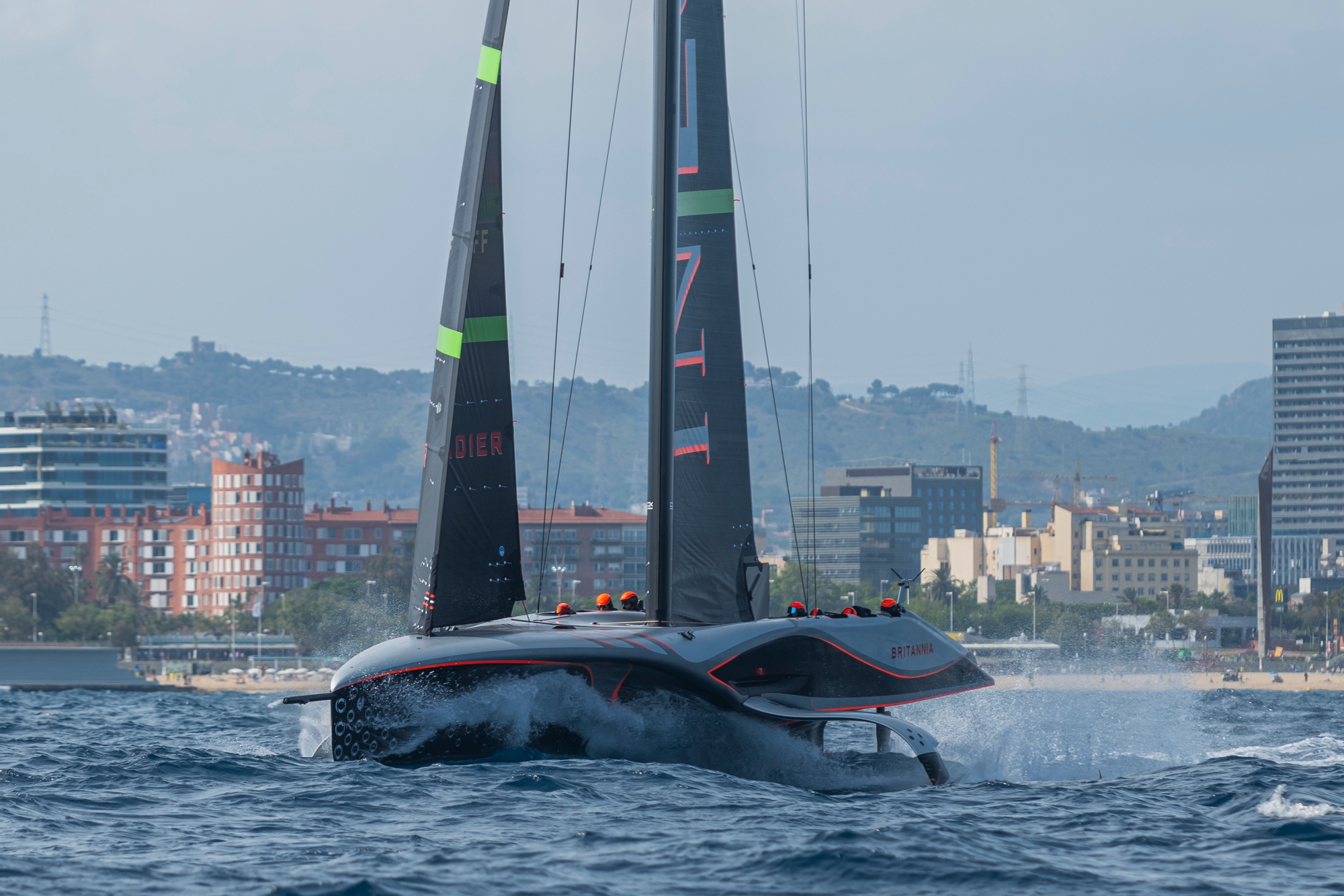 Having docked out at 11am, INEOS Britannia was first to the racecourse area just off the Barceloneta beachfront and initially went in for some fast training with the team pushing the platform harder and harder. Sir Ben Ainslie and Giles Scott looked immense sailing together, transitioning well and nailing the manoeuvres both upwind and downwind. A possible collision with a piece of floating debris made the session feel dis-jointed but safety first, the team spent some 90 minutes checking that all was okay with Britannia before resuming sailing.