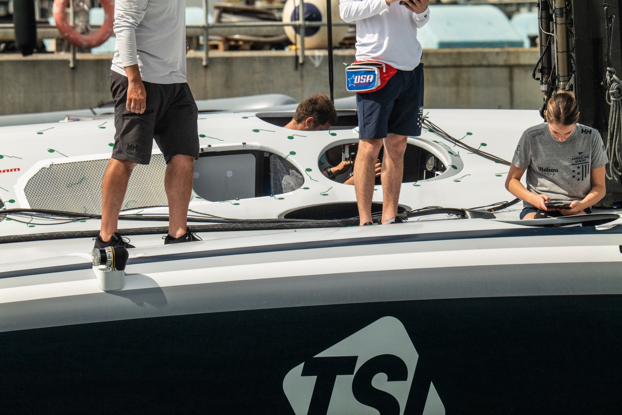 Same cameras as last sailing session were installed on both port and starboard foils. LiDAR cameras for the mainsail and jib were also on board. We could see also that a spray protection had been installed for the trimmers pods.