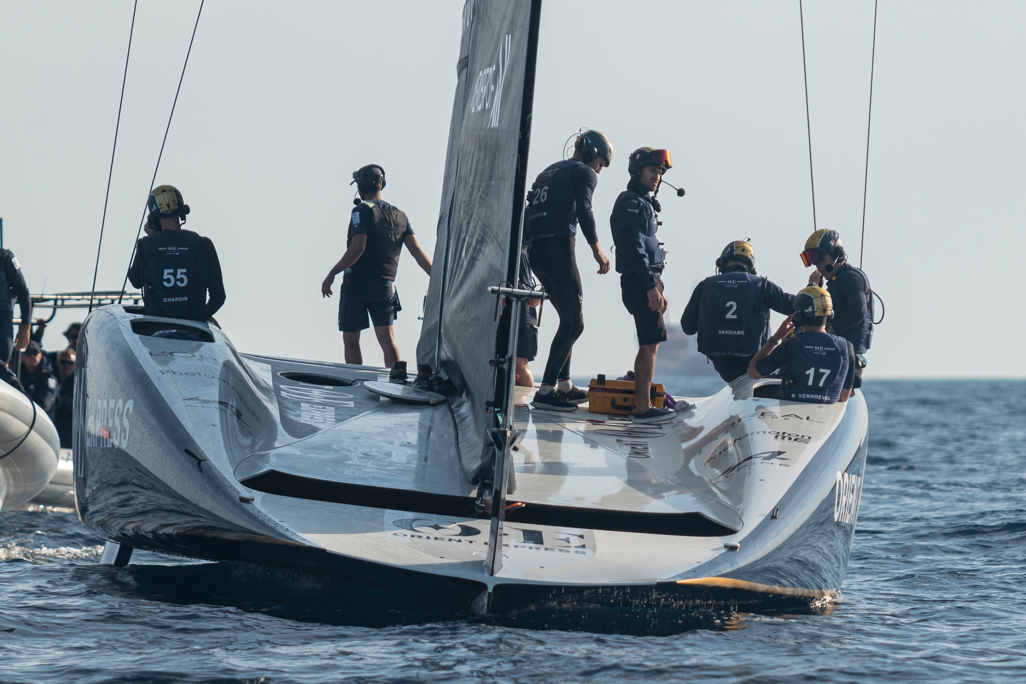 Once on the water, more gremlins crept in and they delayed the hoist, drifting slowly down towards Port Olímpic under tow but with the mainsail set, everything came together and with the J3-1 jib set, Quentin Delapierre gave the all-clear for Mathieu Vandame and Jason Saunders to trim on and up she went beautifully on the foils. A tack over gave Kevin Peponnet a steering chance and the boat looked balanced and lively with a beautiful set of sails that could be trimmed flat as the speeds rose. Epic first sail for the French and plenty of happy faces on the support boats.