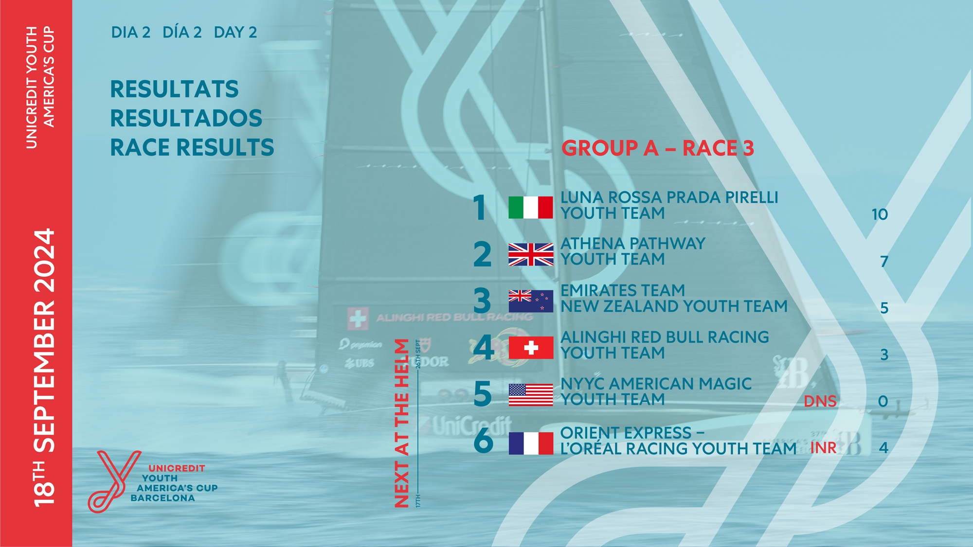 Luna Rossa's two victories today sees them extend their lead at the top of the Group A leaderboard to 12 points ahead of NYYC American Magic in second and Great Britain’s Athena Pathway in third.