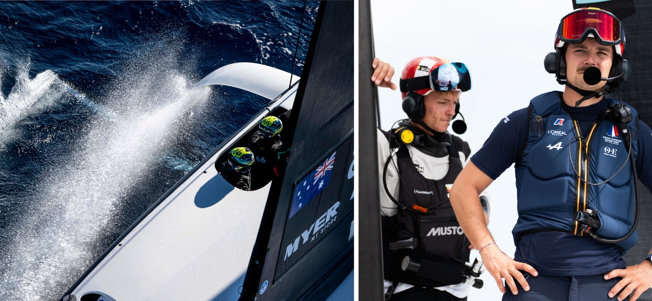 LEFT: Team Andoo Australia sailing in Barcelona during the UniCredit Youth America's Cup in 2024. Photo: © Ian Roman / America's Cup. | RIGHT: Enzo Balanger during the dock-out. Photo: © Beatrice Colombo / America's Cup.
