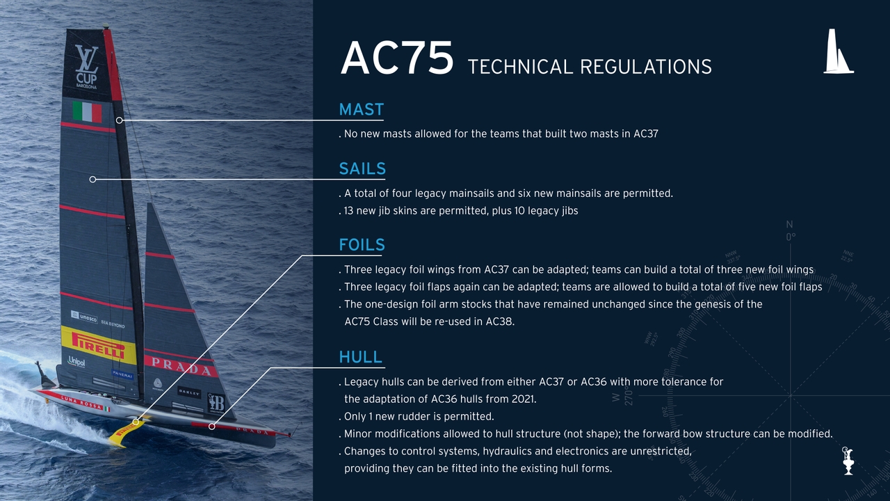 The decision has been taken to race in Naples with hulls from the Louis Vuitton 37th America's Cup (or modified from the 2021, AC36 versions). In addition, a strict criteria has been implemented with regards to componentry whilst radically changing the internal structure of the yachts by eliminating cyclors in favour of stored energy. What was recognised in detailed analysis was that the hulls themselves represented only minimal advantages, barely recognisable in practice. Furthermore, active cost containment measures in terms of overall team budgets has been laid out in the AC38 Protocol.