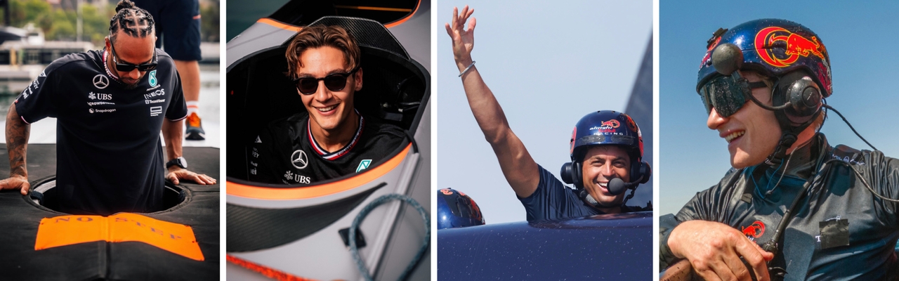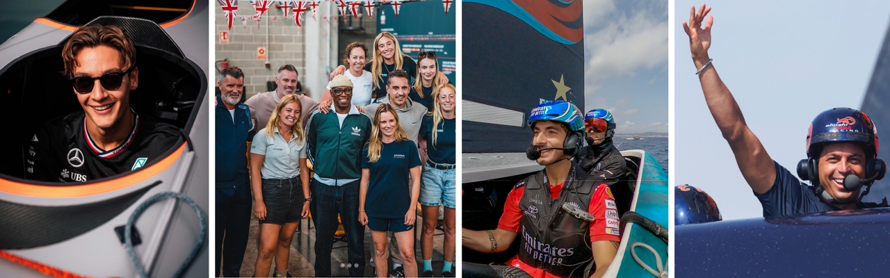 From left to right: George Russell on INEOS Britannia. Roy, Wrighty, Carra, and Gary from The Overlap saiilg with Athena Pathway. MotoGP World Champion Pecco Bagnaia aboard Emirates Team New Zealand's AC40. Kai Lenny joining the sailing team of Alinghi Red Bull Racing during training for the Louis Vuitton 37th America's Cup in Barcelona. (Source: Instagram @athenaracinggbr / @athenapathway / @emiratesteamnz / @teamalinghi)