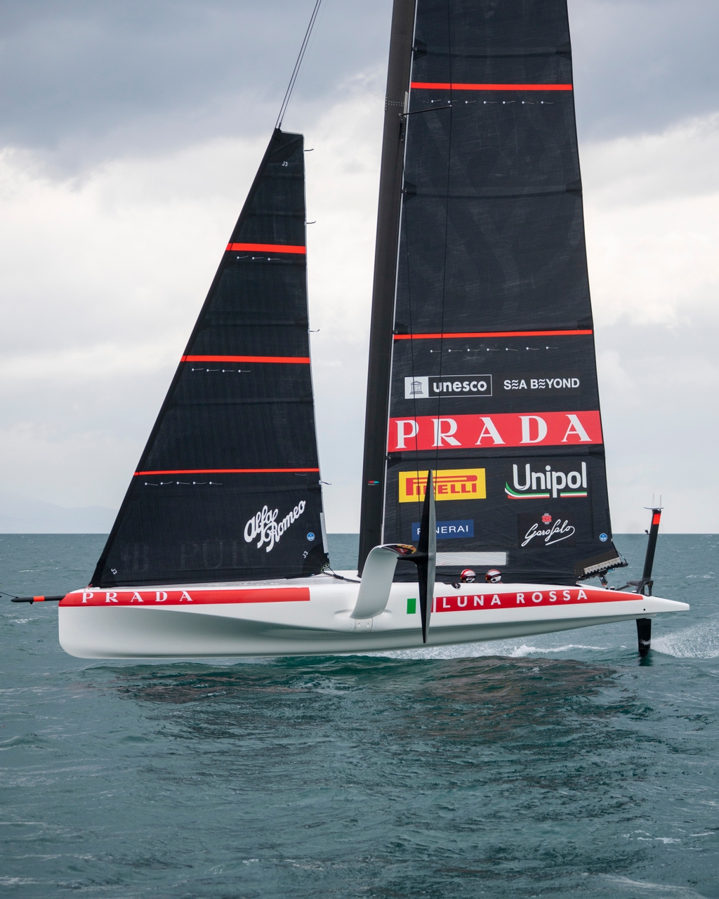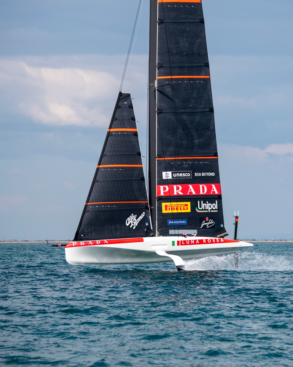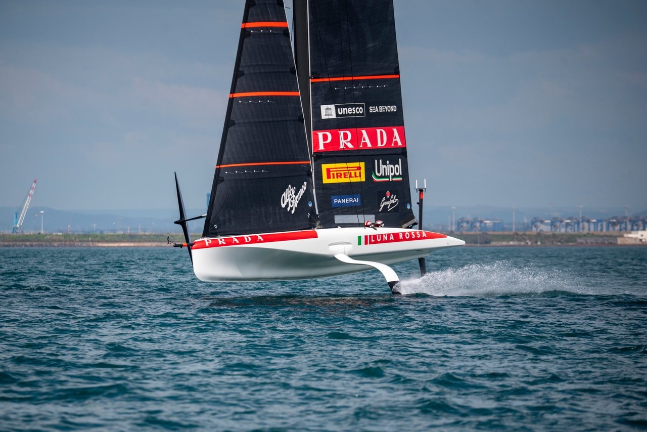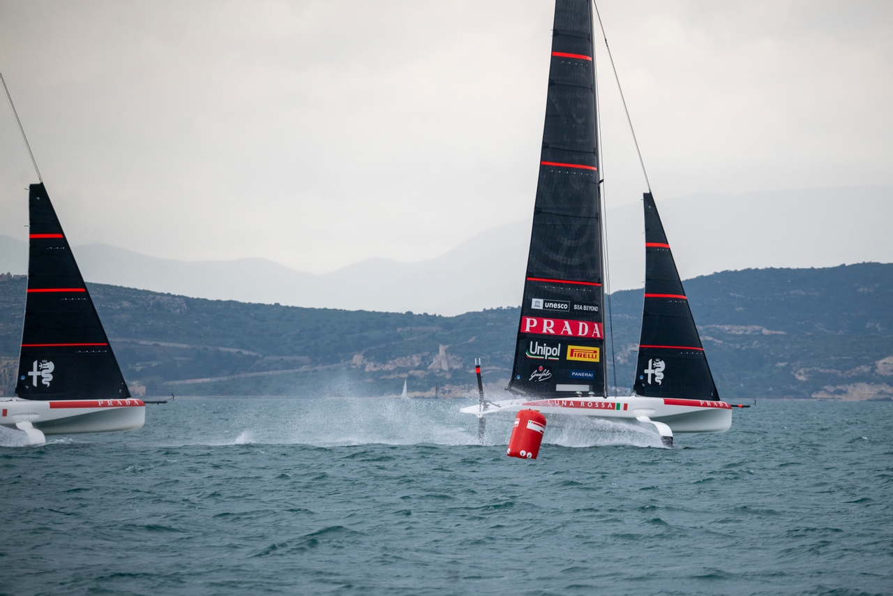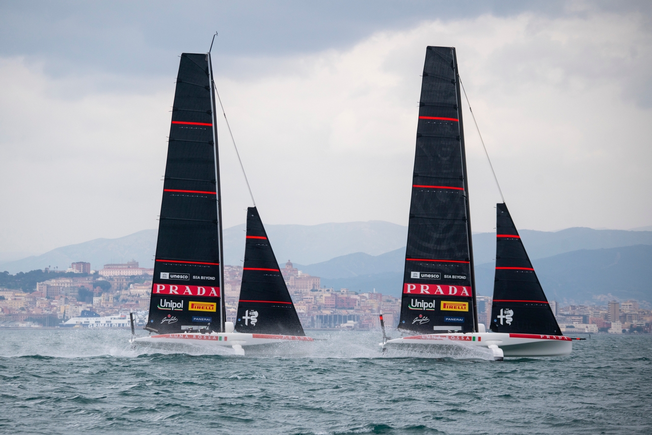 Taking full advantage of some outstanding conditions in Cagliari, Sardinia, the venue for the first Louis Vuitton 38th America’s Cup Preliminary Regatta from May 21-24th, both the Challenger of Record, GB1, and Luna Rossa went large.