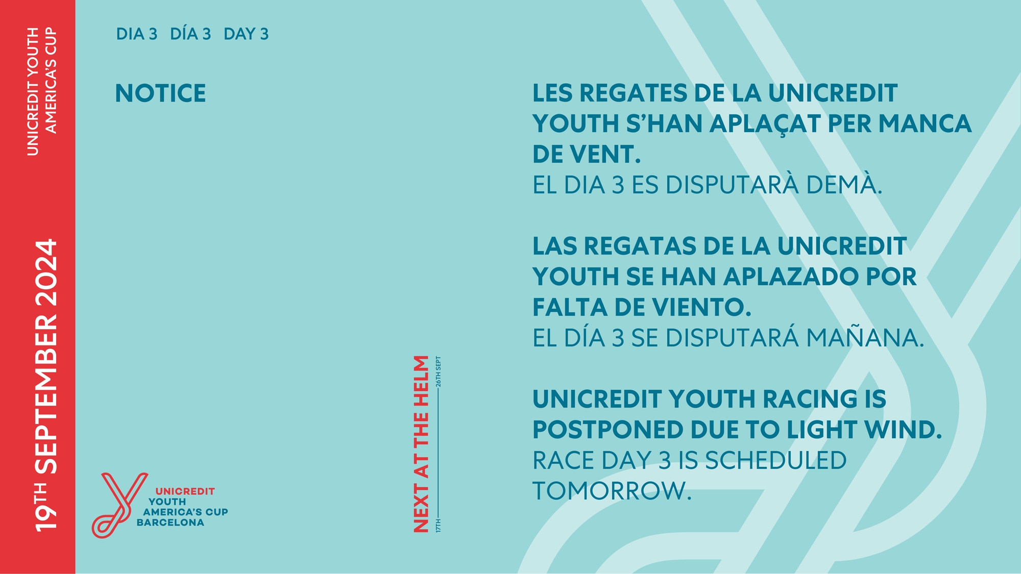 All eyes are on the weather and with the UniCredit Youth America’s Cup regatta being postponed due to light winds this morning in Barcelona - the schedule will continue tomorrow afternoon for the Group B ‘Invited Teams’ racing – as the afternoon progresses, we are expecting 7-9 knots from 160-170 degrees which is officially classified as a ‘Migjorn’ from the south-south-easterly direction. Forecast models suggest a small build to 9-11 knots later in the afternoon (1600) on some models.